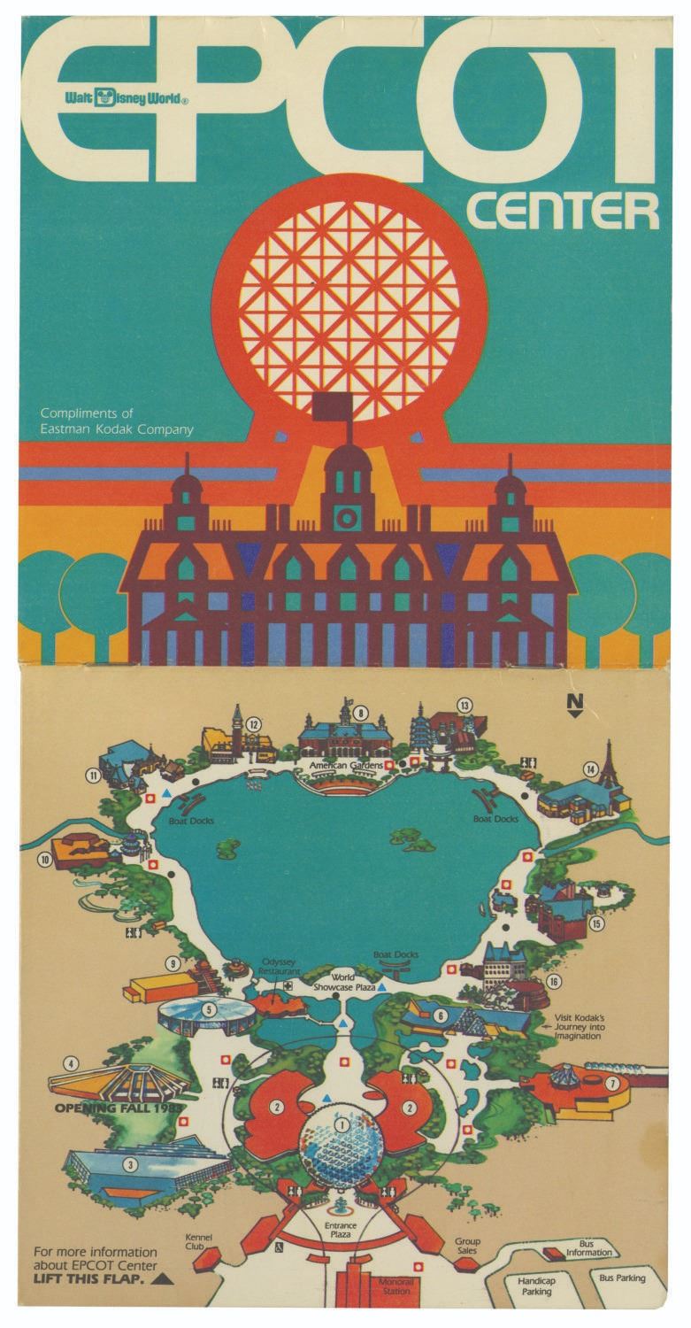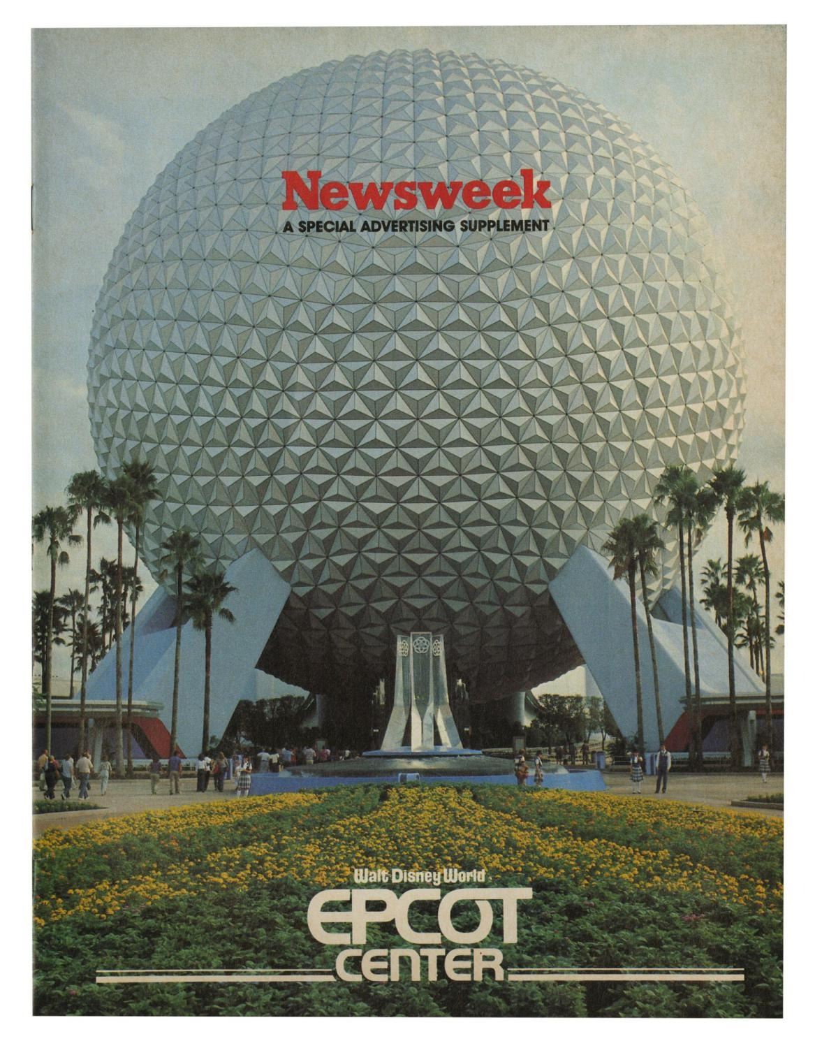 (Walt Disney World, 1982) A welcome packet from Walt Disney World with brochures and materials from the Magic Kingdom and EPCOT Center. Included are an issue of Newsweek magazine, an issue of Vacation Guide magazine, a small guide to the Magic Kingdom, and a guide to EPCOT by Kodak. The outer folder measures 9.5" x 11.75" and has some small areas of staining, wear, and discoloration from use; however, the materials inside are in very good condition.