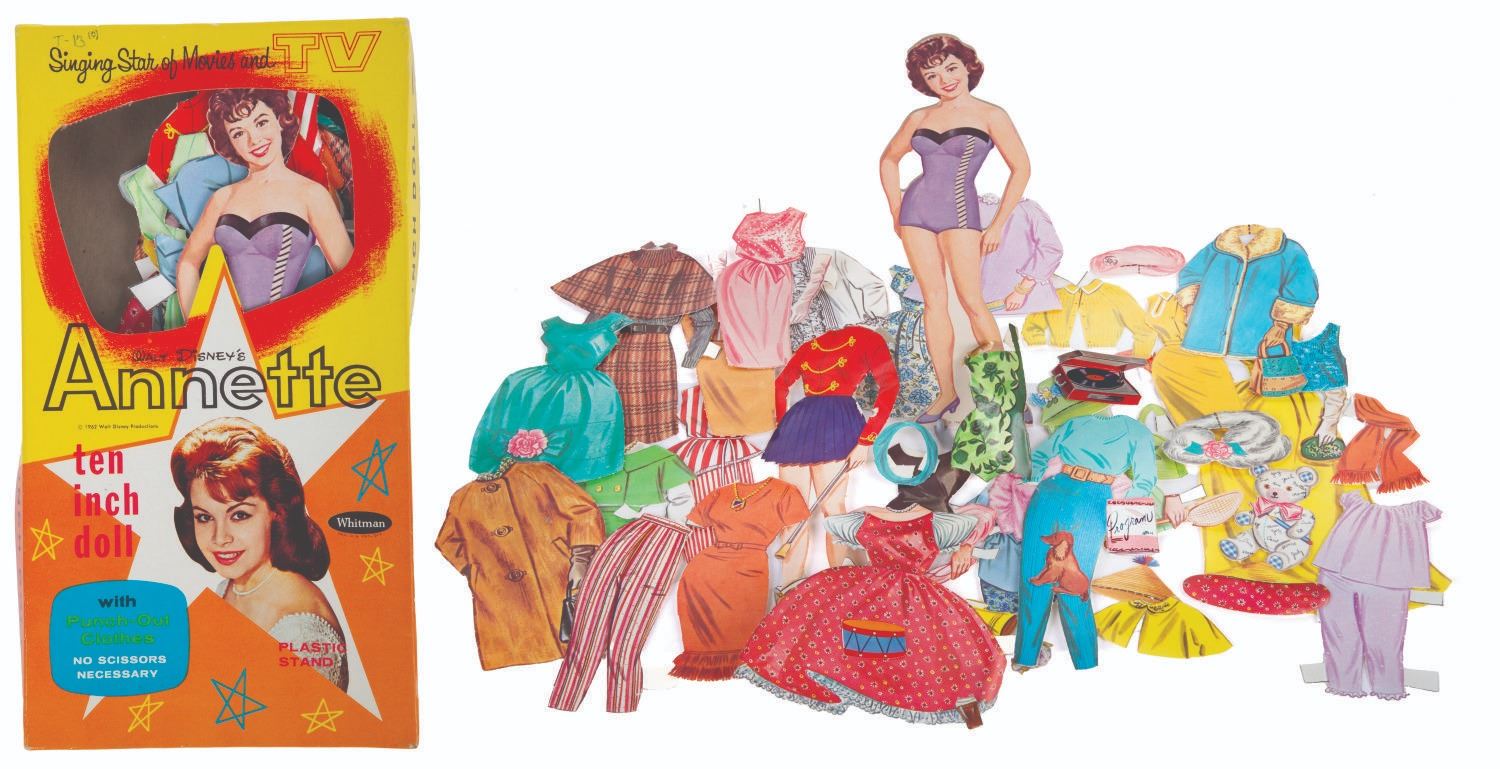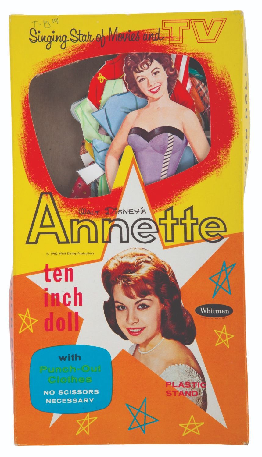 (Whitman, 1962) A Walt Disney's Annette Ten Inch Doll by Whitman featuring the likeness of original Mousekeeter Annette Funicello. The doll comes with its stand, punched-out clothes, and the 6.25" x 11.5" x 1" original box. The pieces are in good-to-very-good condition with minor creases and wear from handling. The box is in very good condition with writing on the lid and exhibiting light wear.