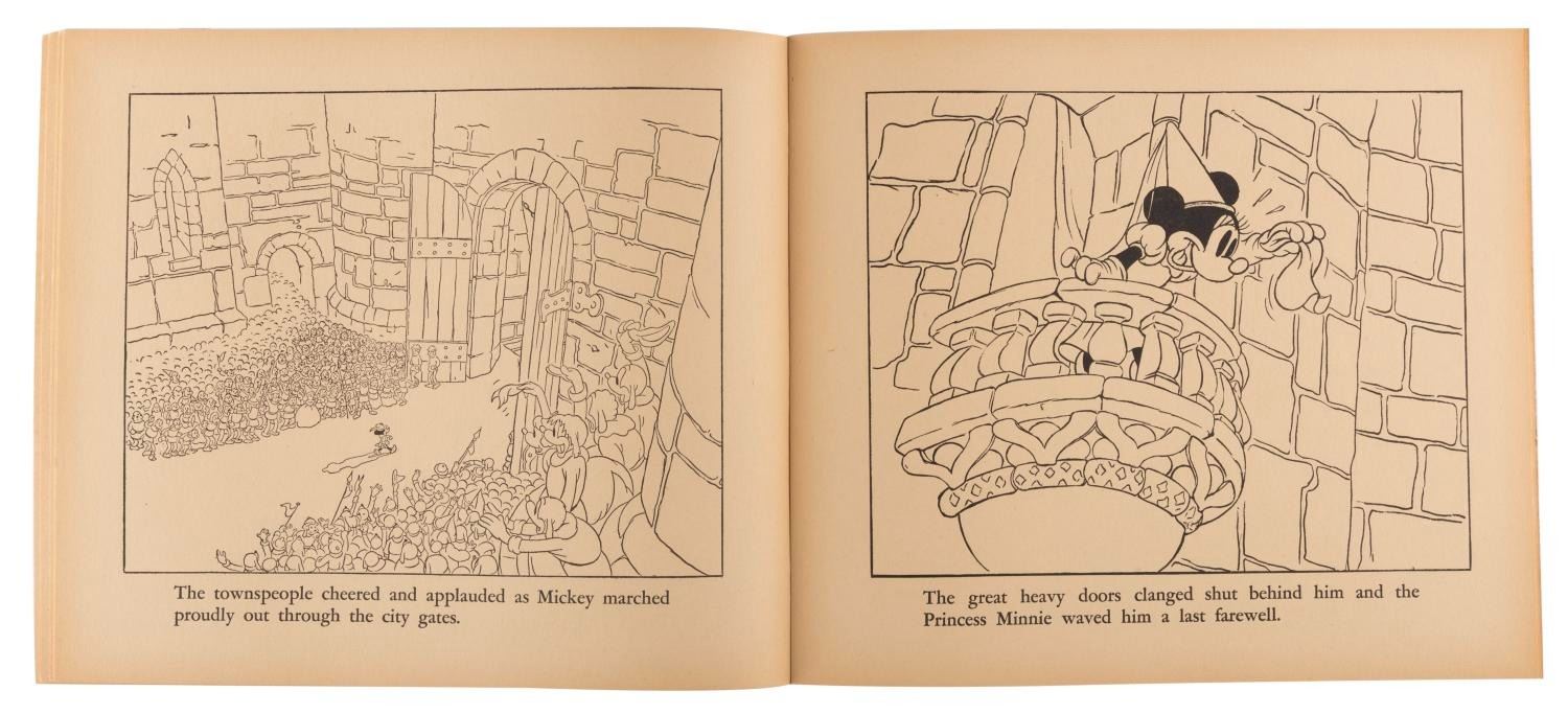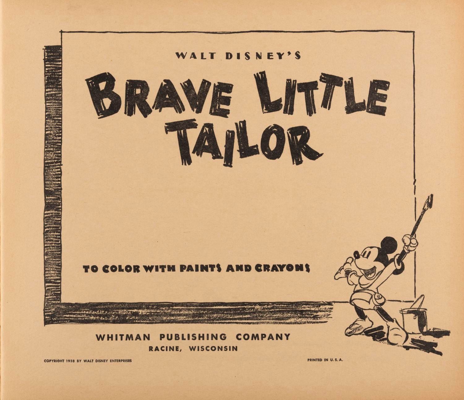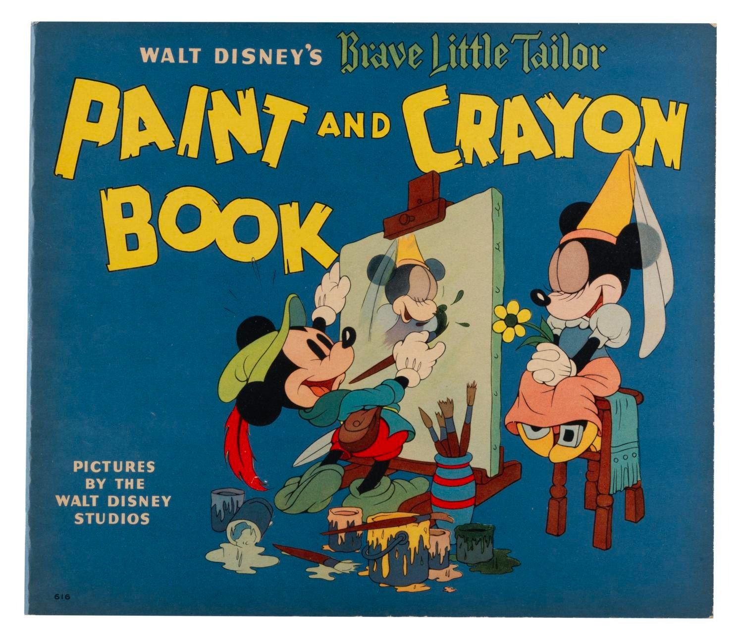 (Whitman, 1938) A Walt Disney's Brave Little Tailor Paint and Crayon Book with pictures by the Walt Disney Studios. Measuring 10.75" x 12.5", the book is in very good condition with light handling wear, pages light brown from age, and no coloring inside.