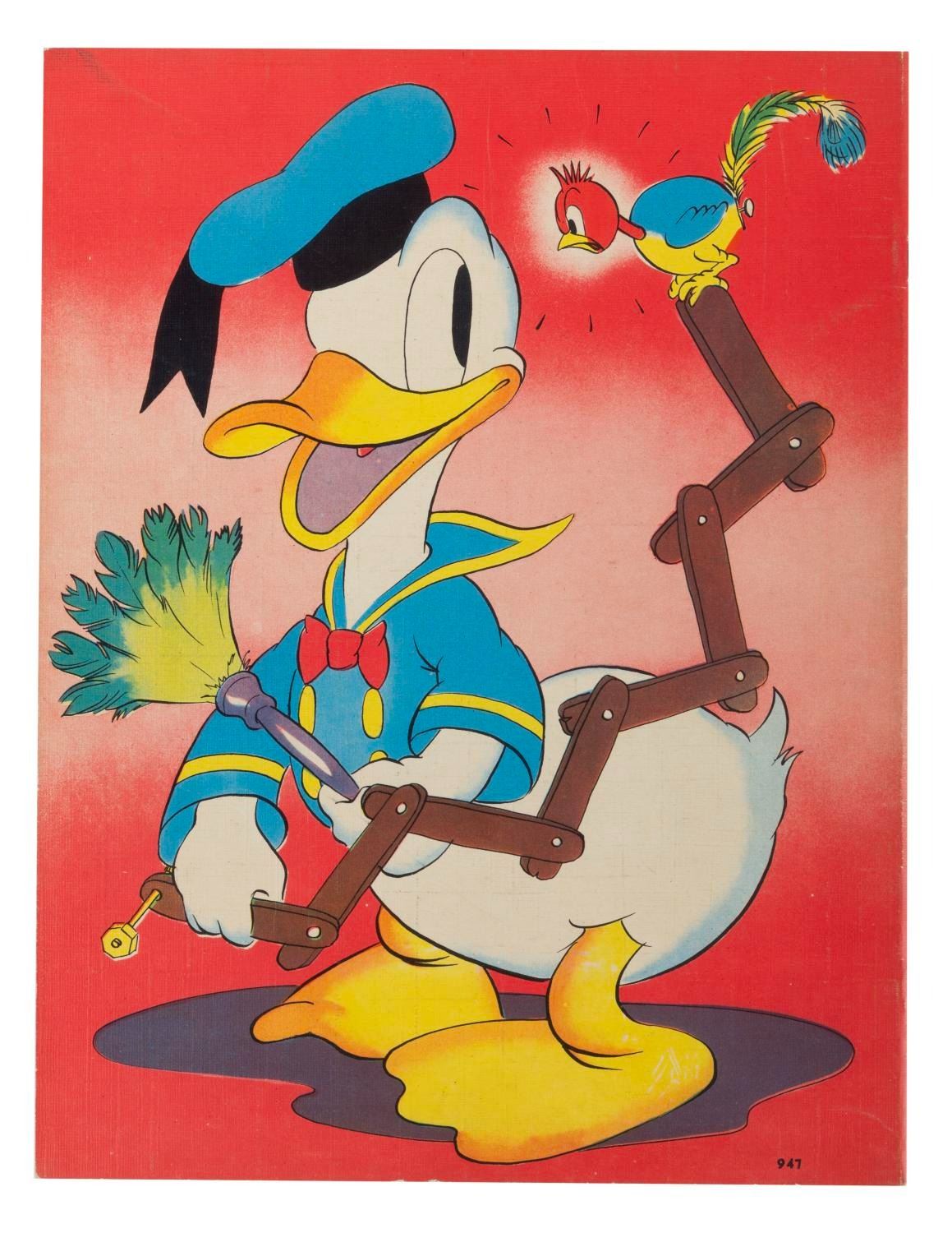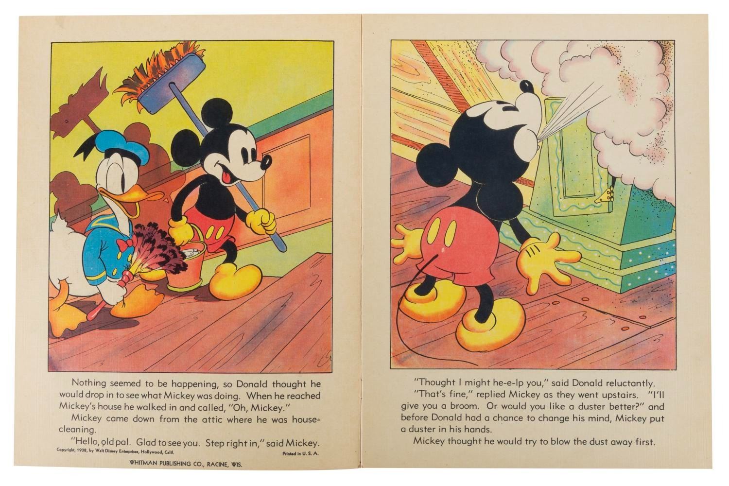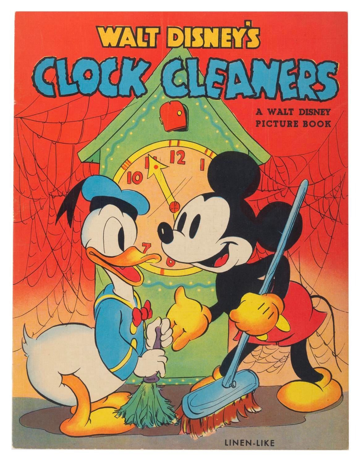 (Whitman, 1938) A linen-like picture book titled Walt Disney’s Clock Cleaners, published by Whitman and featuring Mickey and Donald attempting a risky cleaning. Measuring 9.25" x 12.25", the ten-page book is in very good condition with light edge wear, soiling, and creasing.