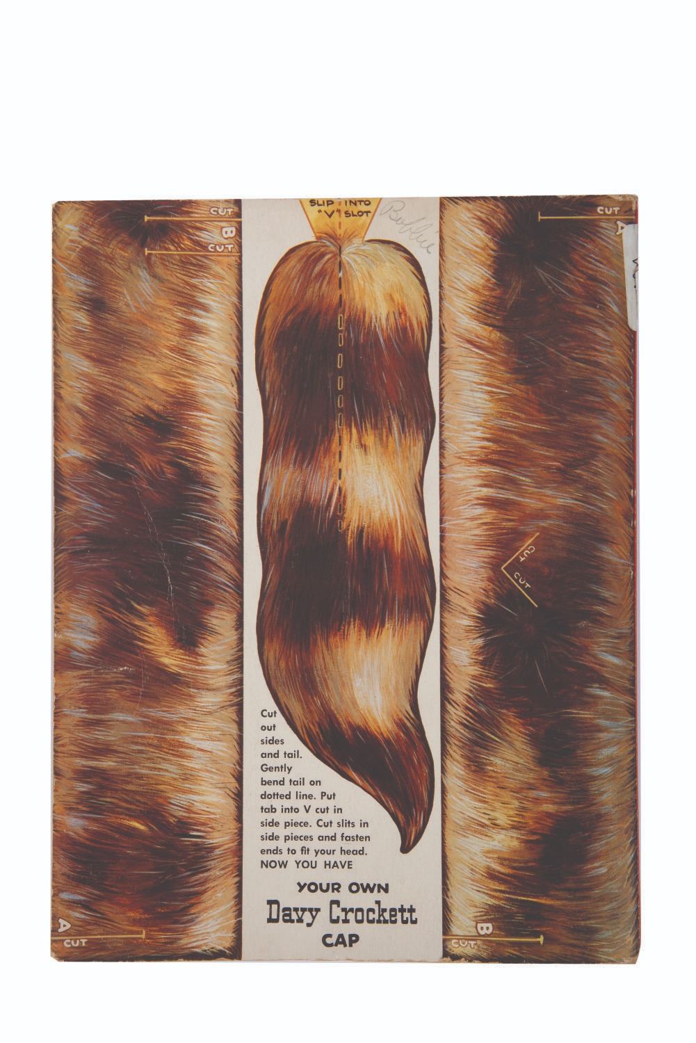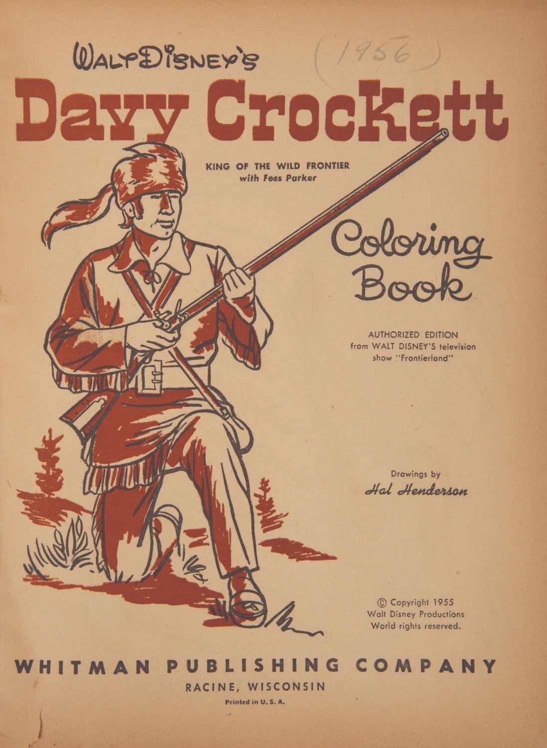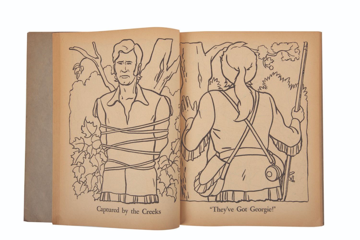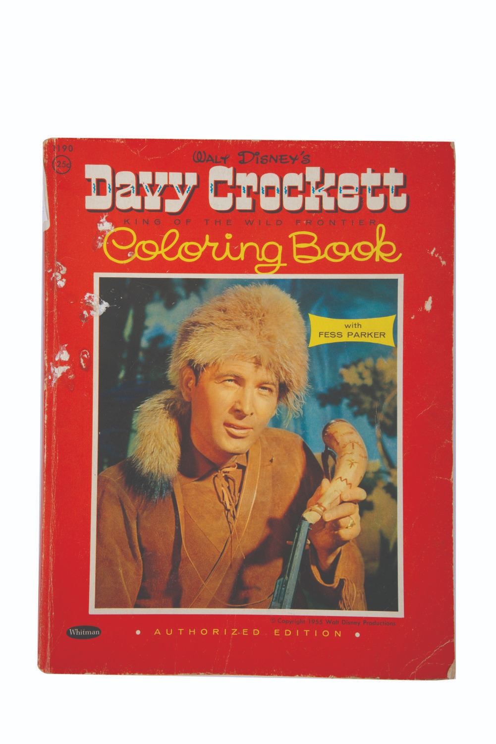 (Whitman, 1955) A Walt Disney’s Davy Crockett coloring book. This example includes the full cut-out coonskin cap intact on the back cover. Measuring 8.5" x 11", the book is in good condition, with several pages colored, light wear from age, and some white spotting to the cover.