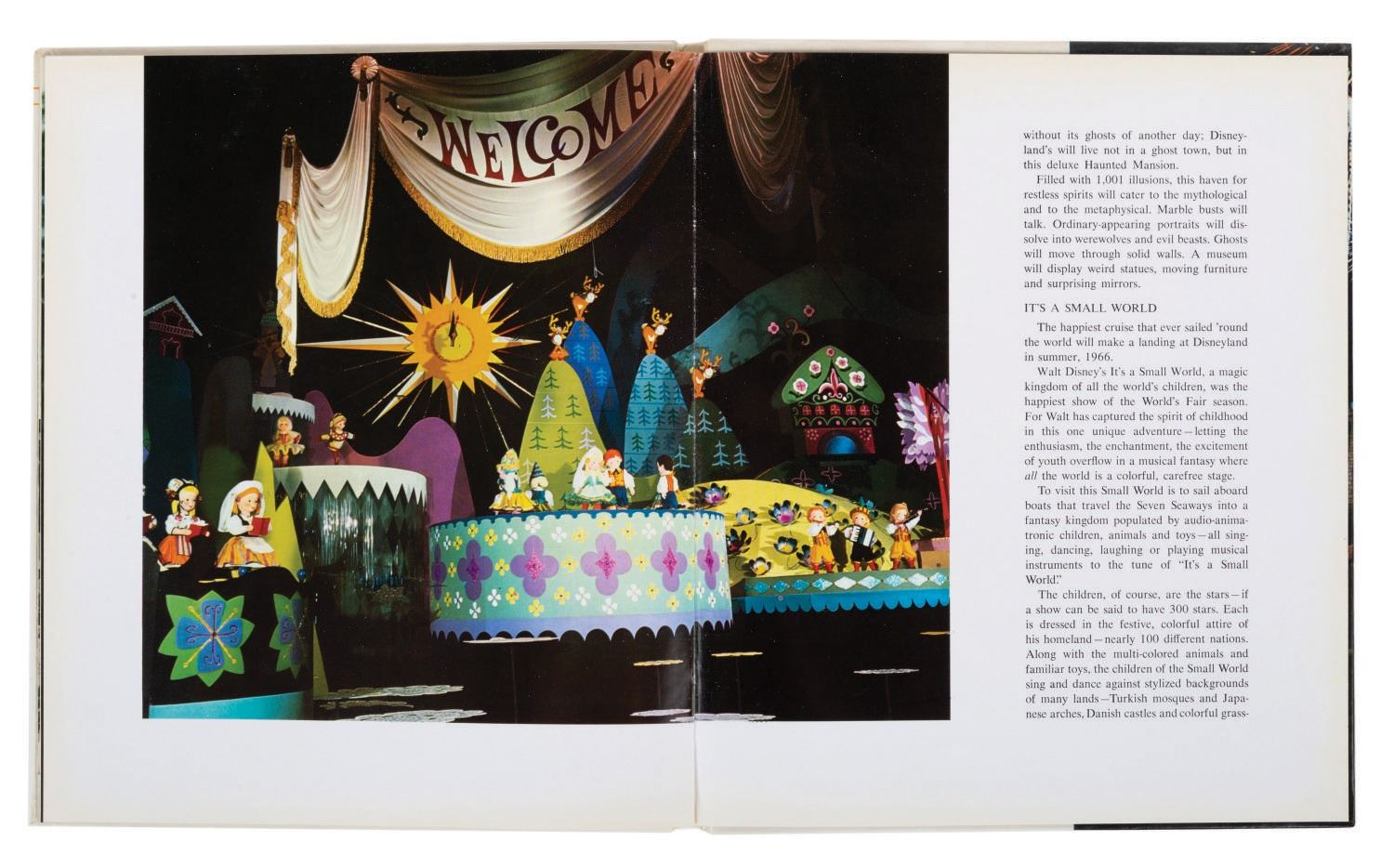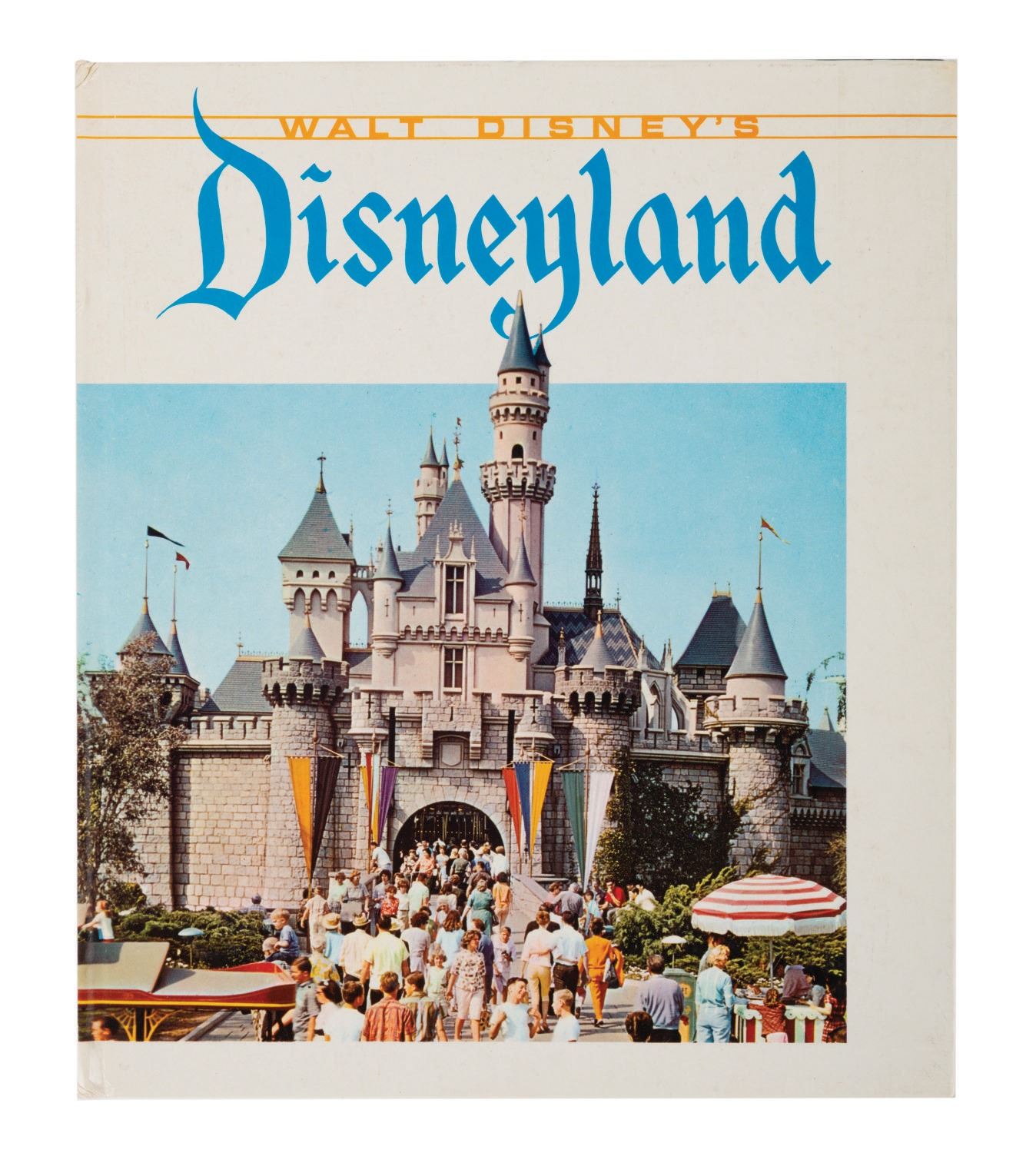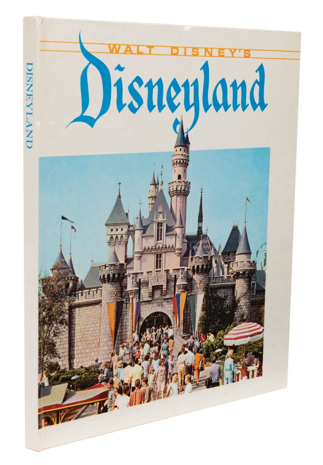 (Disneyland, 1965) A hardcover Disneyland souvenir book by Imagineer Marty Sklar featuring early photos and information on the Park. Measuring 11.25"x9.5", the book is in good condition with slight discoloration to the page edges from age.
