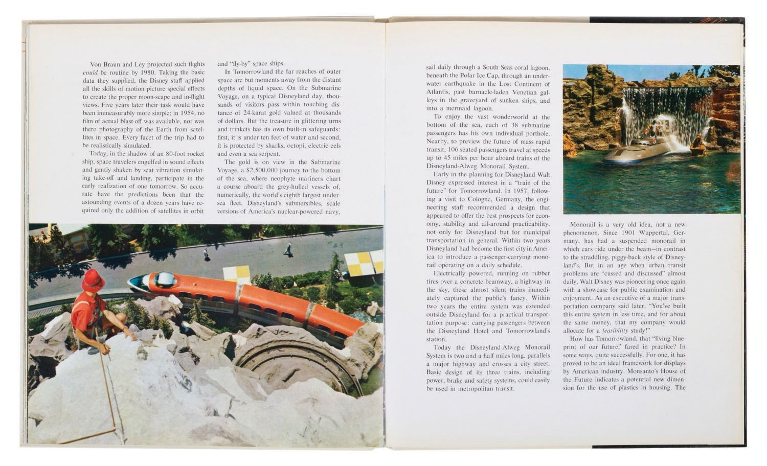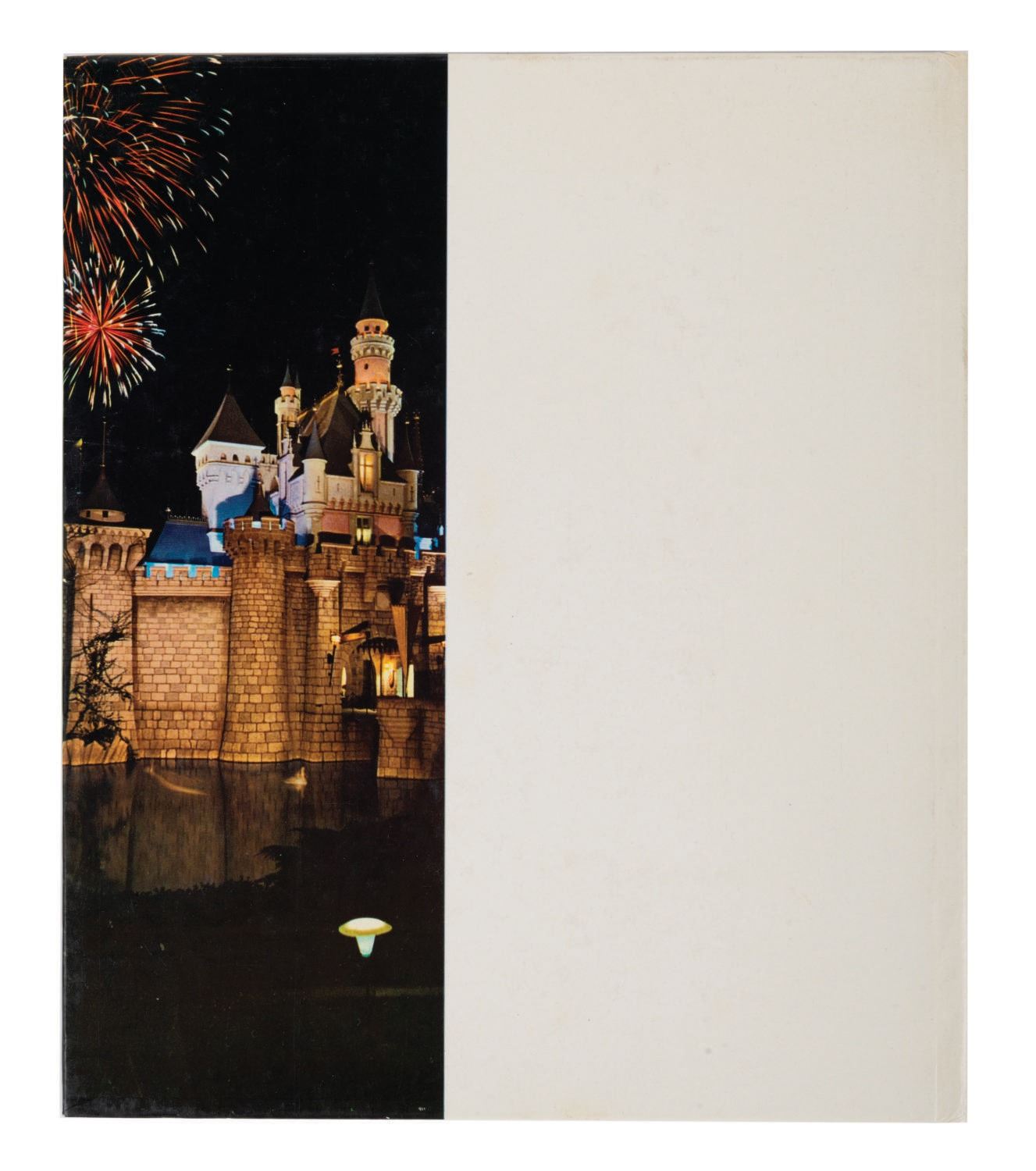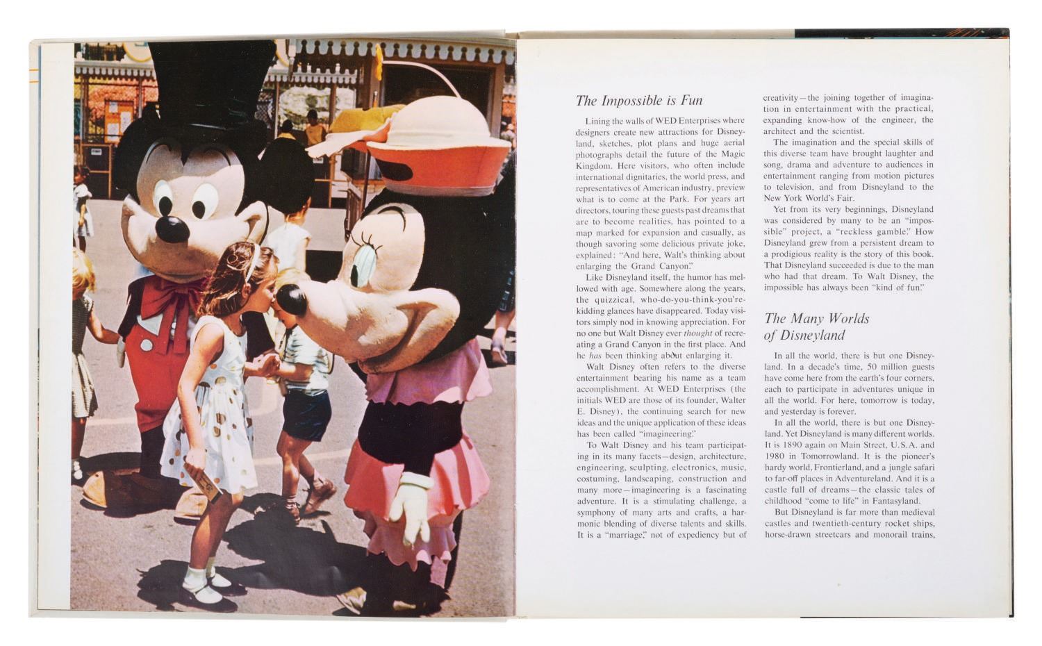 (Disneyland, 1965) A hardcover Disneyland souvenir book by Imagineer Marty Sklar featuring early photos and information on the Park. Measuring 11.25"x9.5", the book is in good condition with slight discoloration to the page edges from age.