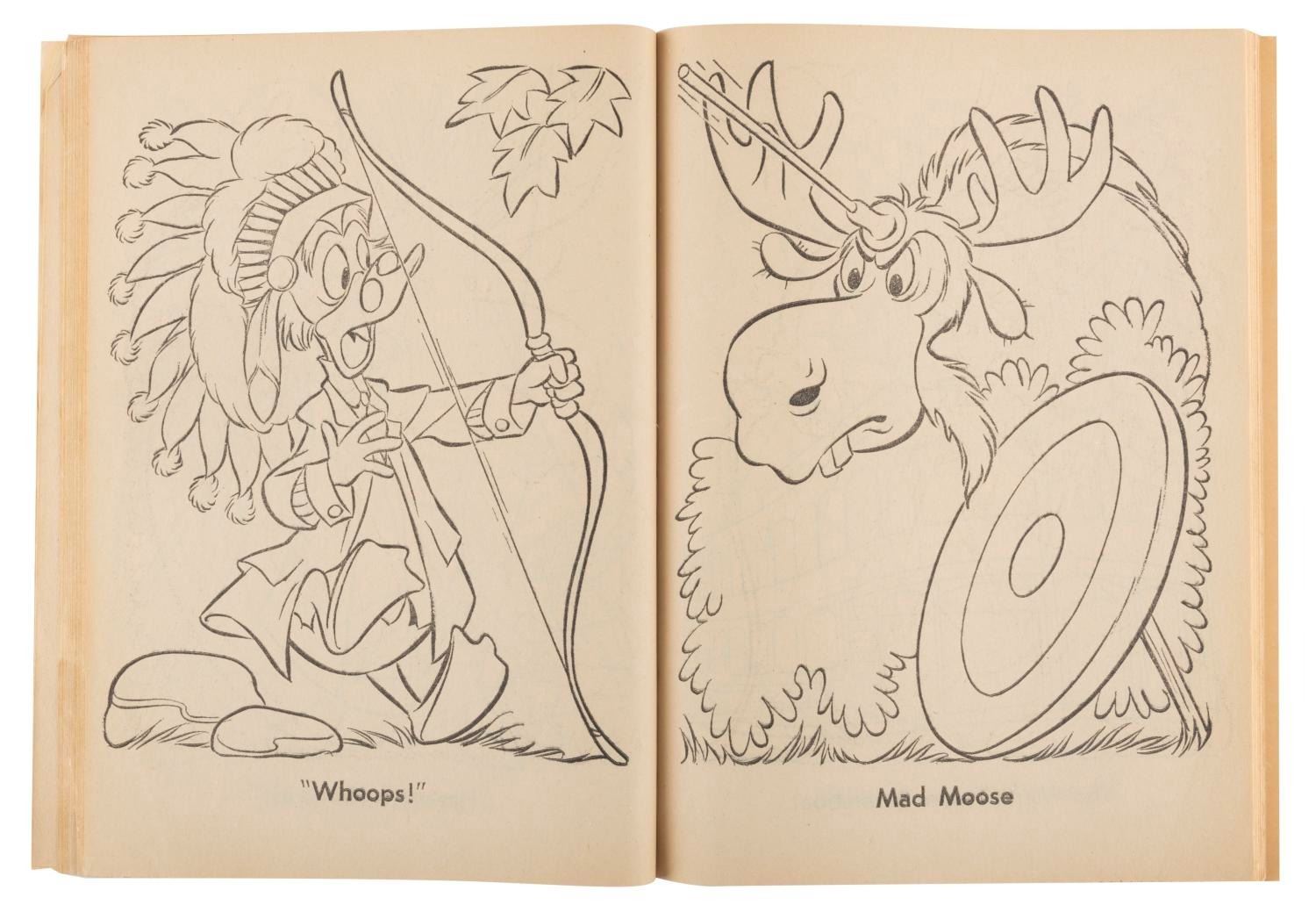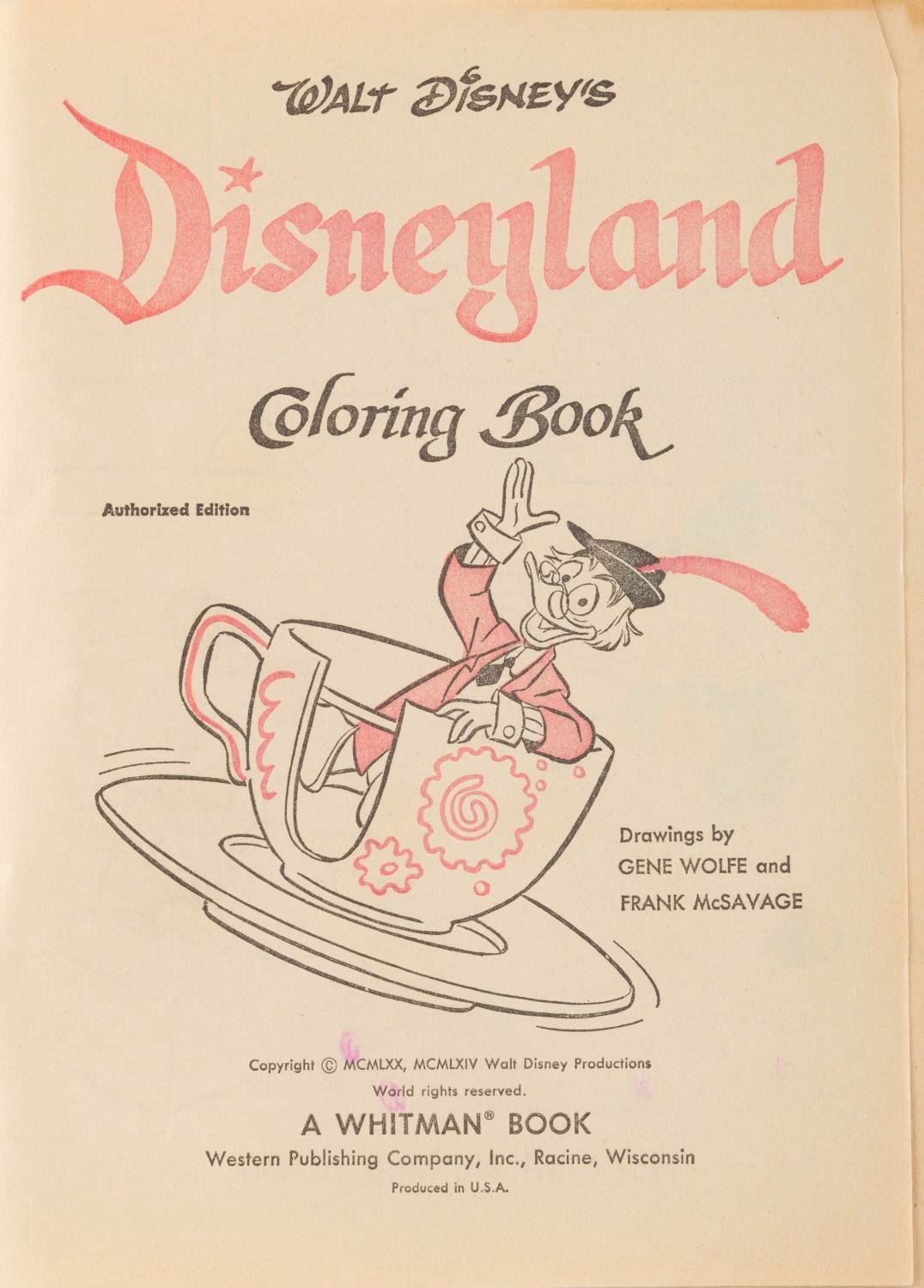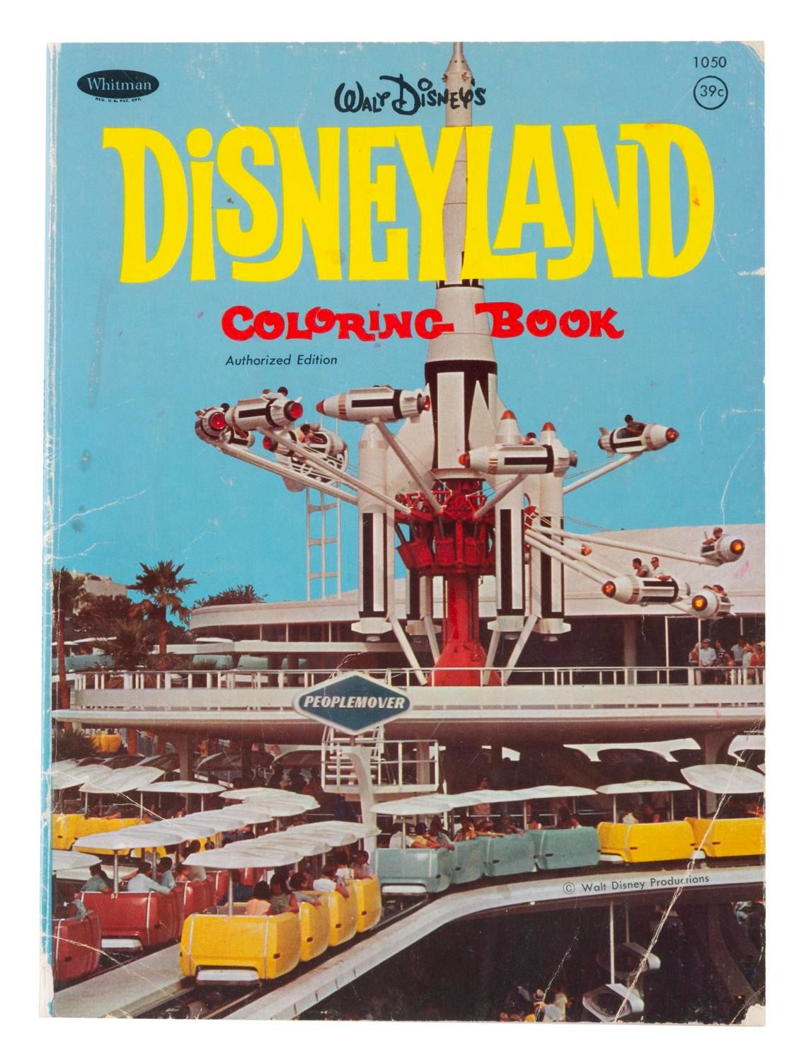 (Whitman, 1967) A Disneyland Coloring Book with a cover featuring the Peoplemover. The coloring book is in fair condition, with several pages partially colored, creases, and wear to the cover, including chipping, a tear, creases, and a 3" split to the spine.