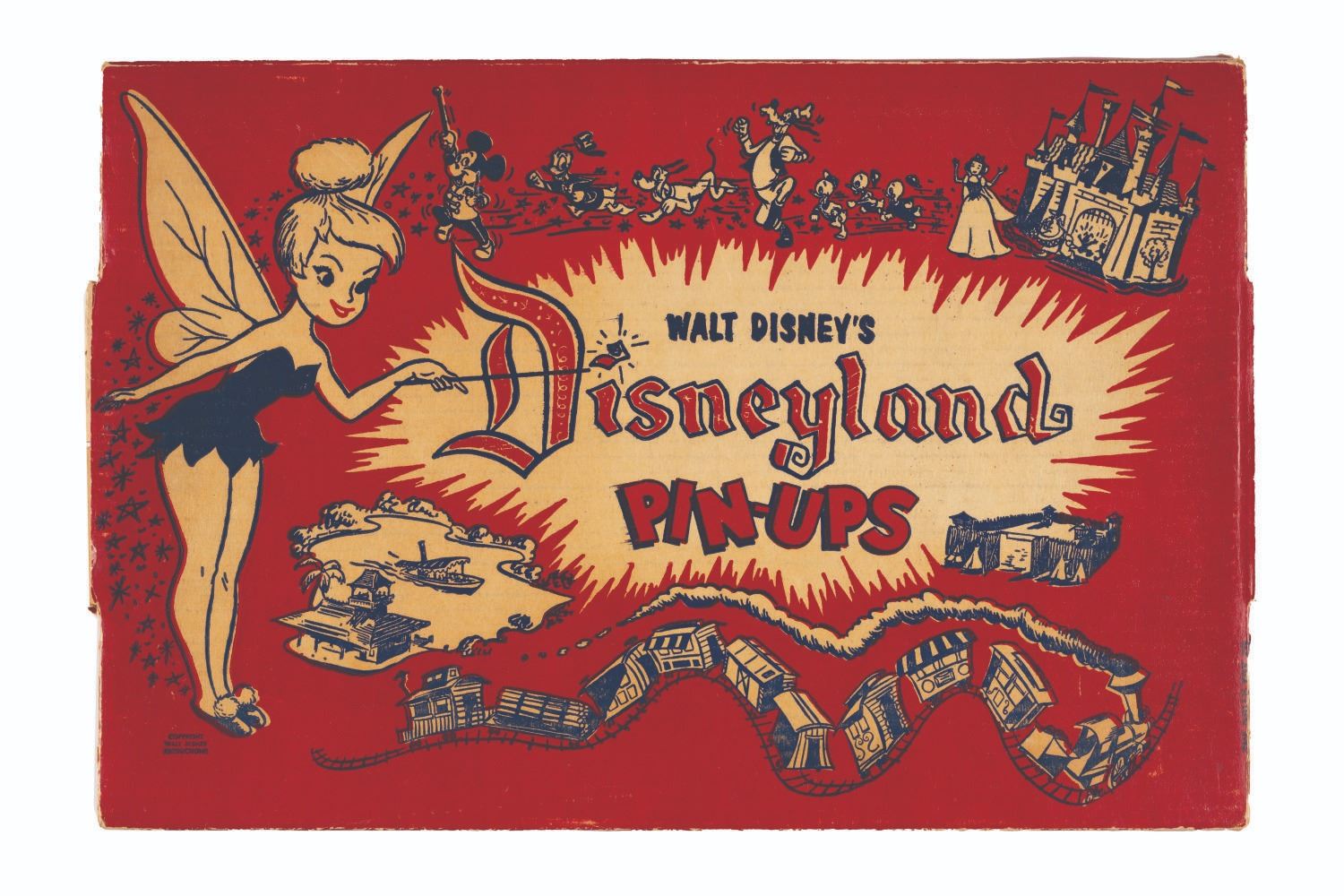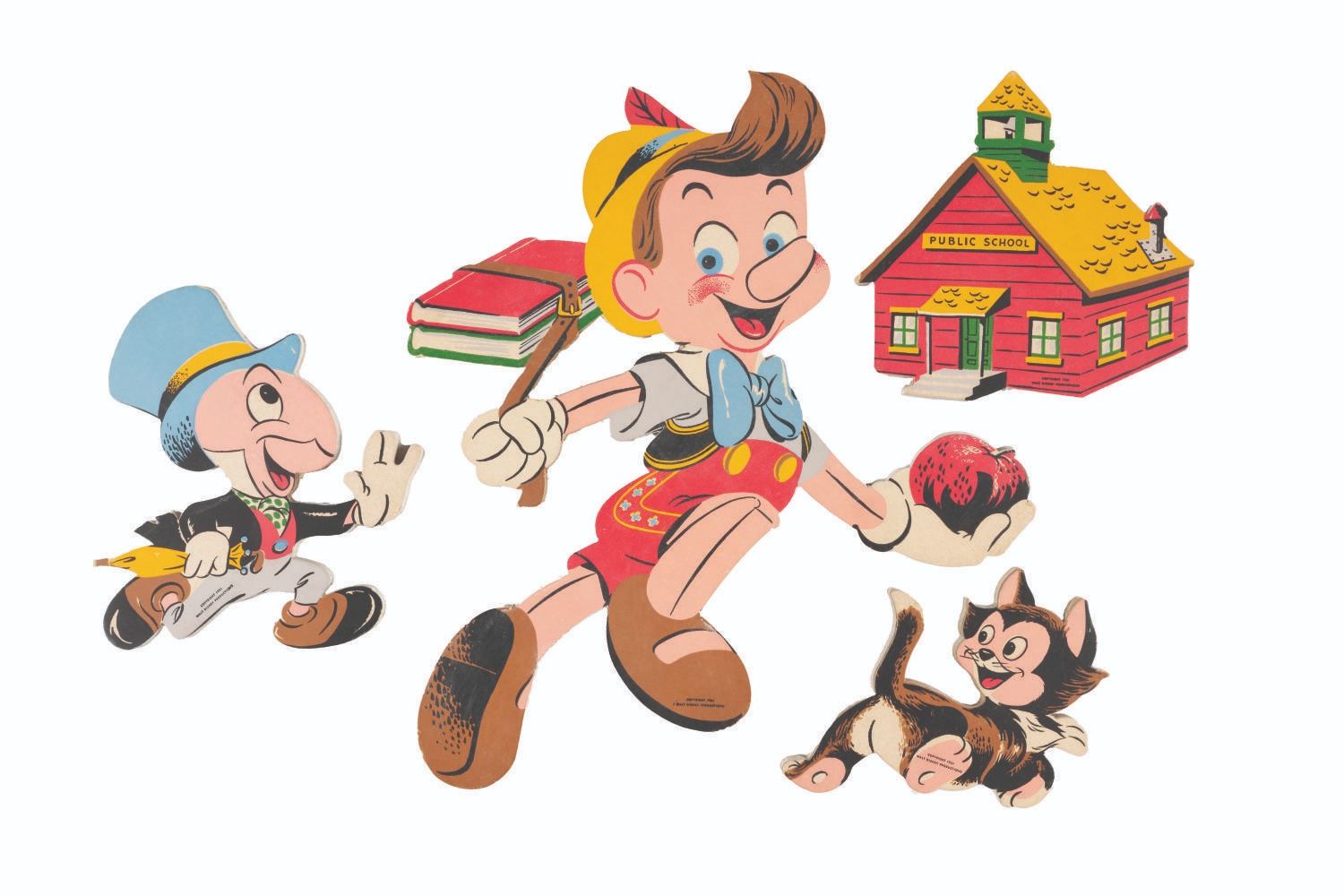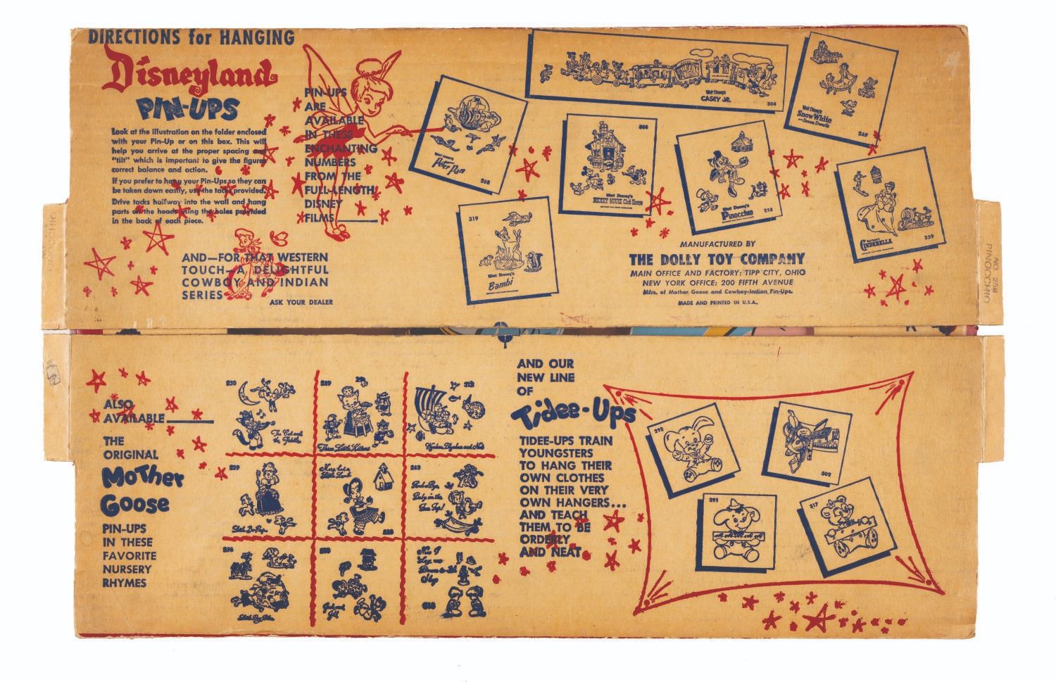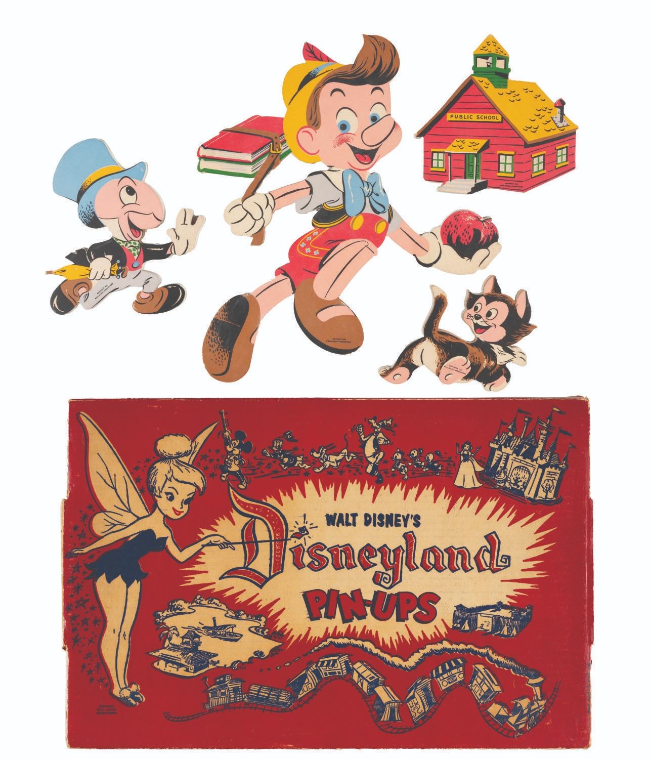 (Dolly Toy Company, 1958-60s) A Walt Disney’s Disneyland Pin-Ups set featuring colorful wall decorations of characters from "Pinocchio," including Jiminy Cricket, Figaro, Pinocchio, and a schoolhouse. The four pin-ups measure from 6" to 13.25" long within the original 18" x 12.5" box, and are in very good, unused condition with soiling and scuffing from age and storage. The box is in good condition with creasing, discoloration, spots of paper loss, and small tears.