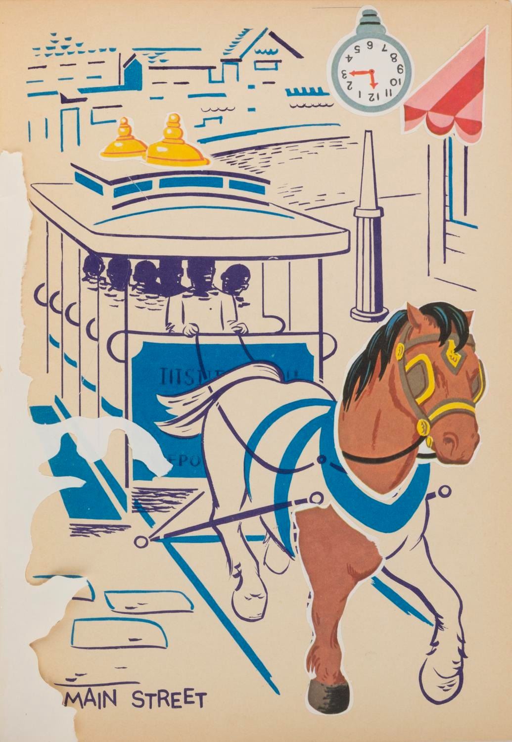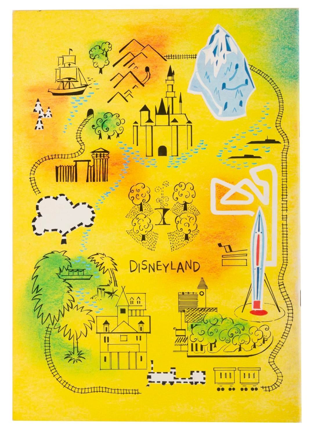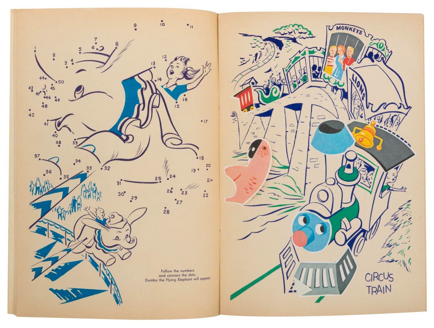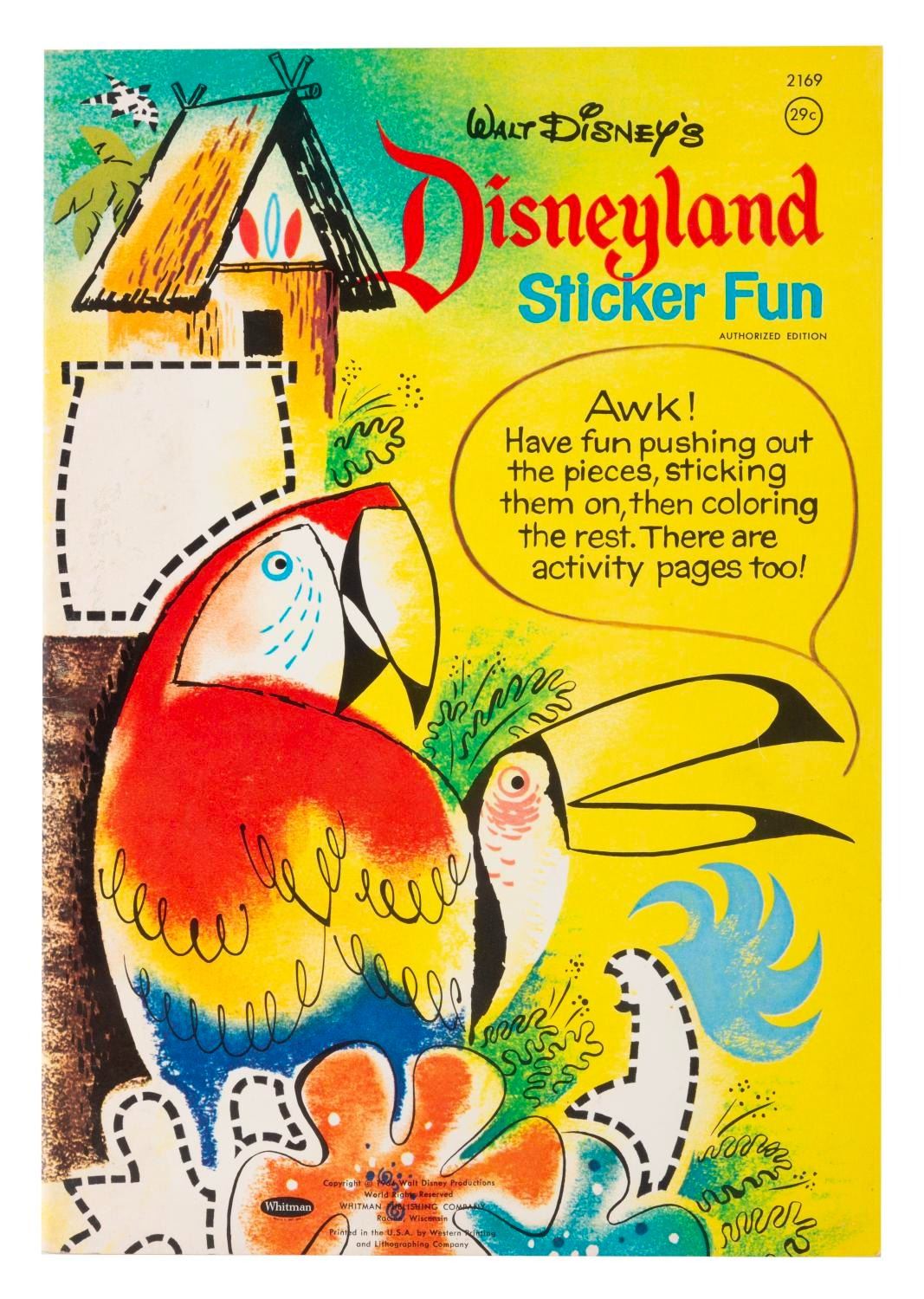 (Whitman, 1964) A Walt Disney’s Disneyland Sticker Fun book with an Adventureland-themed cover, published by Whitman. The book includes 16 pages of activities, with the stickers punched out and applied throughout. Four stickers for the outside cover are missing, and two more are loose inside. Measuring 8.5" x 12", the book displays in very good condition.