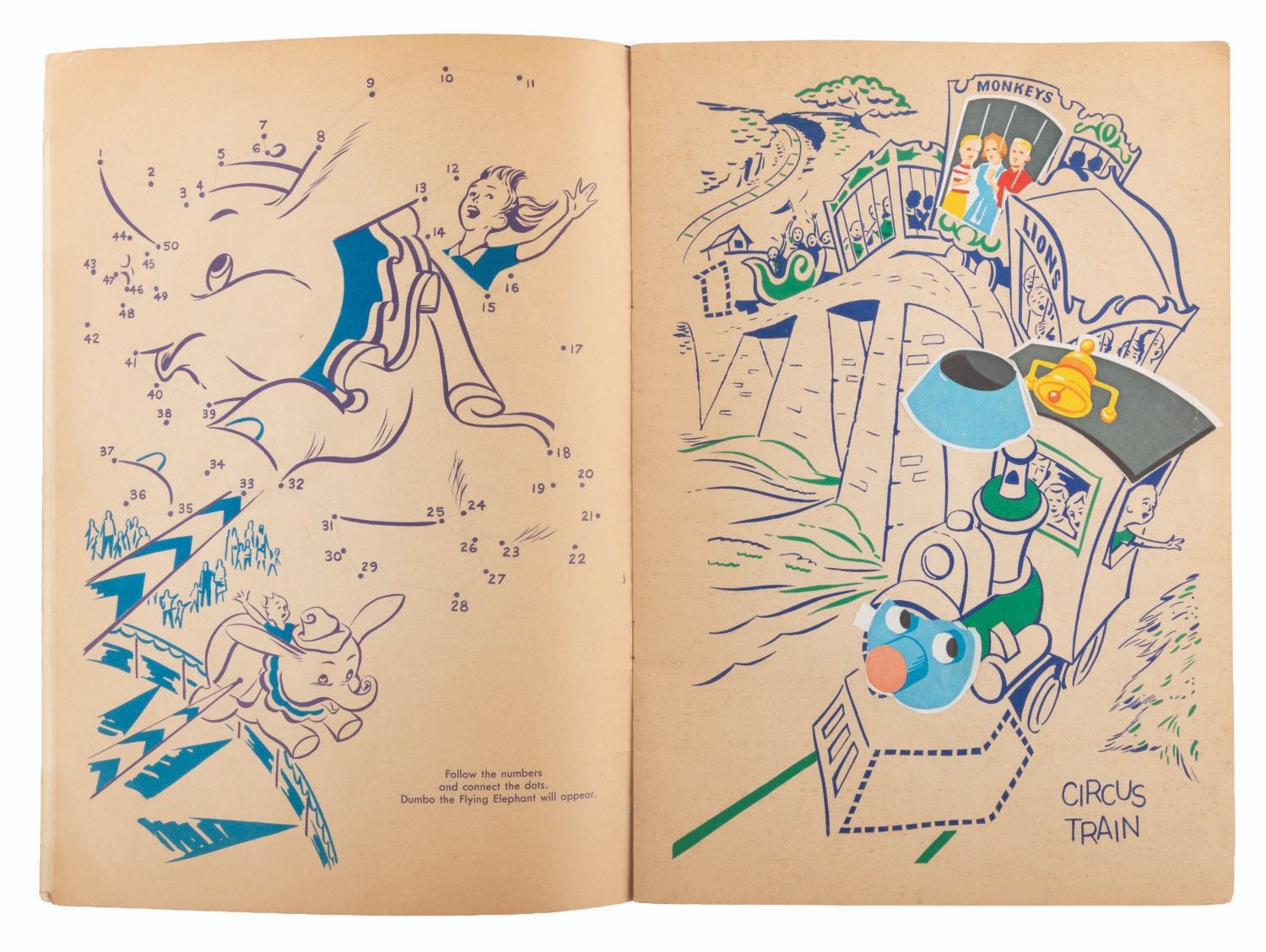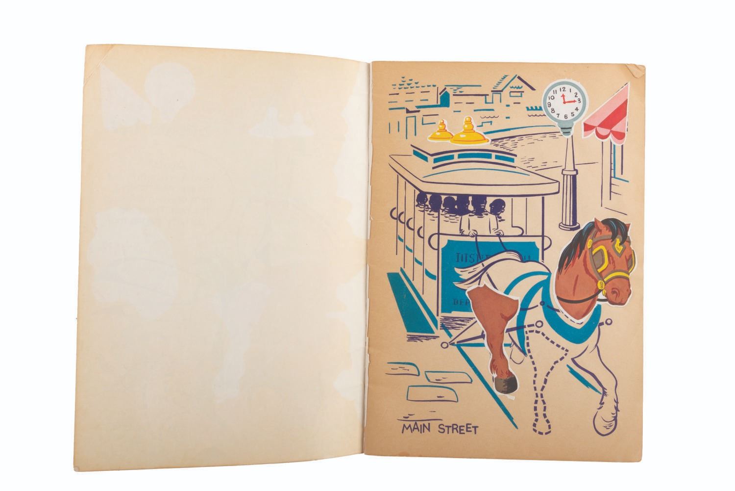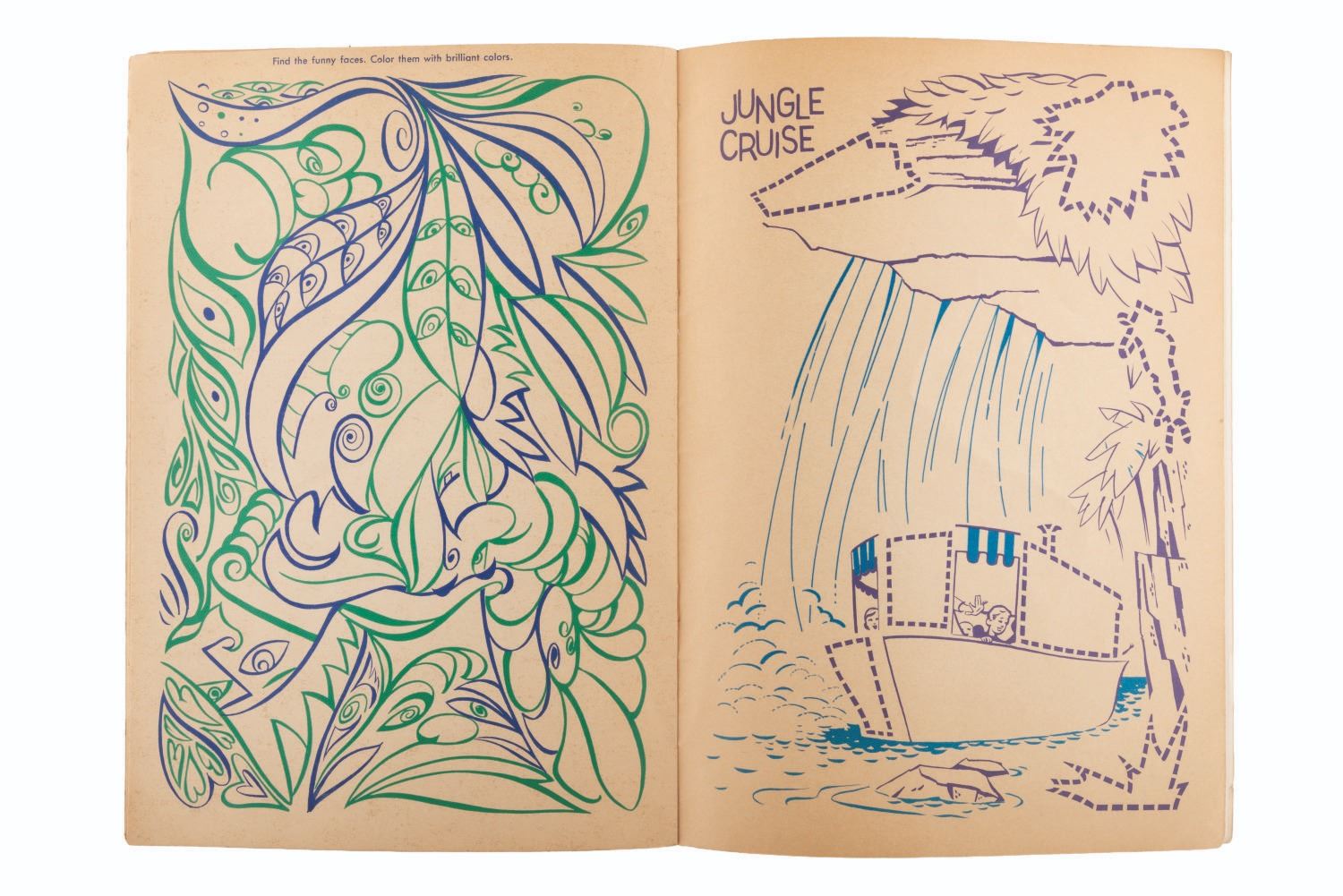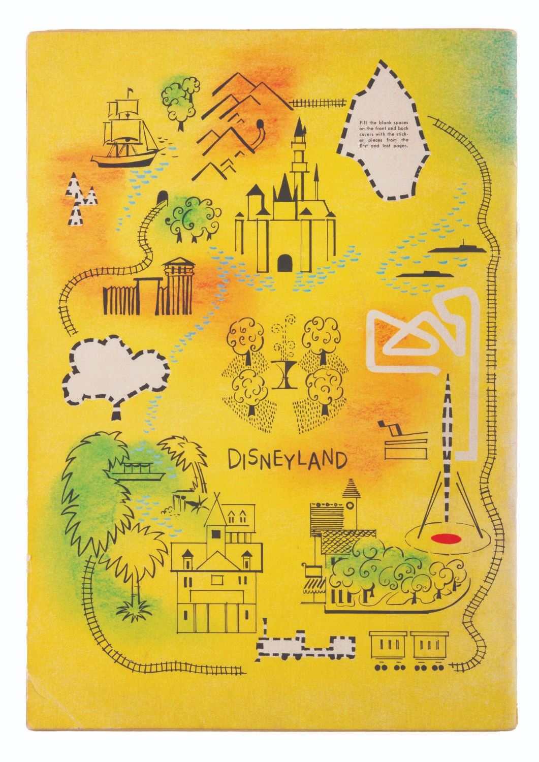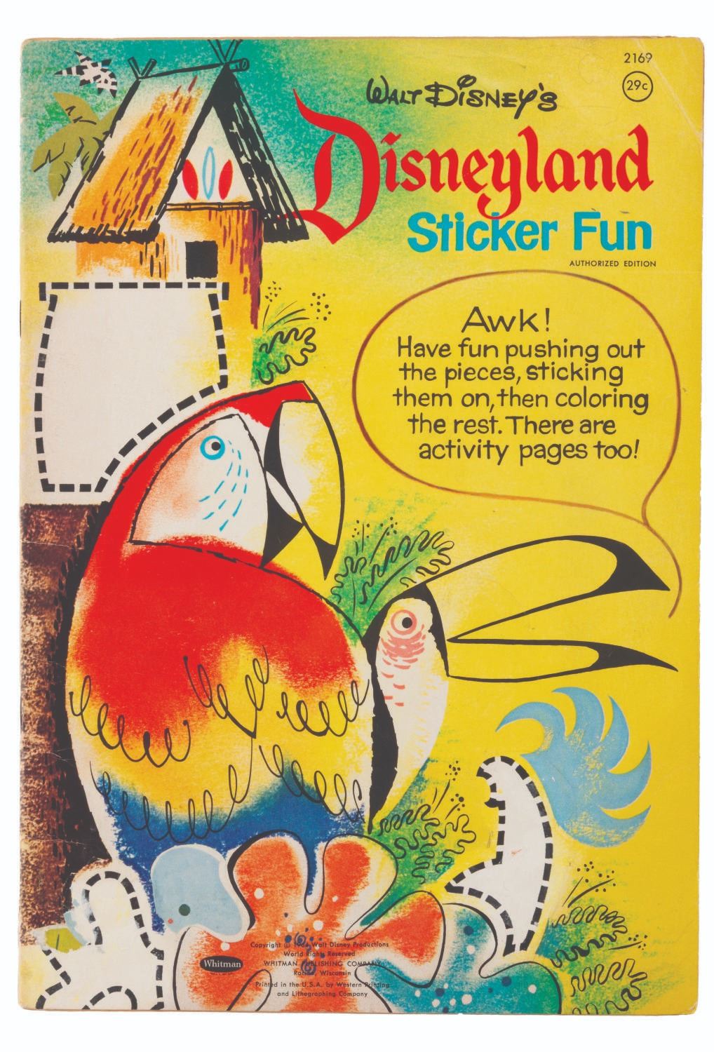 (Whitman, 1964) A Walt Disney’s Disneyland Sticker Fun book with an Adventureland-themed cover, published by Whitman. The book includes 16 pages of activities, with almost two full pages of stickers punched out and applied inside. Measuring 8.5" x 12", the book is in good condition with corner folds, creases, adhesive residue, and wear from use.