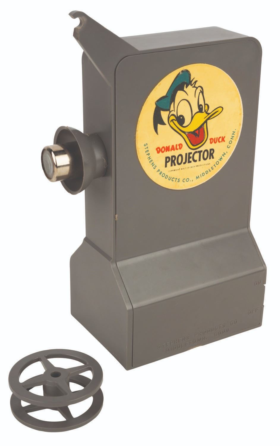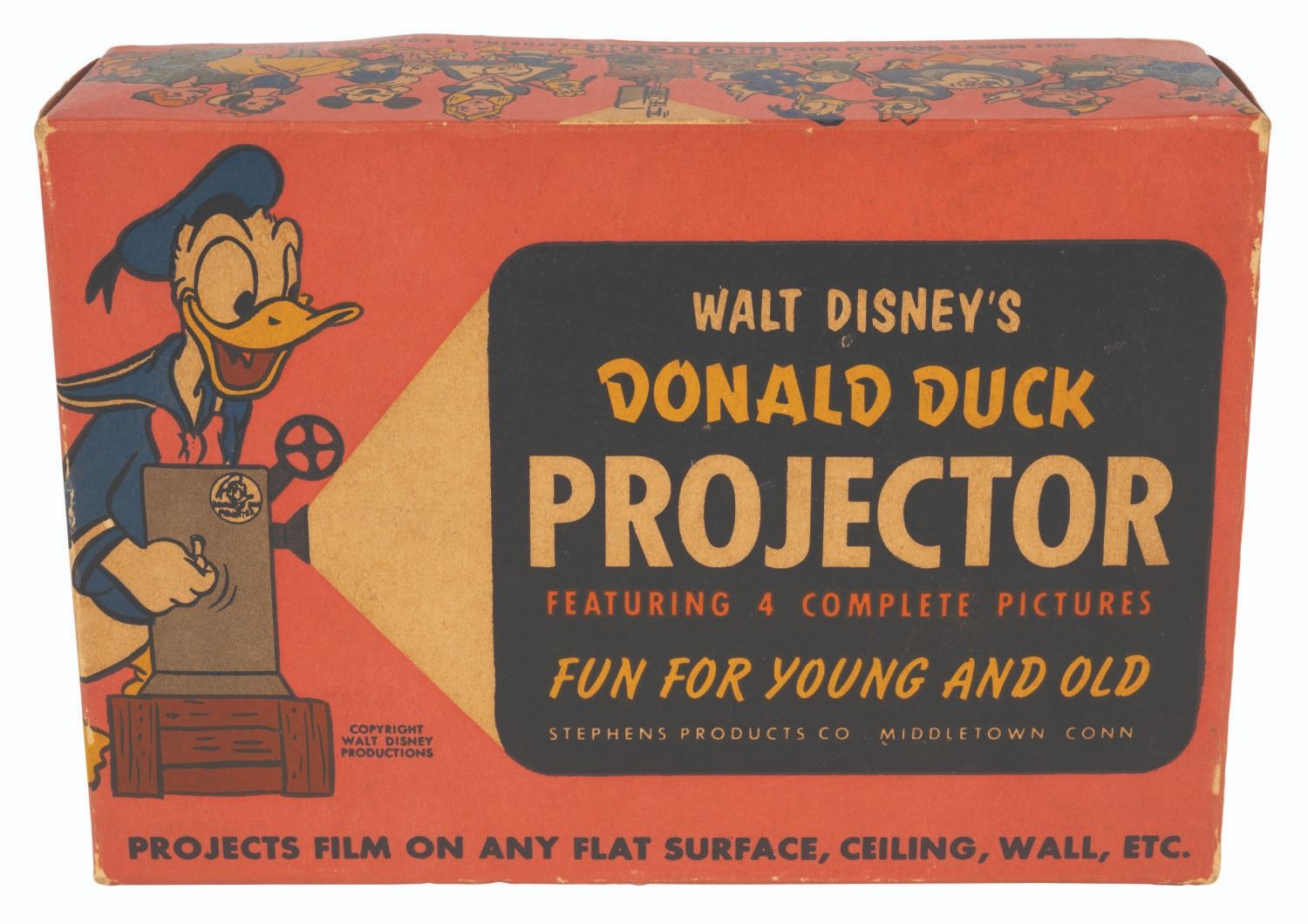 (Stephen’s Products, 1950) A "Walt Disney’s Donald Duck Auto-Magic Projector" by Stephens Products. The toy comes with a projector, a reel, instructions, Auto Magic Film form, and its original box featuring Disney characters. The projector measures 7.75"x2.5"x3.5" and the box measures 6.5"x9.25"x2.75". The projector is in very good condition with a .5" crack and missing plastic to the reel holder and expected fading from age. The box is in very good condition, exhibiting a few creases and light wear.