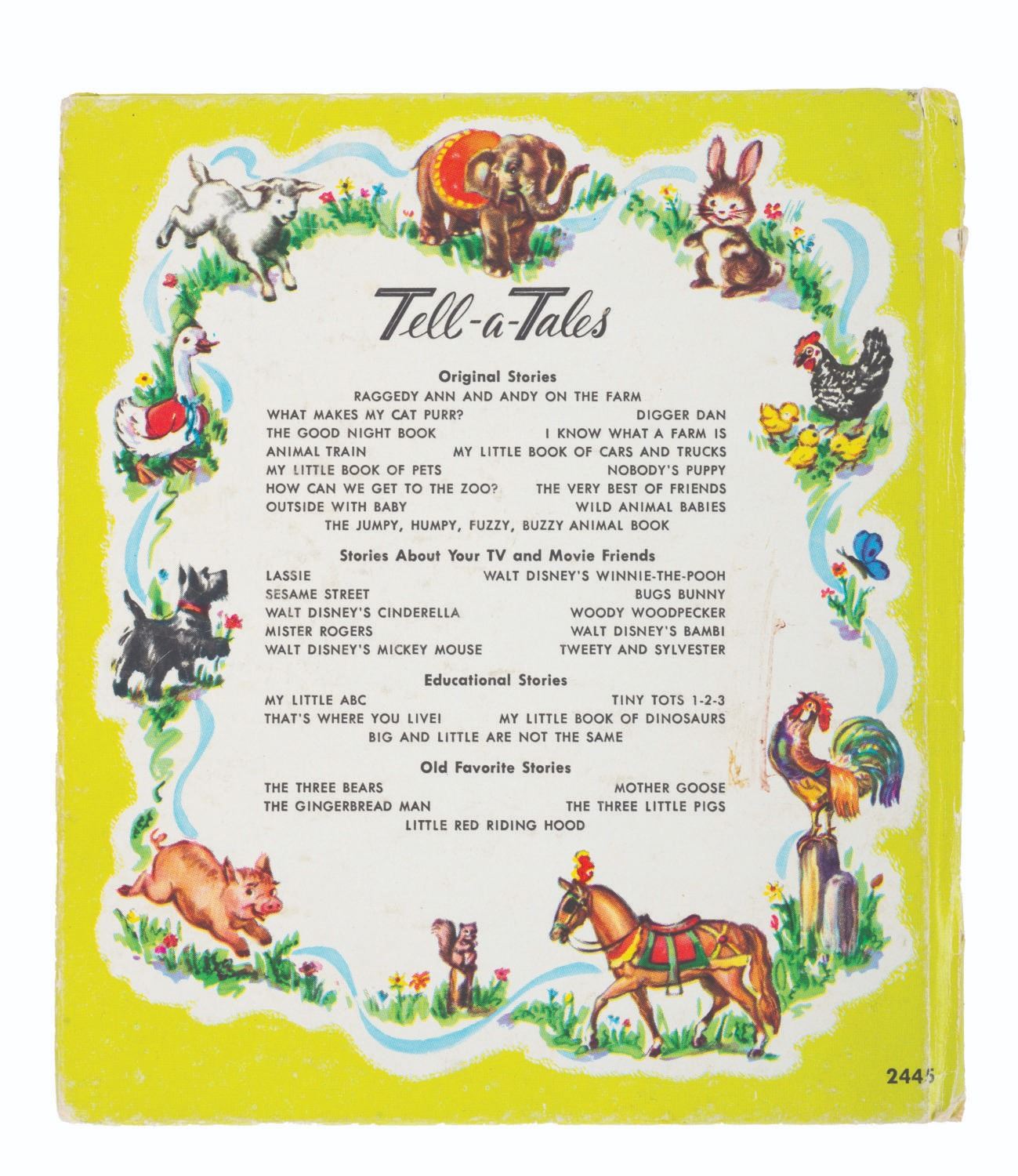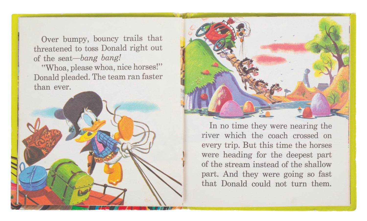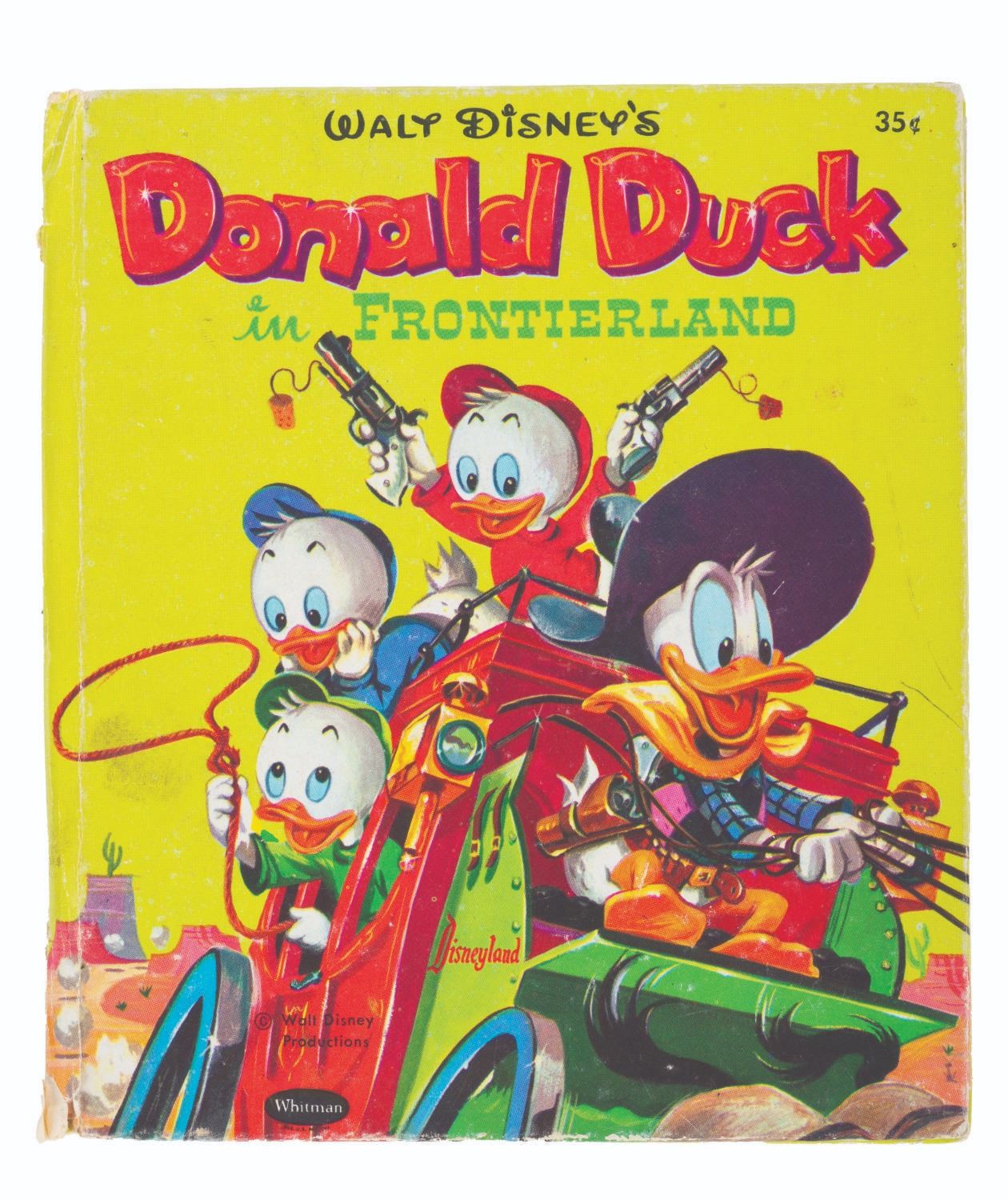 (Whitman, 1957) A Walt Disney's Donald Duck in Frontierland book with pictures by the Walt Disney Studio. Measuring 6.5" x 5.5", the hardcover Tell-A-Tale book is in good condition, with a few pages loosened from the binding.