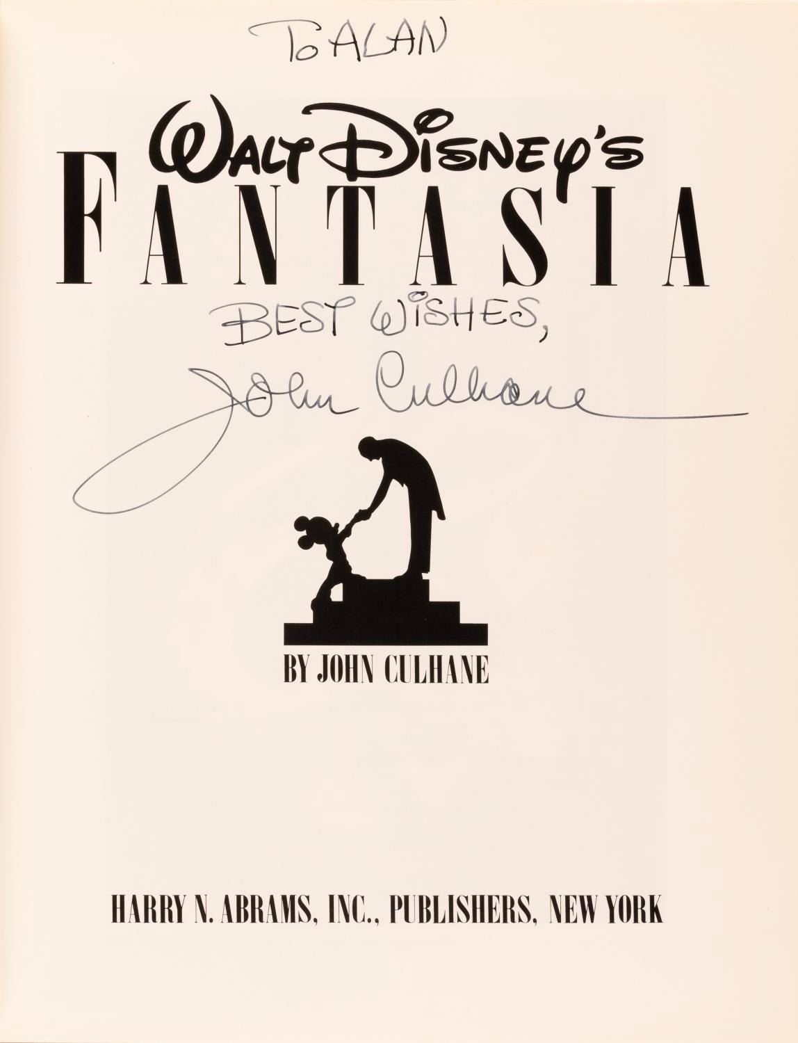 (Abrams, 1983) A Walt Disney’s "Fantasia" book signed in marker on the title page, with an inscription by the author, John Culhane. Measuring 9.5” x 12”, the 222-page hardcover book is in good condition with heavy scratches on the front and back covers.