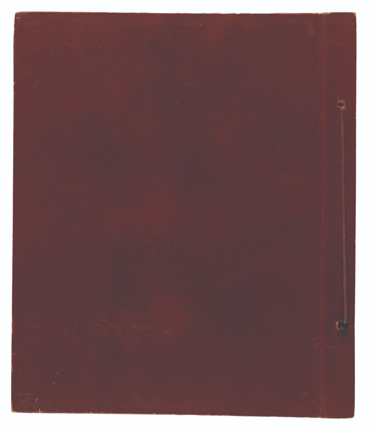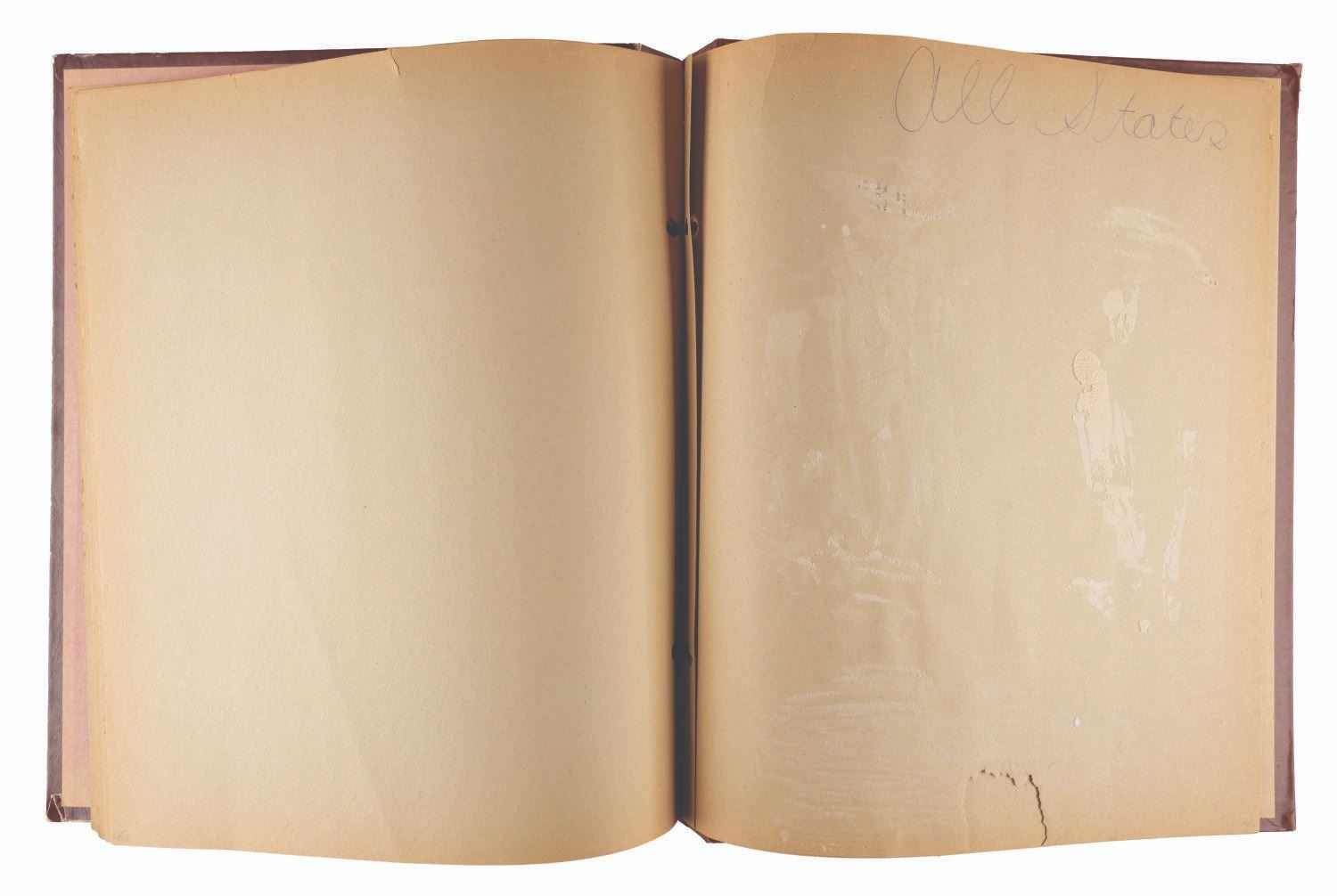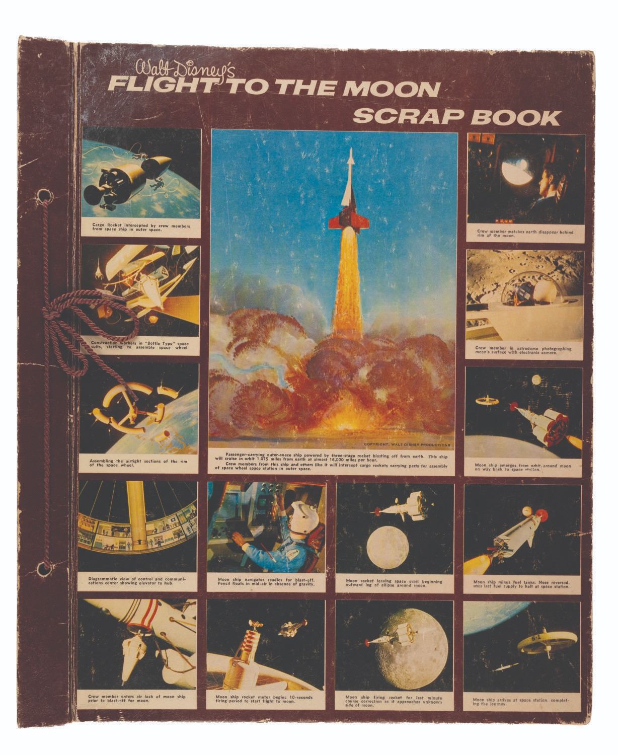 (Disneyland, 1960s) A rare Flight to the Moon souvenir scrapbook from Disneyland. The string-bound, board and leatherette book contains 15-leaves of construction paper with numbers penciled onto the lower right corners and one page with pen inscriptions. Measuring 12.25" x 14.5", the scrapbook is in good condition with one page stained from glue, a tear at the bottom of one page, and color shift to the paper throughout from age.