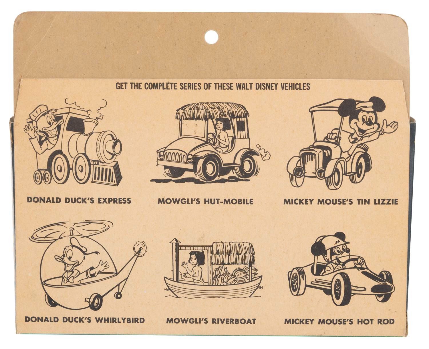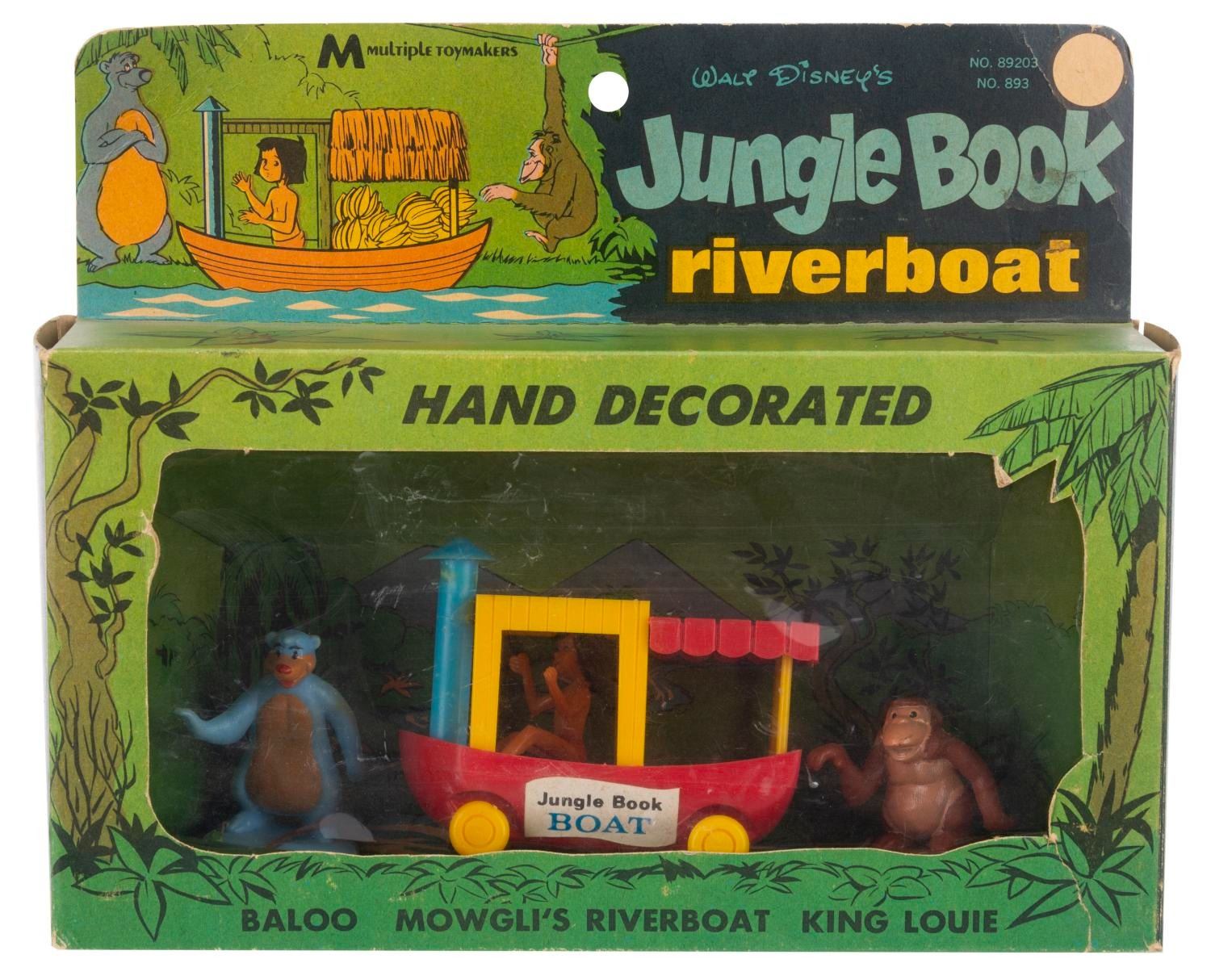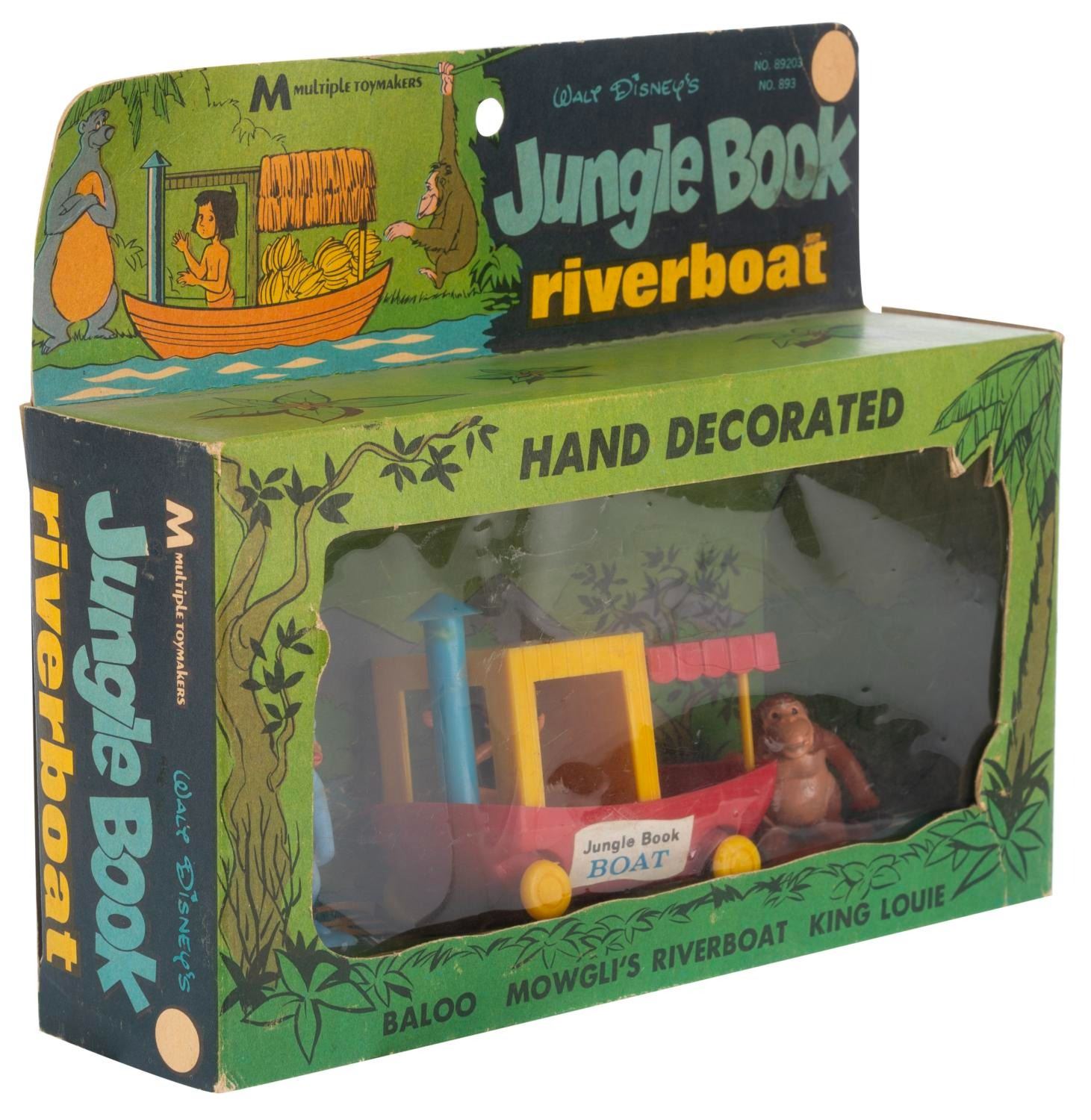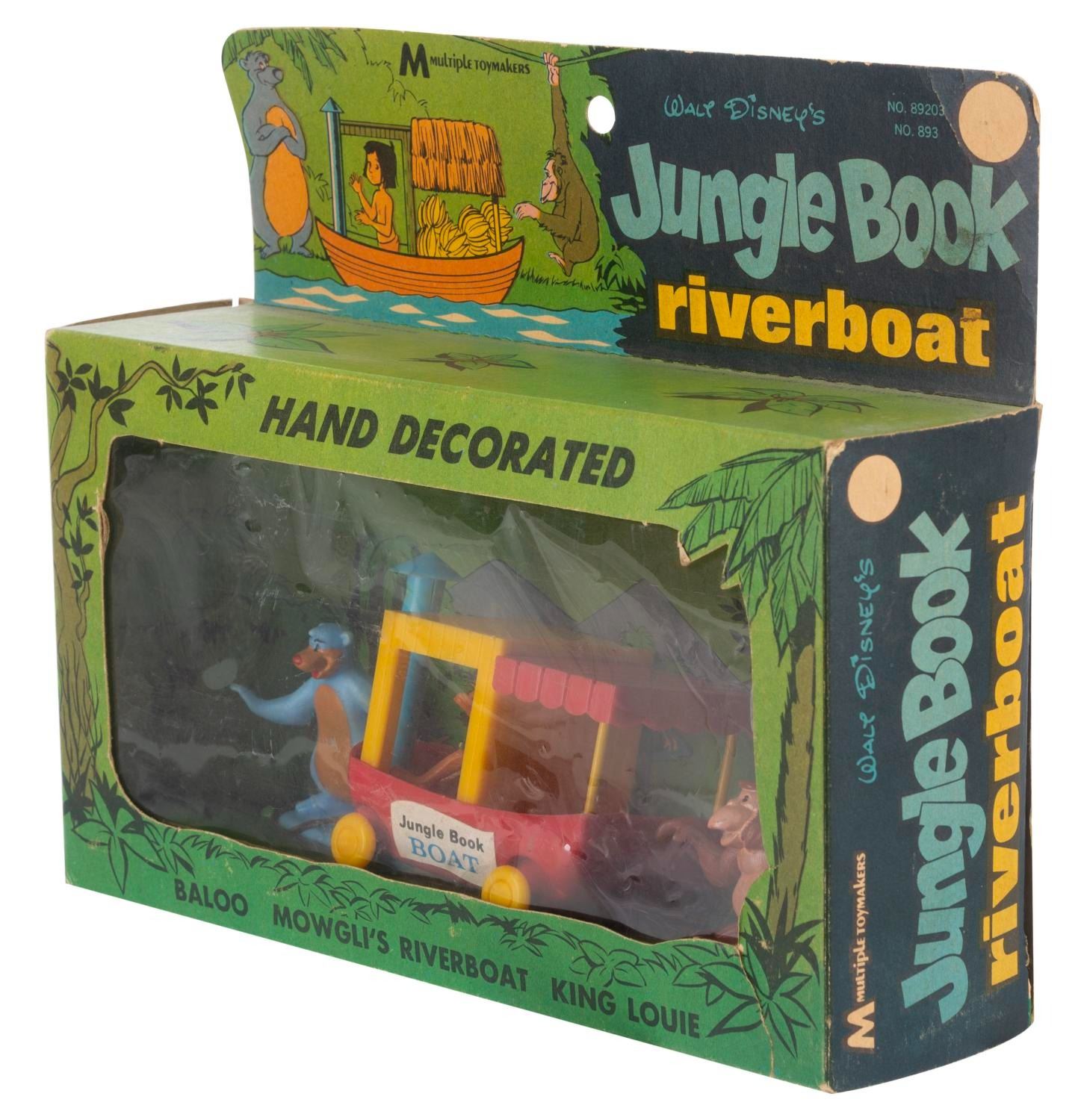(Disney, 1968) A Walt Disney’s Jungle Book Riverboat toy set featuring Baloo, Mowgli, and King Louie figures. The toy is in good condition with wear from age and no longer anchored into the original 2.5” x 7.25” x 9” box. The box is in fair condition with heavy wear.