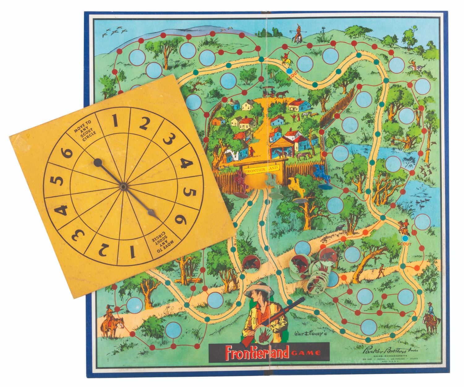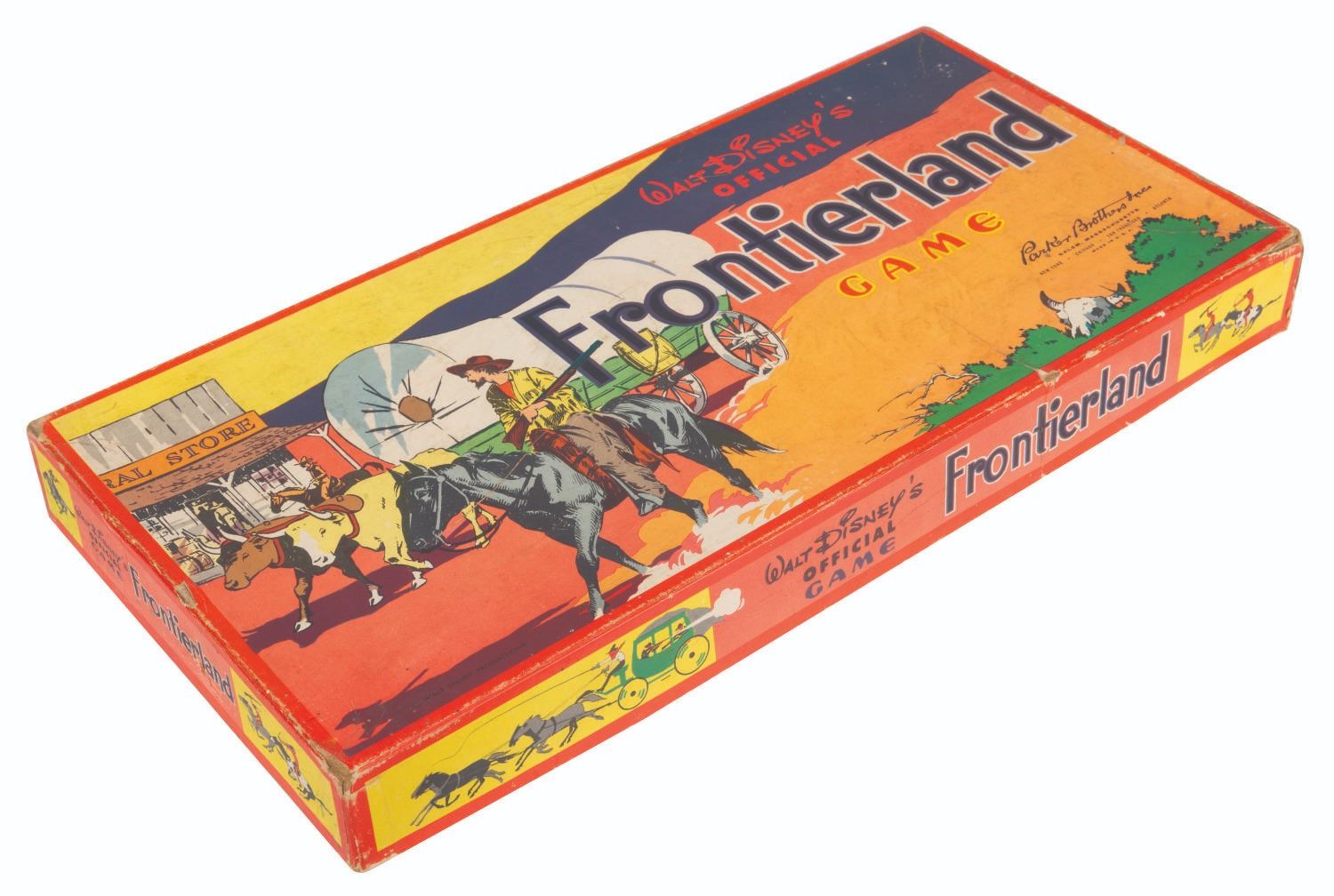 (Disneyland, 1955) A Walt Disney's Frontierland Game by Parker Brothers. The game includes the board, spinner, four painted metal player tokens, 15 circular tokens, and the game box. Measuring 8" x 16.5" and 2" thick, the game is in overall good condition with some discoloration and soiling from use. The box is in good condition with soiling and discoloration from use, as well as a tear in a corner of the lid.