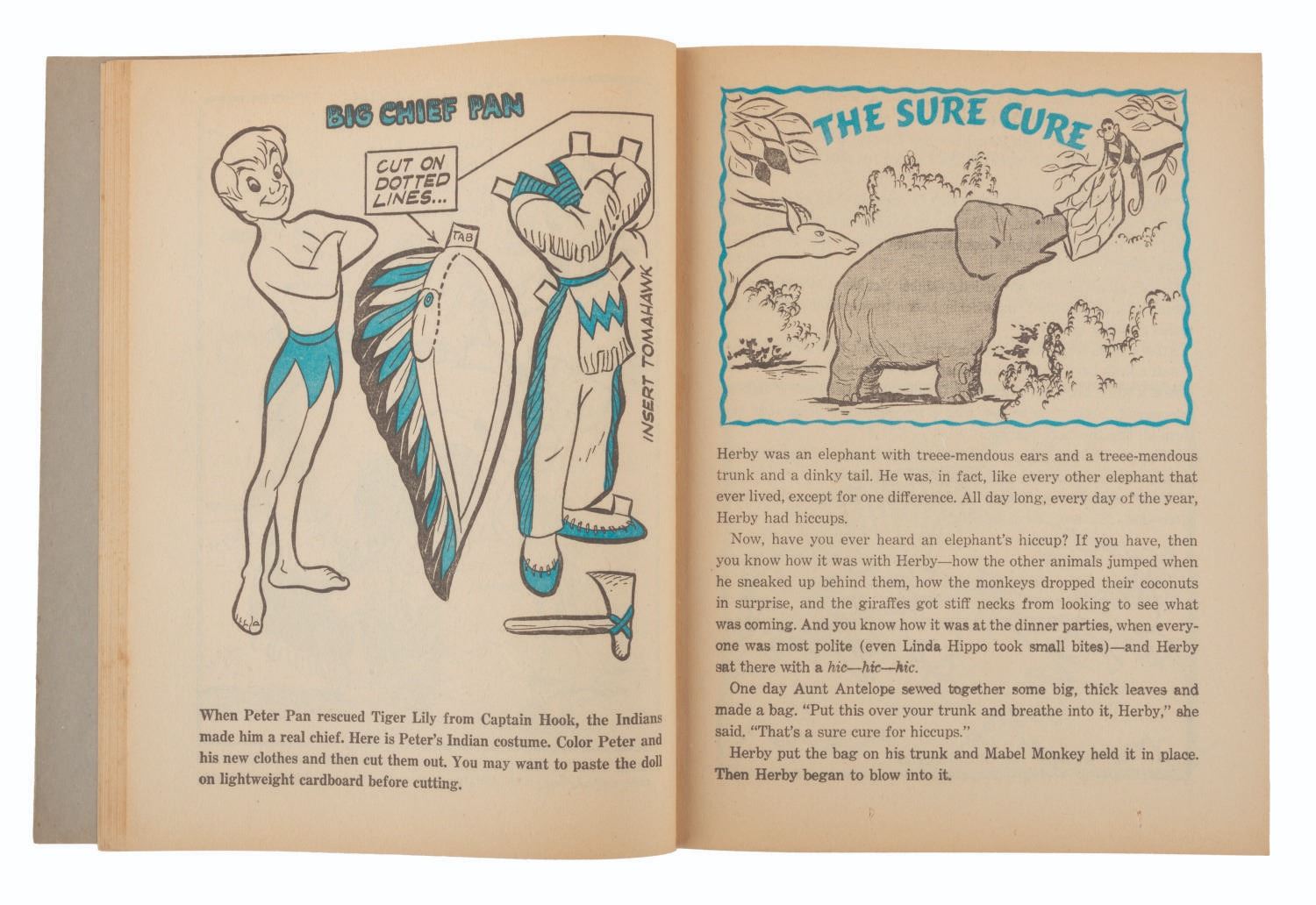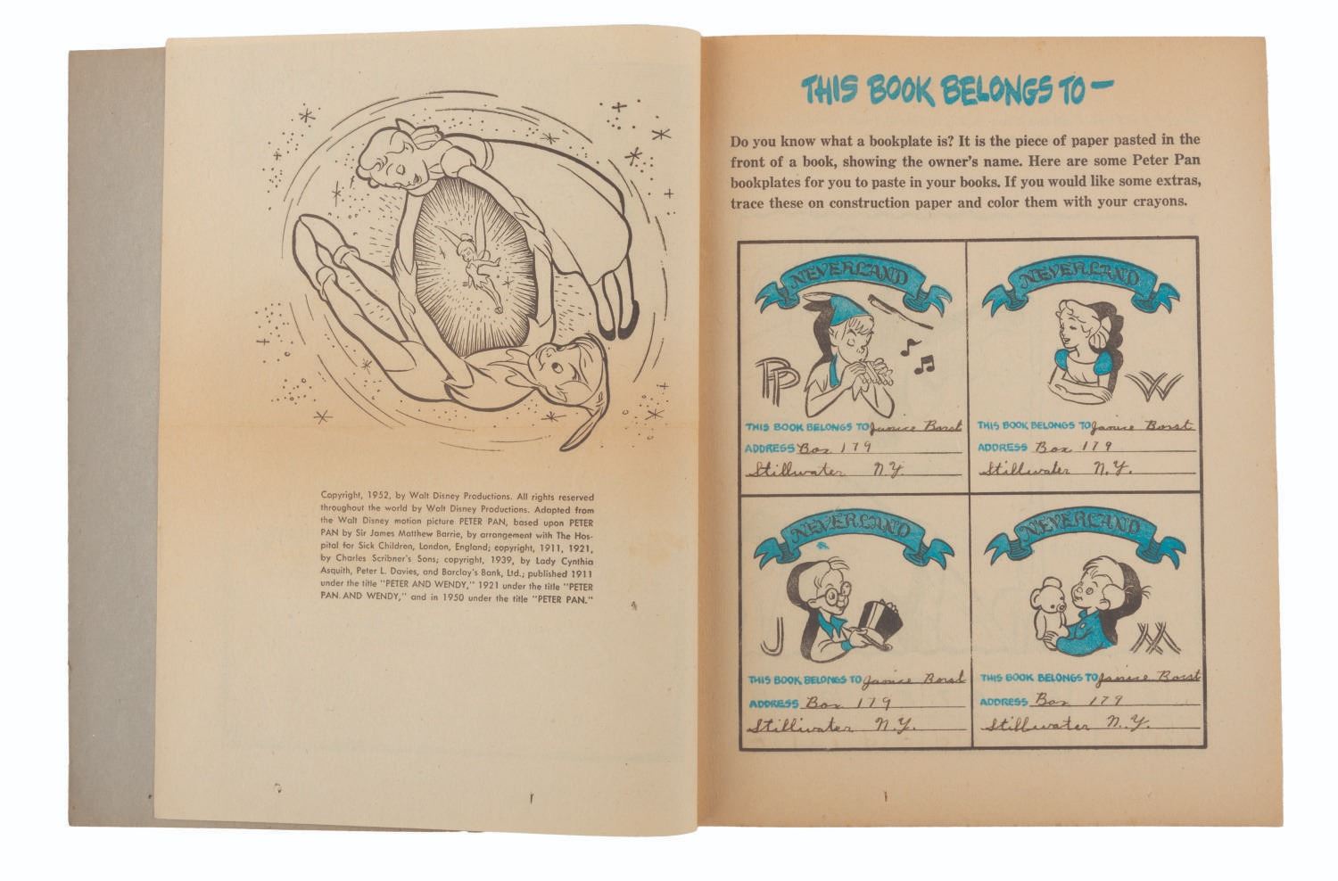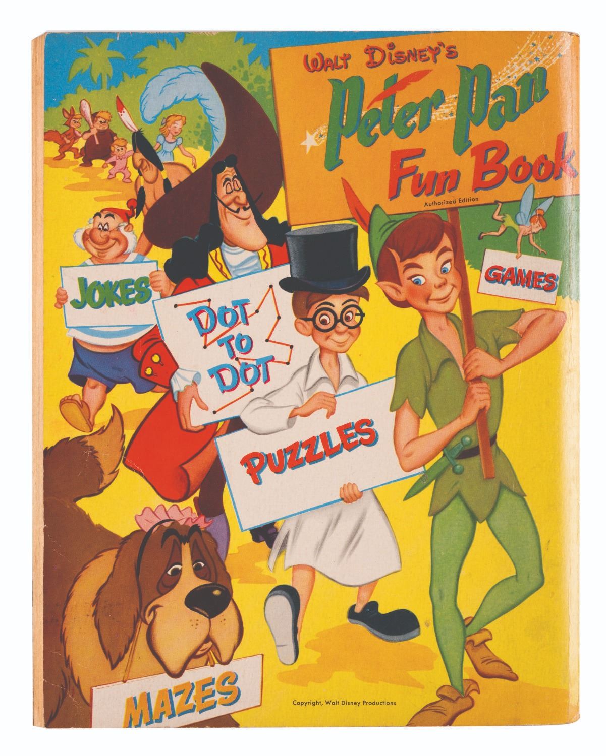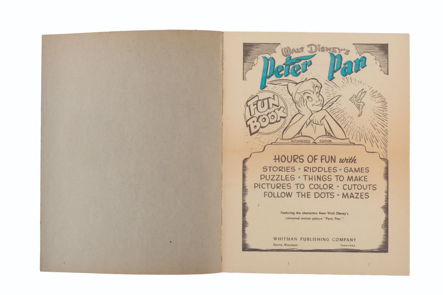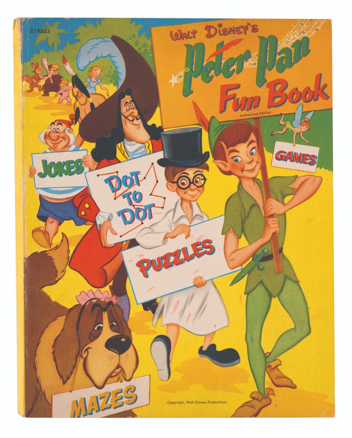 (Whitman, 1952) A Walt Disney’s"Peter Pan" fun book full of puzzles, jokes, activities, and more. Measuring 8.5" x 10.75", the book is in good condition with writing inside in pen and pencil, light edge wear, and discoloration.