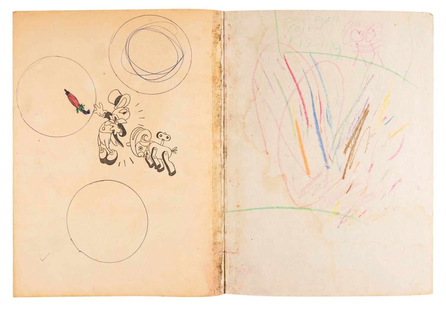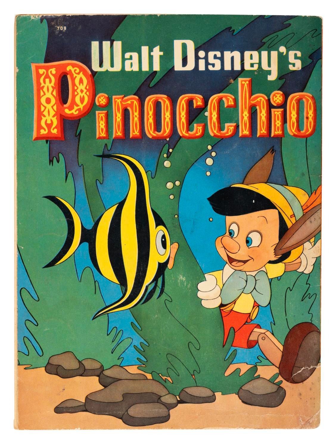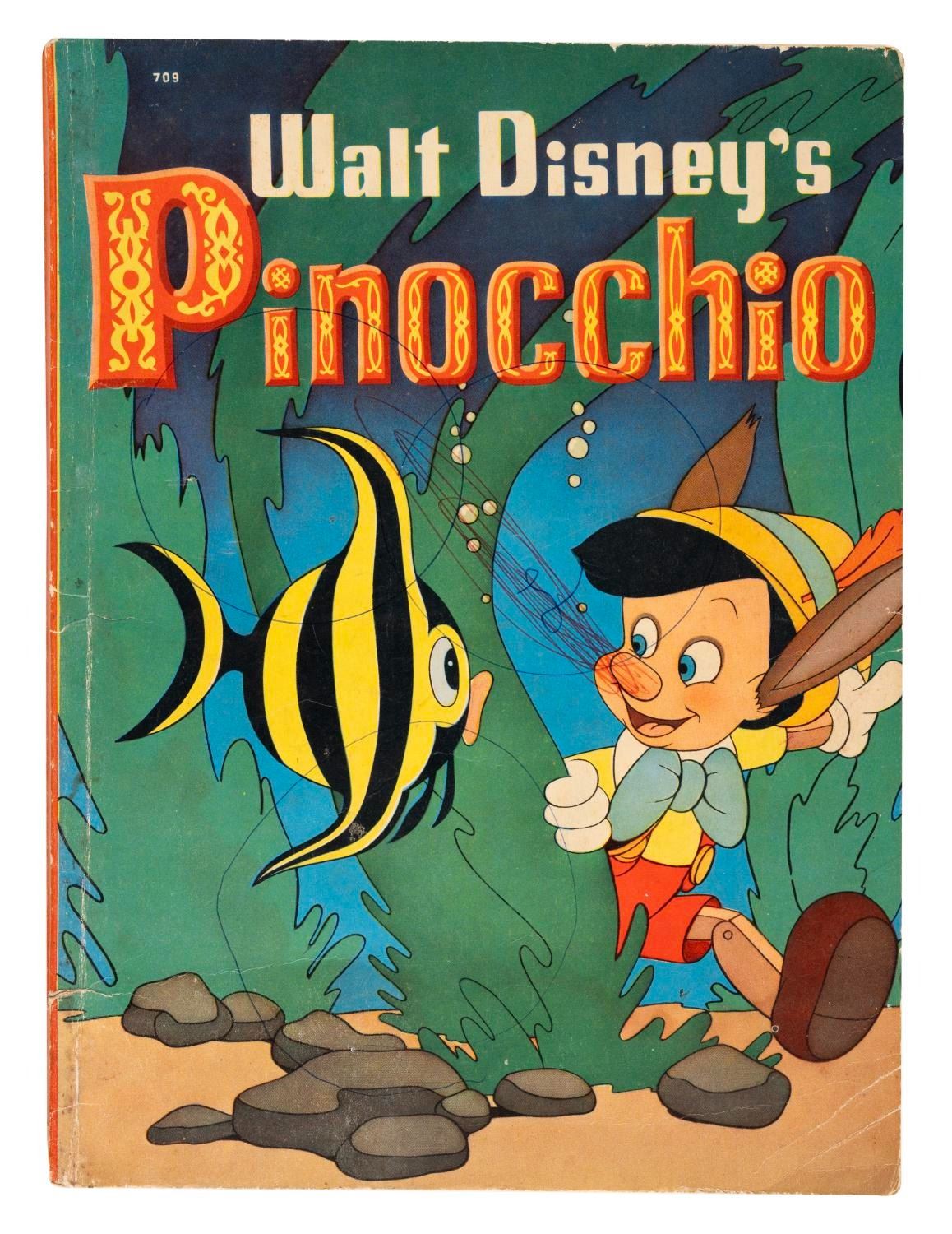 (Whitman, 1939) A Walt Disney’s “Pinocchio” coloring book. Measuring 8.5” x 11.5”, the 95-page coloring book displays in fair condition with many pages colored in, spotting, discoloration from age, a hole at the top right of most pages, ink marks on the cover, and a drawing on the inside cover.