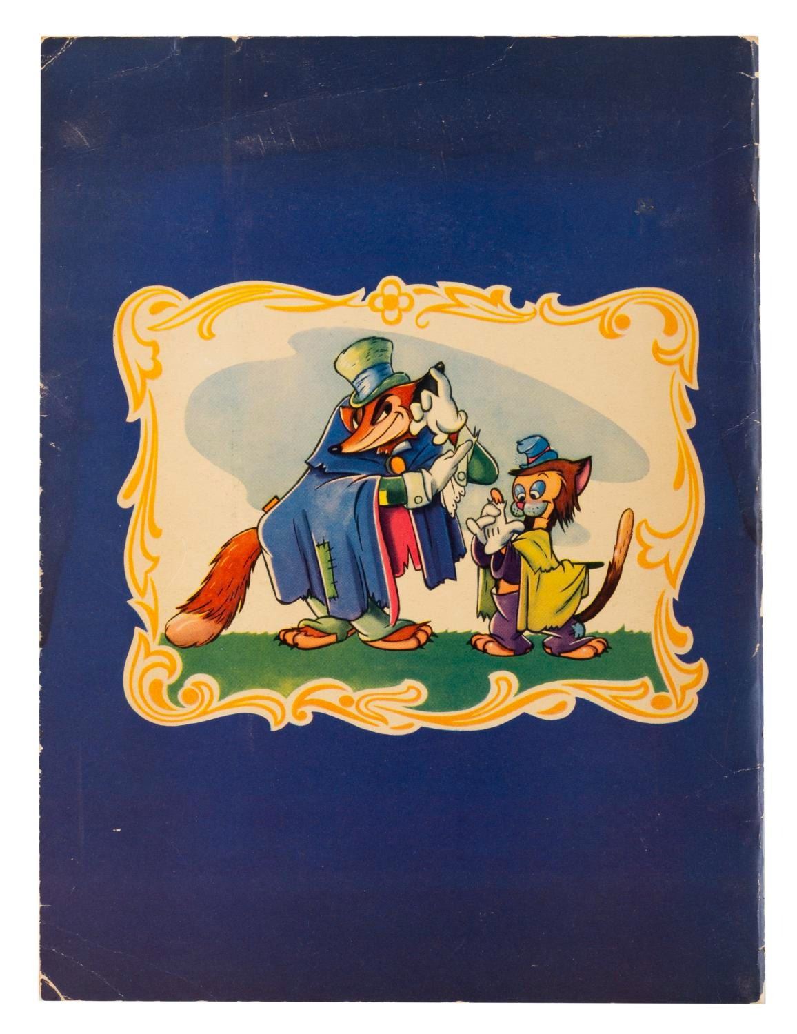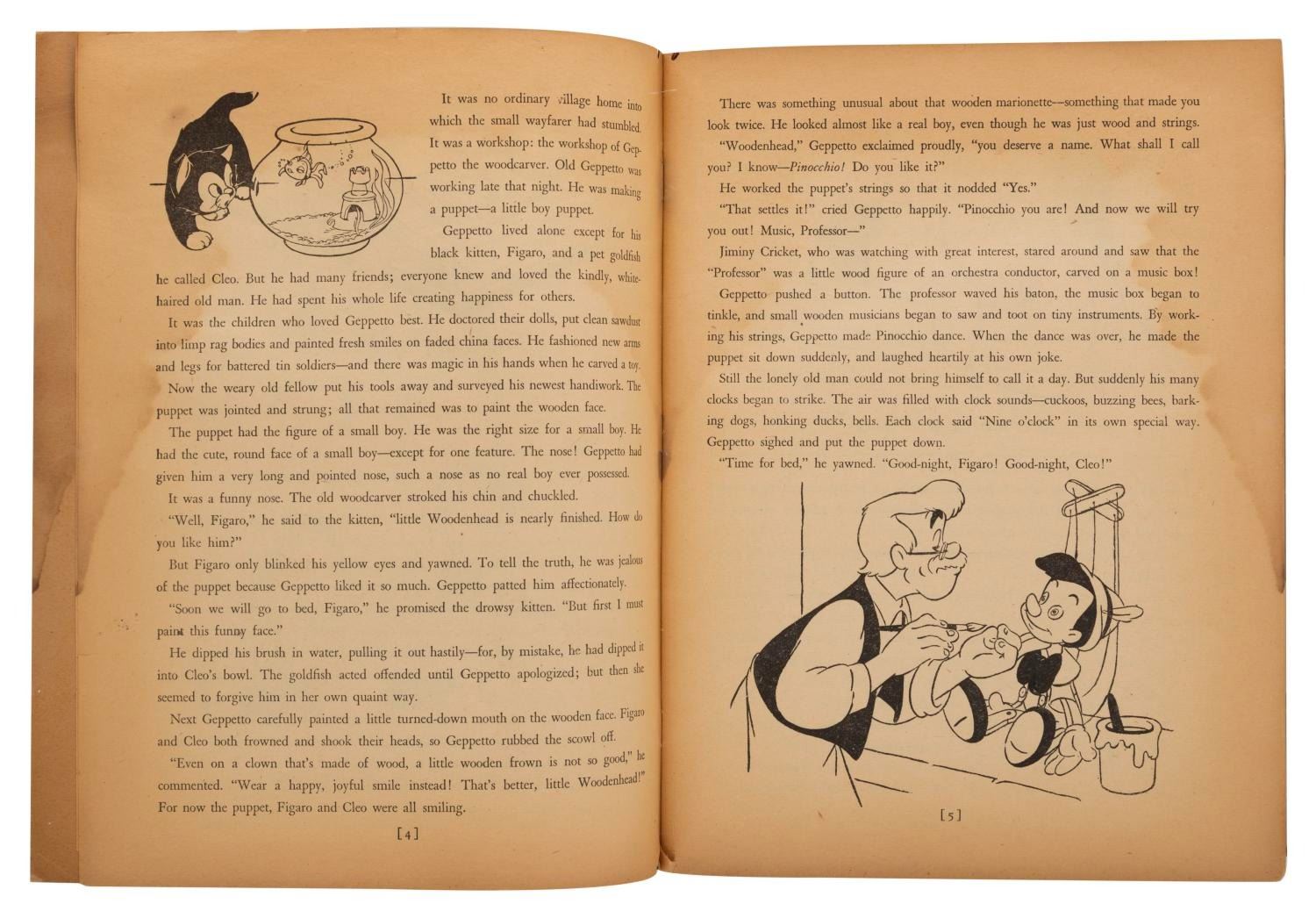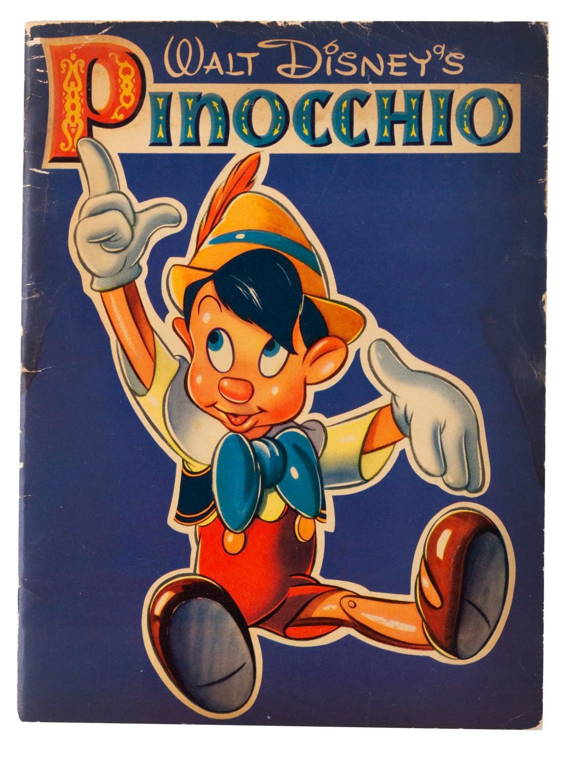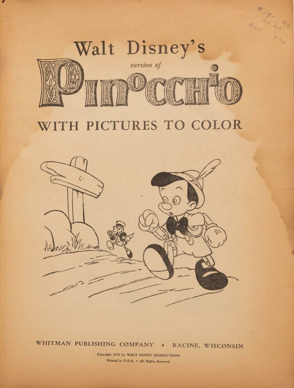 (Whitman Publishing, 1939) A Walt Disney's"Pinocchio" coloring book. Measuring 9.5" x 13", the book is in fair condition, with moderate edge wear, discoloration, and areas of creasing.