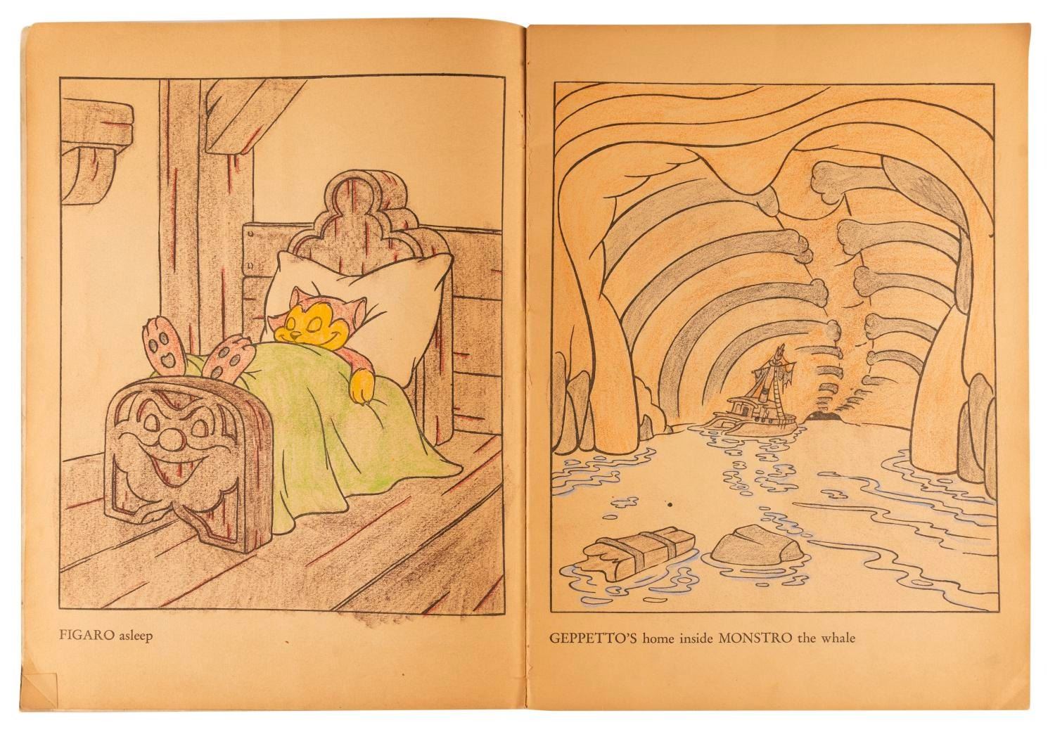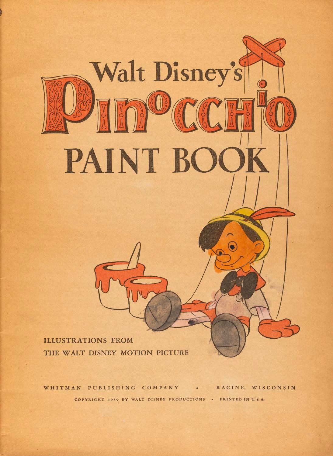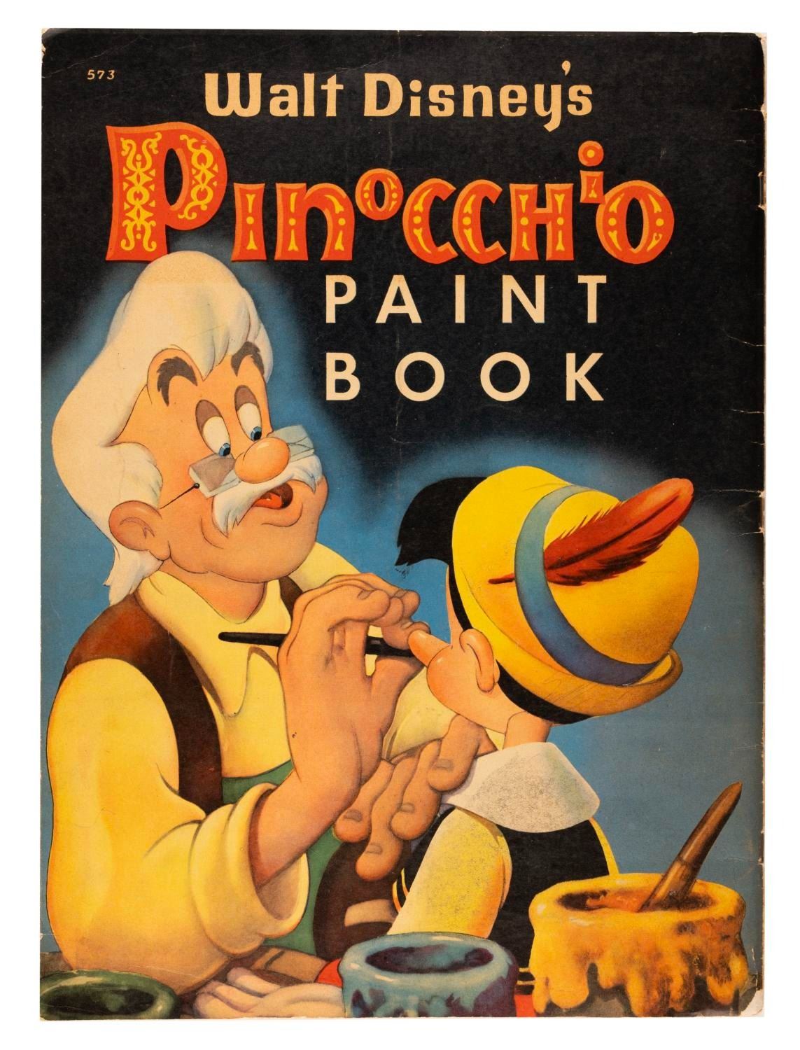 (Whitman, 1939) A Walt Disney’s "Pinocchio" Paint Book with coloring pages that tell the story of the film. Measuring 11.25” x 15.25”, the book is in good condition with heavy creases, edge wear, discoloration from age, and most of the pages painted or colored in.