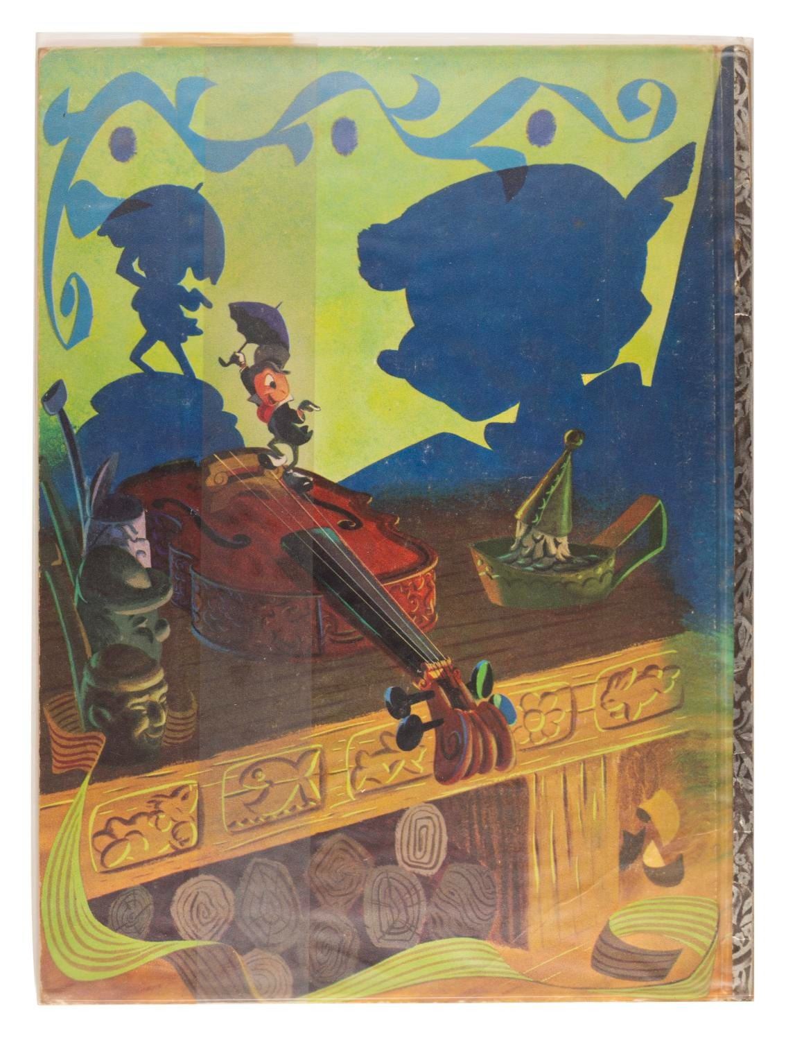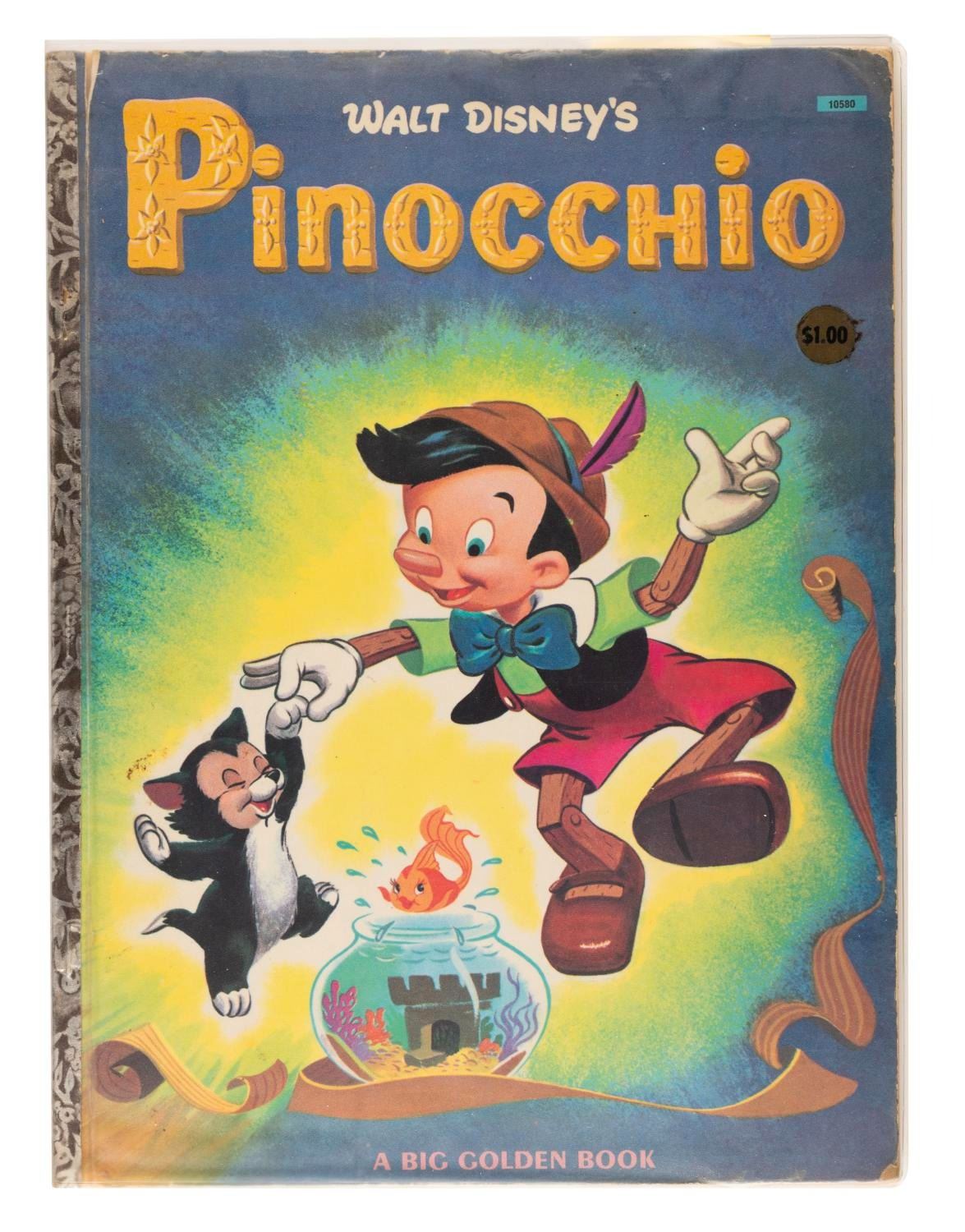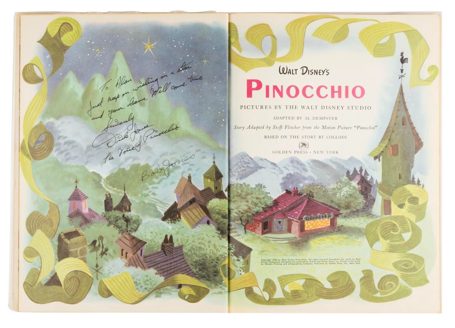 (Golden Press, 1953) A Walt Disney's “Pinocchio” Big Golden Book signed in black ink by Pinocchio's voice actor Dickie Jones and model maker and puppeteer Bob Jones. Measuring 9.5” x 12.5”, the book is in very good condition with light scratches, stains, a pricing sticker on the cover, and wear.