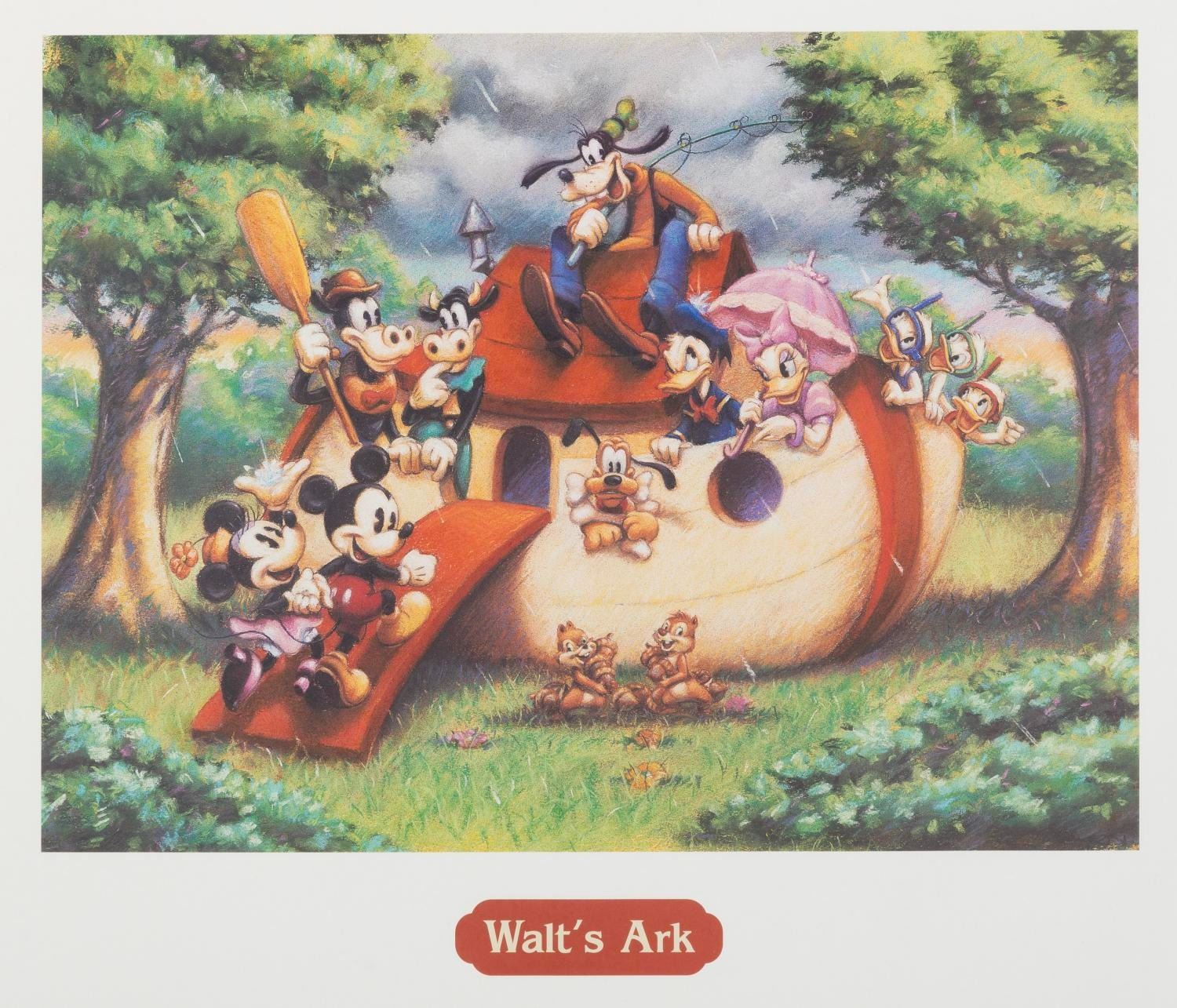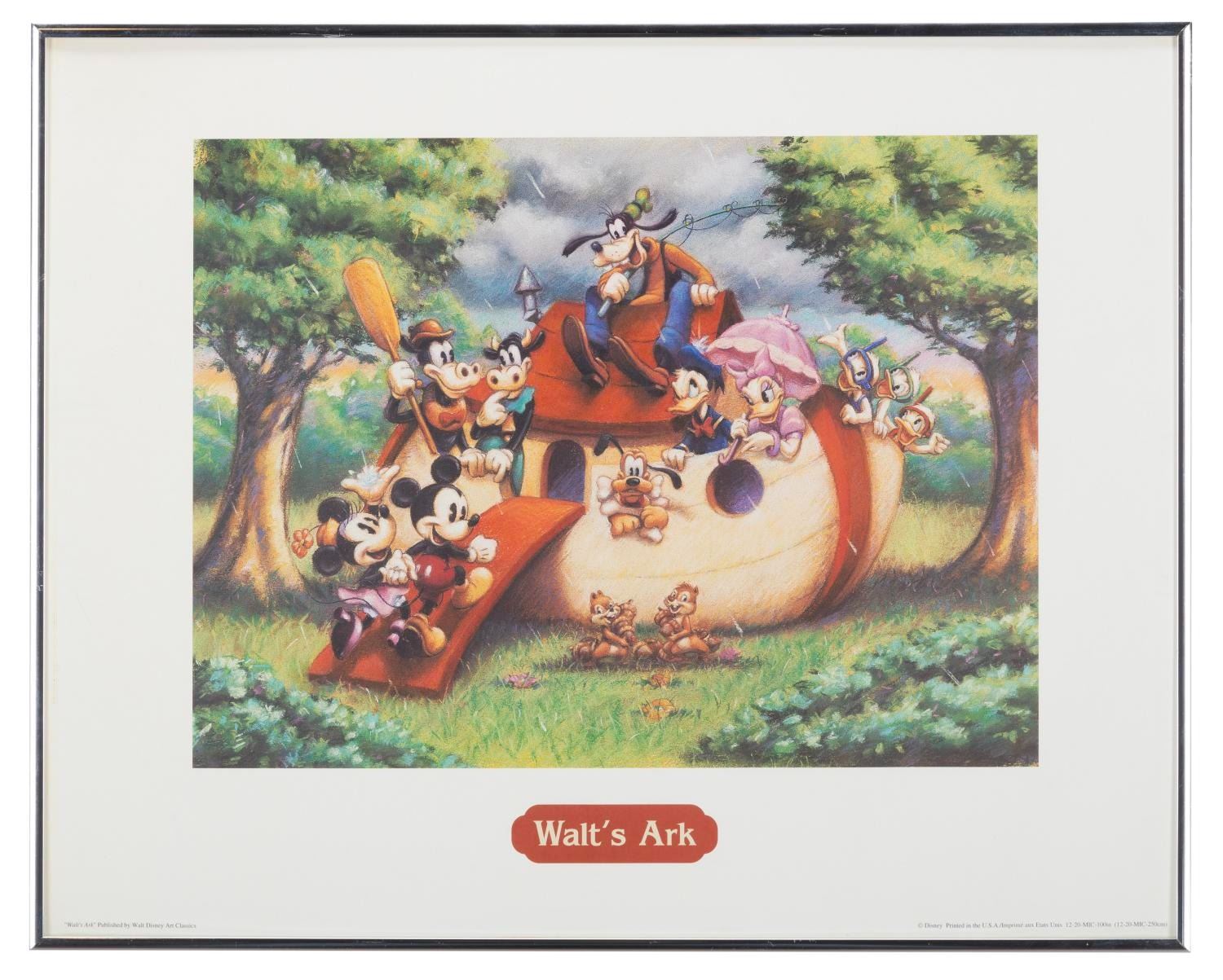 (Disney, 1990s) A print titled "Walt's Ark" released by Walt Disney Art Classics. Storm clouds are above, and the rains are beginning to fall, but luckily, Mickey has decided that a few of his friends will be able to avoid the floods aboard his ark. Measuring 20" x 16" with an 11" x 15" image, the print is in very good condition.
