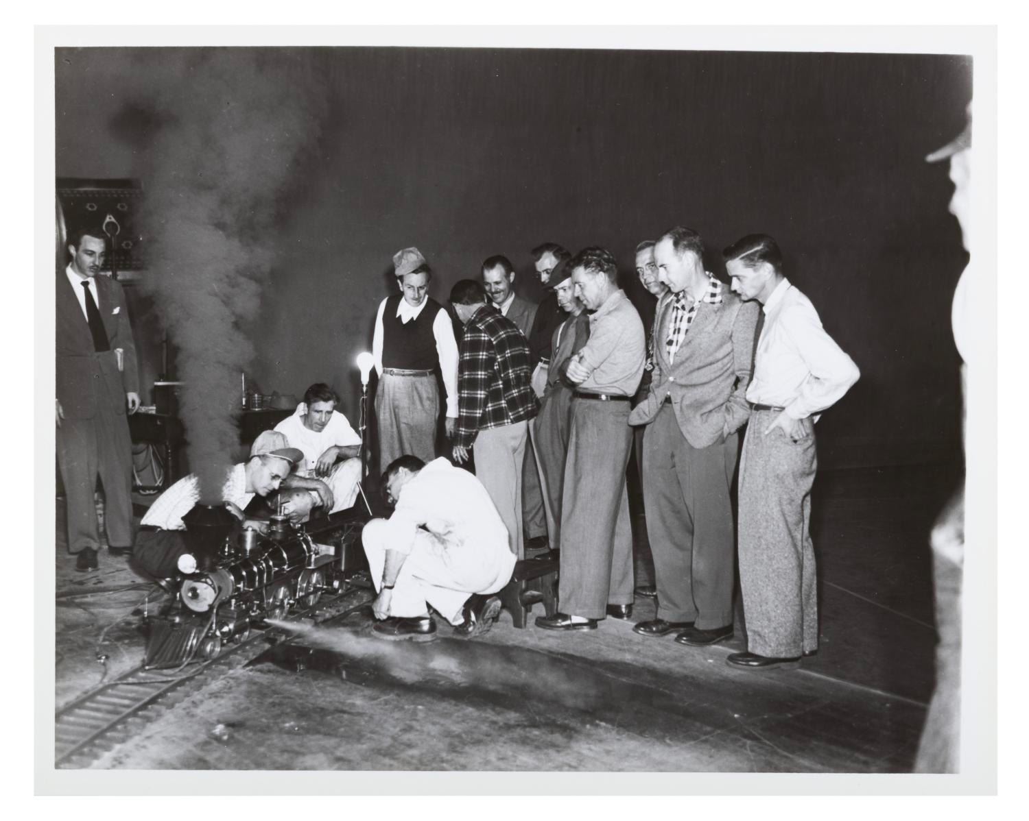 (Disney, 1949) An original print of Walt Disney showing off the 1:8 scale Lilly Belle locomotive he built by hand to his fellow train enthusiasts at the Walt Disney Studio. This photo was taken in December of 1949. In the group are Ward Kimball, Ollie Johnston, John Lounsberry, Eric Larson, and several more. Measuring 8" x 10", the photo print is in very good condition.