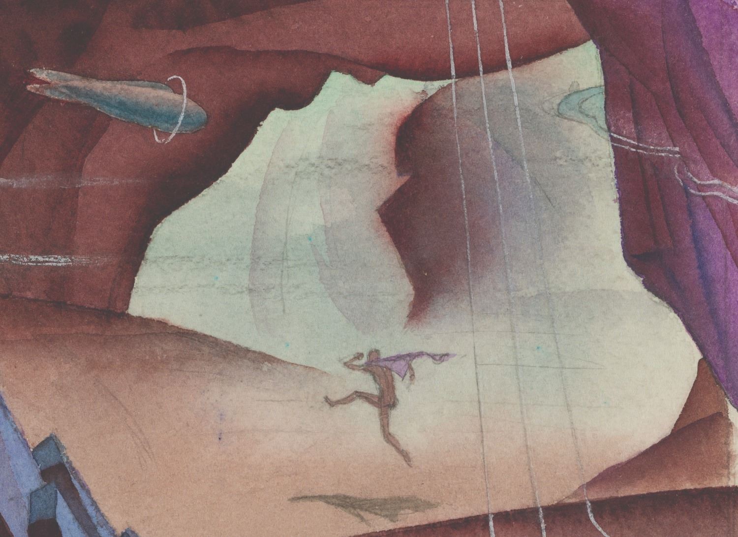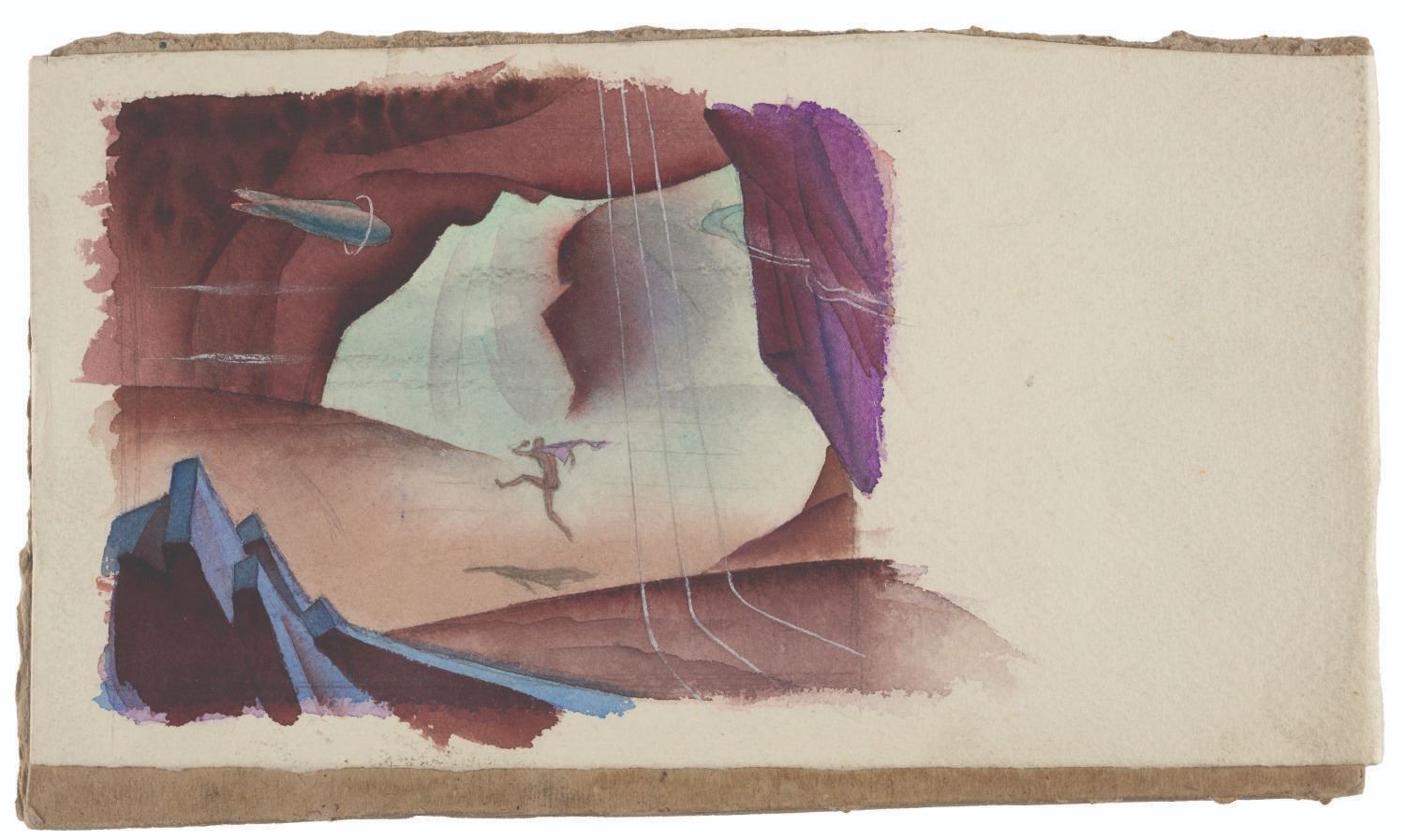 (Clampett, 1934-35) A concept painting from Bob Clampett’s canceled “Warlord of Mars.” This watercolor piece showcases an early look at the the otherworldly terrain of Barsoom and the planet’s unusual gravity. Measuring 5.5” x 10” on heavy paper and adhered to 5.75” x 10” artist board, the art displays in very good condition with light wear, scratches, and spots of discoloration from age.