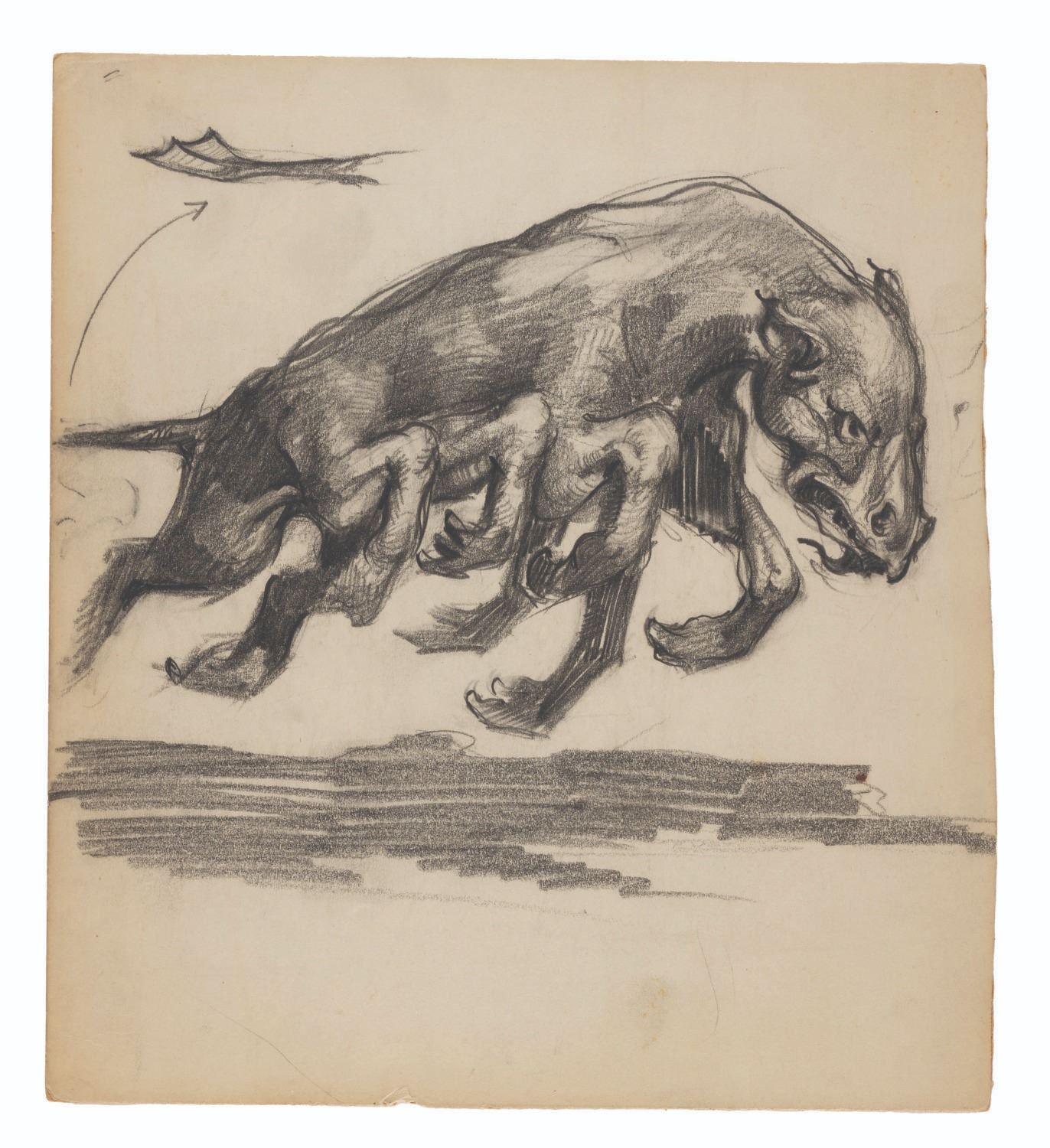 (Clampett, 1934-35) A concept drawing of a Thoat from Bob Clampett’s unrealized “Warlord of Mars” film, based on the John Carter Barsoom book series by Edgar Rice Burroughs. These eight-legged beasts were native to Mars, or "Barsoom" as it is known in the series. Measuring 9” x 10”, the graphite drawing on artist board is in good condition with creases, scratches, stains, edge wear, discoloration from age, and material loss on the reverse from display.