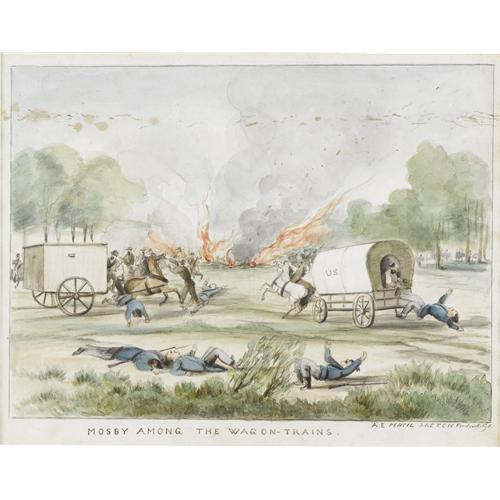 <B>A Watercolor of <I>Mosby Among The Wagon Trains</B></I></B></I> This watercolor and pen sketch by noted Civil War artist Alfred Von Erickson portrays Confederate Raider Colonel John Singleton Mosby's men taking a Union wagon train. Von Erickson documented the war in and around his native Fredericksburg, compiling a series of drawings, sketches and watercolors during the war. This sketch is signed <I>'A. E. Pencil Sketch, Fredricksbg. Va.'</B></I> at lower right. In vivid color Von Erickson depicts the raiders on horseback killing Union soldiers and burning the wagons while commandeering others. This is a beautiful wartime sketch, so important that it was used to make woodcuts for Lieutenant J. G. Beckham's book on Mosby just a year after war's end. It is in its beautiful walnut frame as well.******<BR><BR><b>Shipping:</b> Framed - with Glass, Medium (<a target="_blank" href="http://www.heritageauctions.com/common/shipping.php">view shipping information</a>)