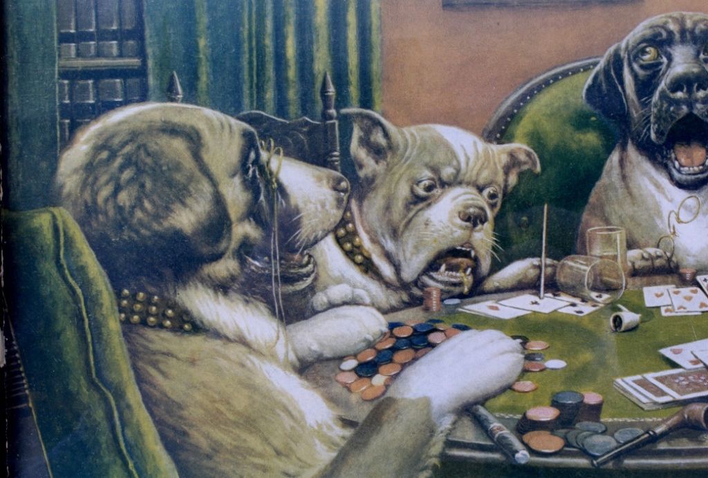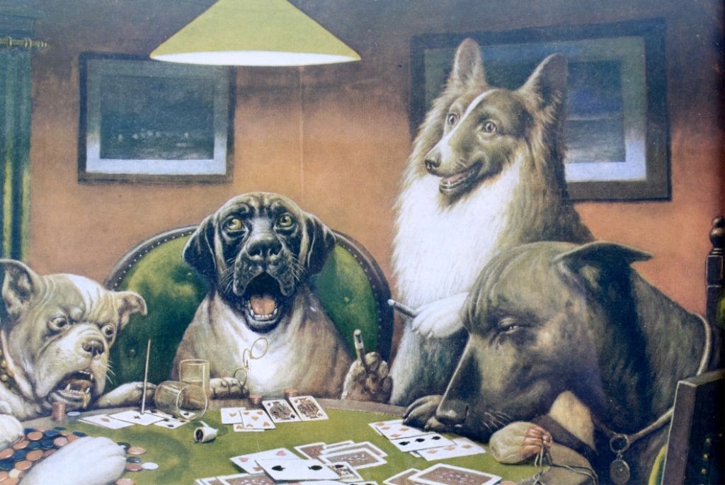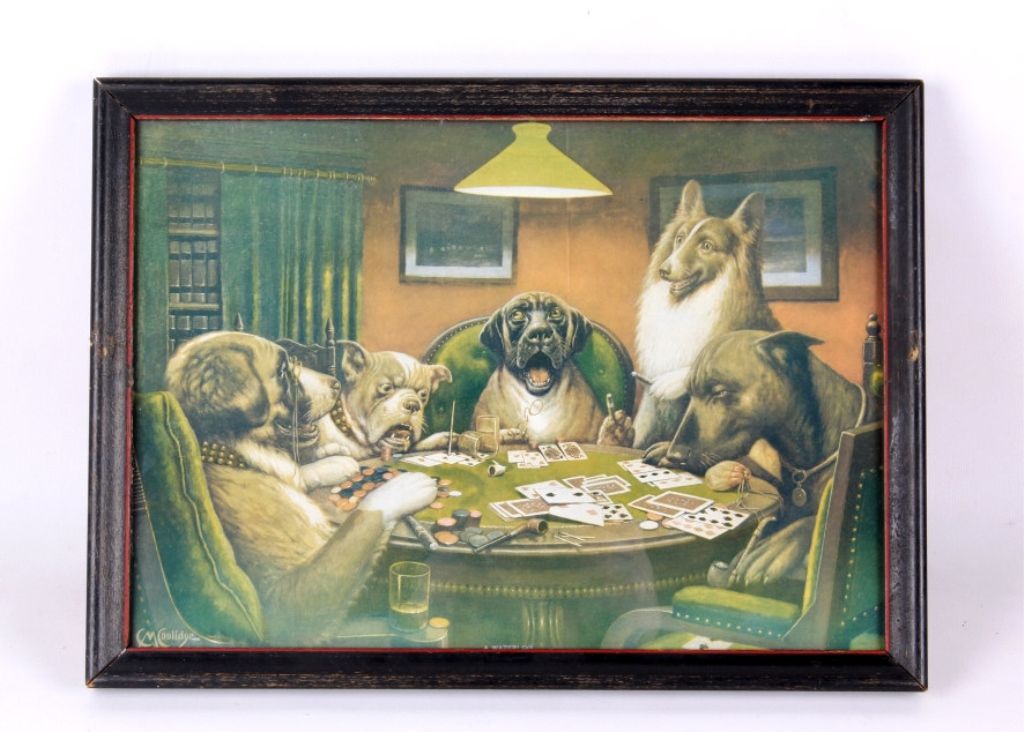 This lot features an original print by C.M. Coolidge. The humorous scene of dogs playing poker is depicted in this print. It is form the 1920's and has the original fame. It masures 11" x 15".