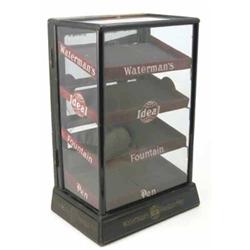 A Waterman's shop counter pen cabinet, glazed on three sides with mirrored back and four sloping trays, c.1920's, 21ins £300-350