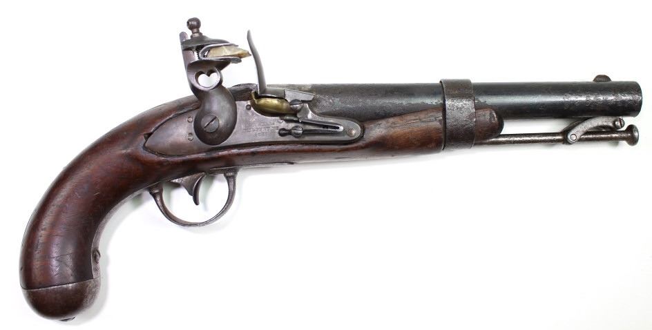 A. Waters Model 1836 .54 cal. flintlock pistol made from 1836-1841, 41000 produced. Features 8" round smooth bore barrel, walnut stock with swivel ramrod intact, appears to have been converted back to flintlock from percussion, action functioning, standmade from 1836-1841, 41000 produced. Features 8" round smooth bore barrel, walnut stock with swivel ramrod intact, appears to have been converted back to flintlock from percussion, action functioning, standard lockplate markings.