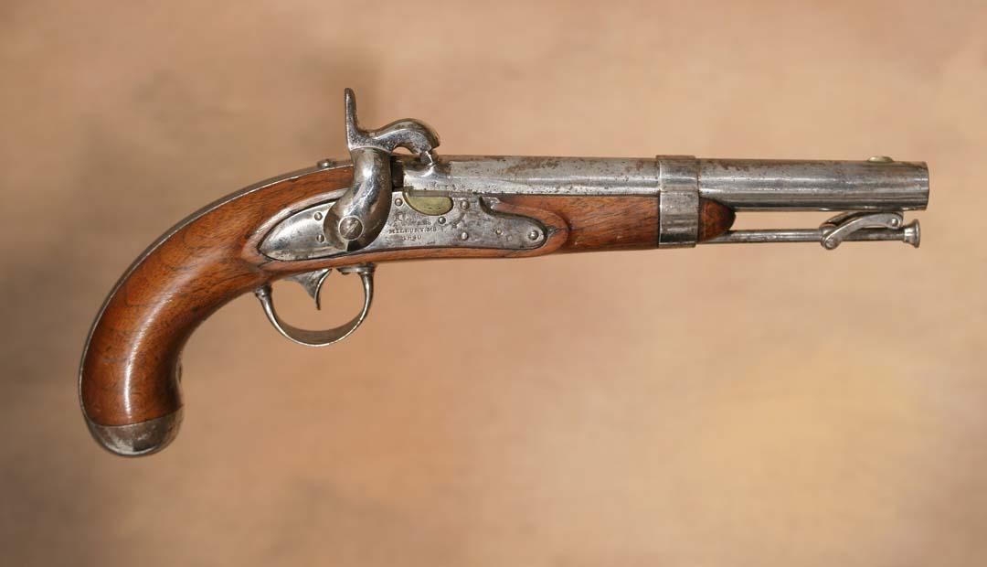 A. Waters Model 1836 Single Shot Pistol. 8 ½" barrel, 14" overall. Converted to percussion from flint, double cartouches, walnut stock. Circa 1840. (est $800-1,000). For condition reports please visit: www.auctioninsantafe.com/cr2011.pdf