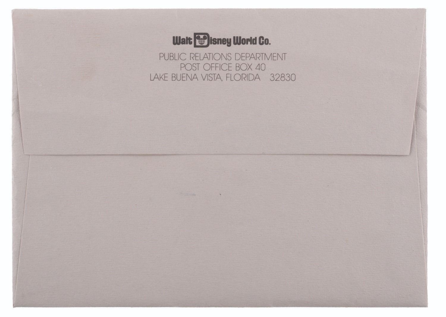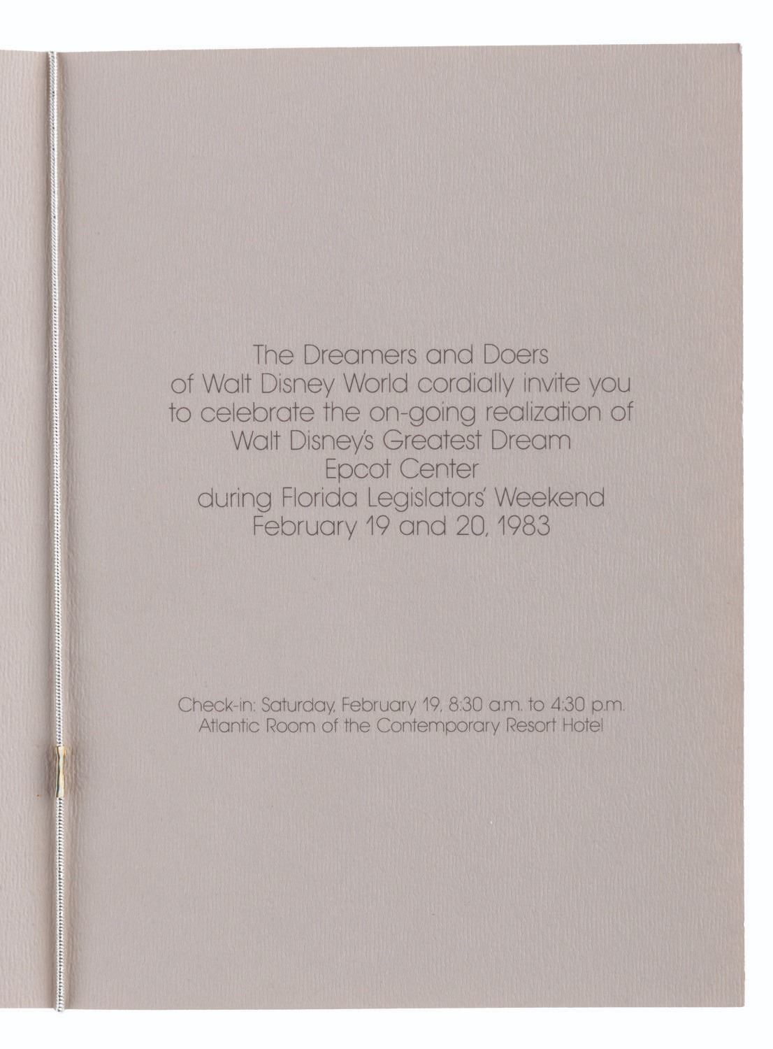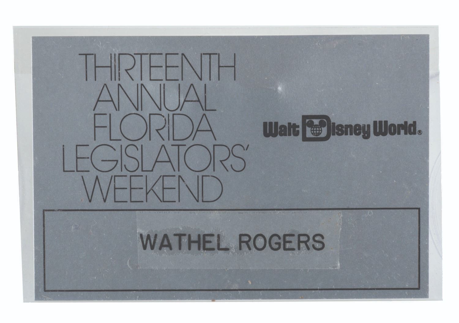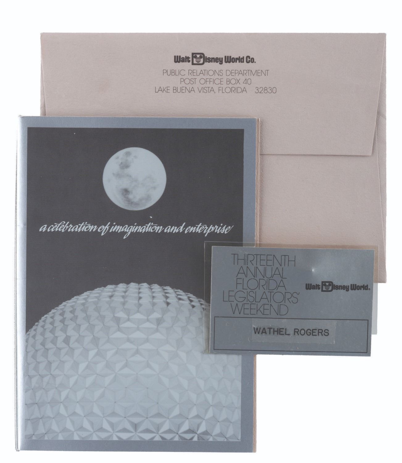 (Walt Disney World, 1983) An invitation and nametag for Disney Legend Wathel Rogers to attend "Florida Legislators' Weekend" at Walt Disney World during February 19-20 of 1983. Rogers pioneered audio-animatronic programming for Disney. This weekend was to celebrate Walt Disney's "Greatest Dream," EPCOT Center. The invitation measures 7" x 5" and is in good condition with some wear from use. The invitation includes the original envelope addressed to Rogers in very good unsealed condition. The 2.5” x 3.5” name tag is in very good condition with wear from original use.