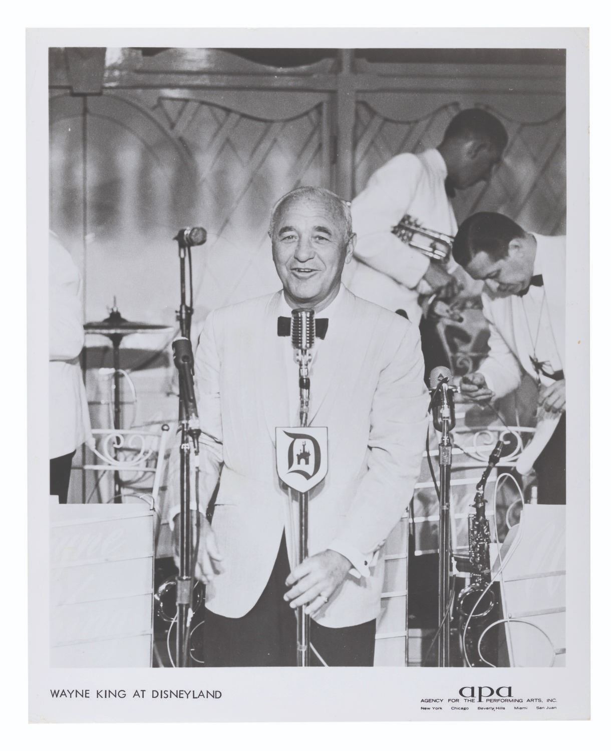 (APA, 1960s) A glossy publicity photo from the Agency for the Performing Arts of bandleader Wayne King performing at Disneyland. King often played with his band at the Carnation Plaza Gardens during Disneyland’s Big Band Festivals in the 1960s. Measuring 8.25” x 10”, the photo is in good condition with scratches and corner creases.