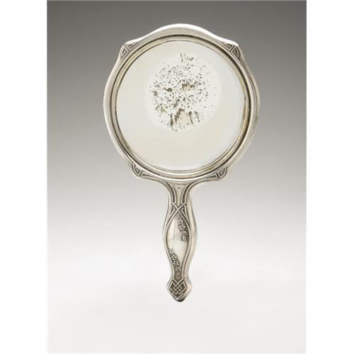 <B>An American Silver Hand Mirror</B></I><BR><B>Webster Co., North Attleboro, MA, Early Twentieth Century</B></I><BR><BR>Hallmark to the front with <I>STERLING</B></I><BR>9.7in. long x 5.6in. wide1 Items <BR><BR><B>Condition Report:</B> Normal signs of wear as appropriate with age; the silver backing on the glass shows deterioration.