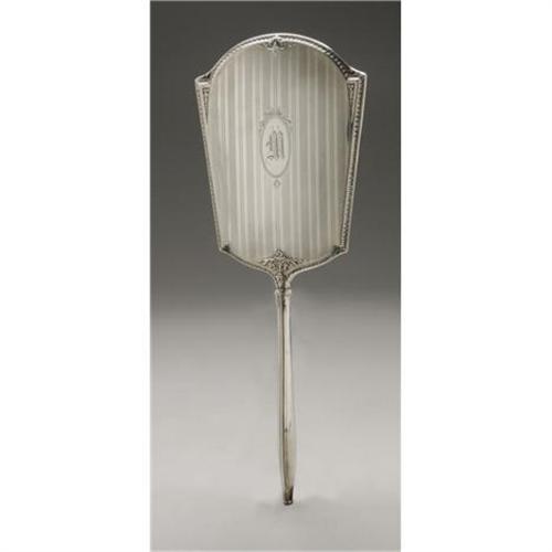 <B>An American Silver Hand Mirror</B></I><BR><B>Webster Co., North Attleboro, MA, Early Twentieth Century</B></I><BR><BR>Monogram to the reverse <I>M,</B></I> hallmark to the front with <I>STERLING</B></I><BR>12.7in. long x 4.7in. wide1 Items <BR><BR><B>Condition Report:</B> Normal signs of wear as appropriate with age; the silver backing on the glass is slightly deteriorated.