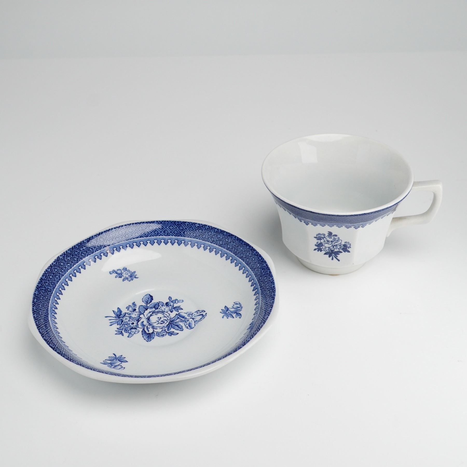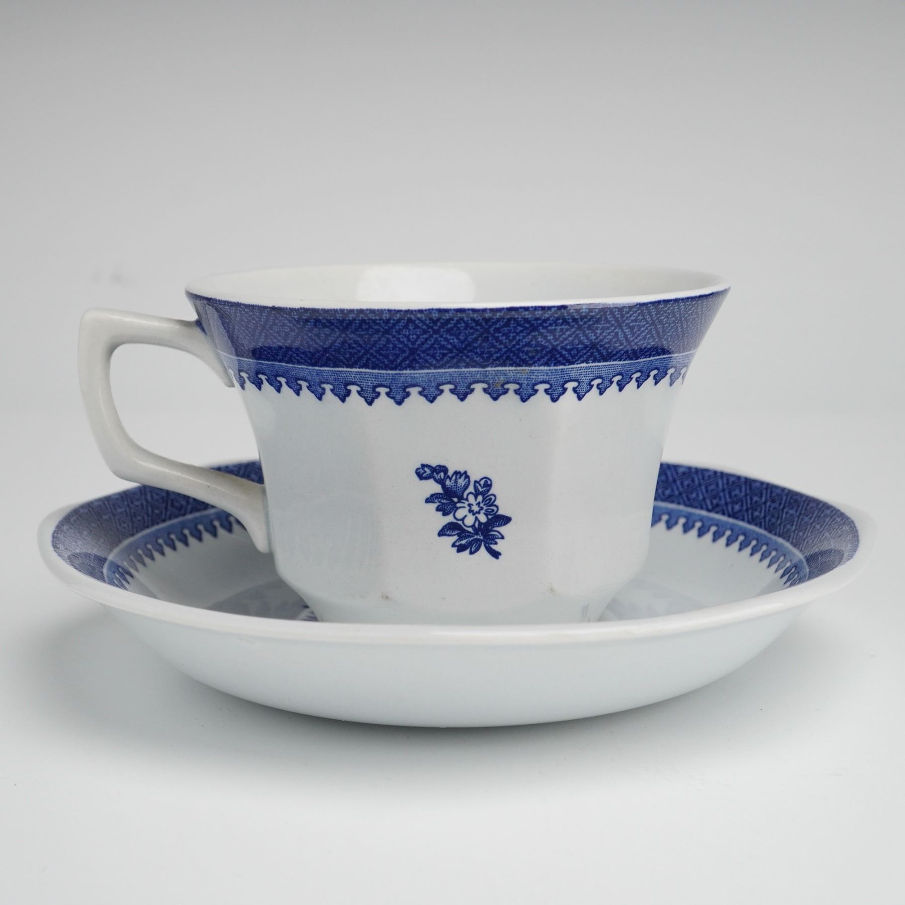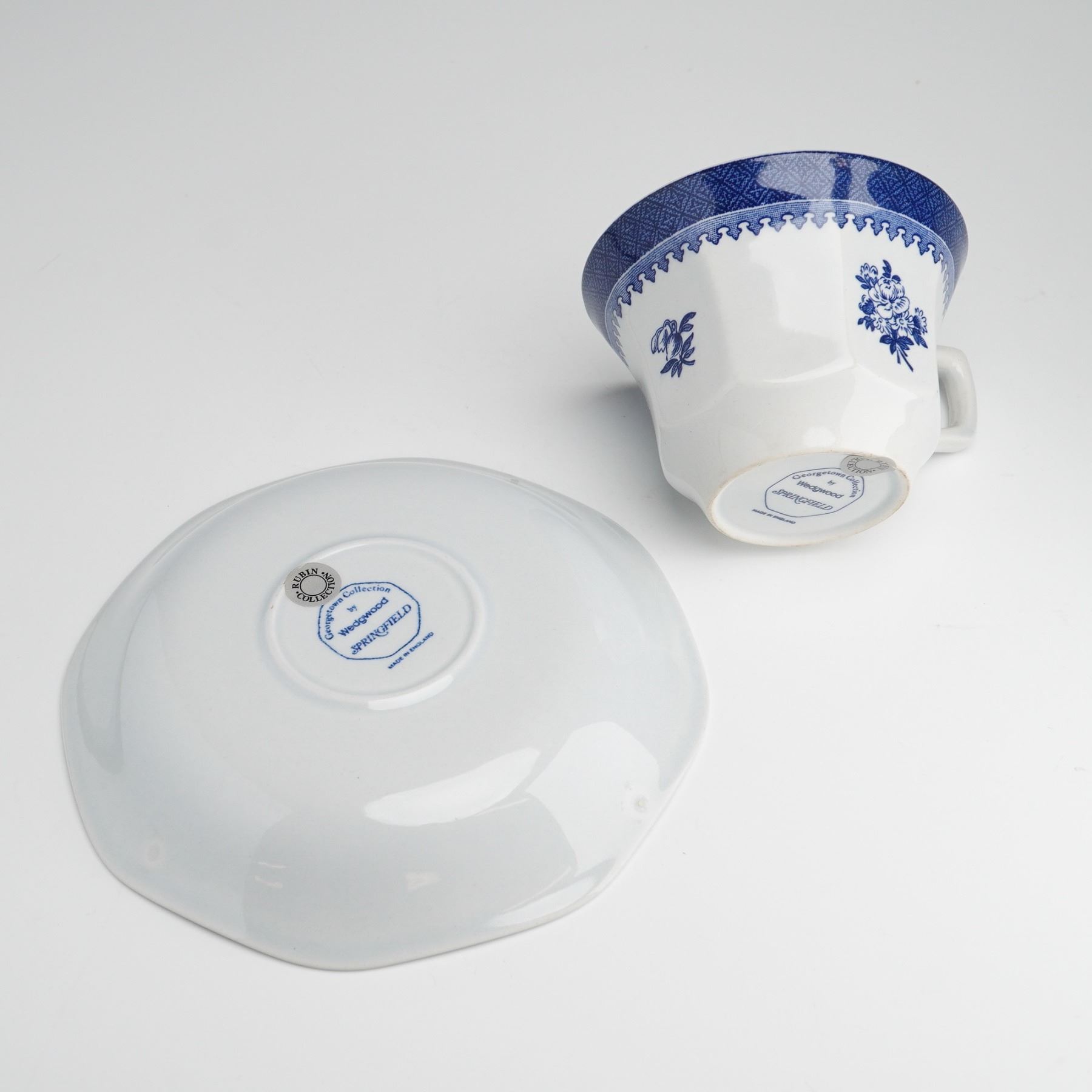 This cup and saucer set is part of the Georgetown Collection of Wedgwood Springfield pattern. Each piece is crafted from white ceramic and features blue transfer-printed designs, including a wide geometric diamond-lattice border with a scalloped edge and central floral sprays. The cup is designed with an angular handle and a subtly paneled lower body, while the saucer features a complementary scalloped rim. Both pieces bear a blue manufacturer mark on the base reading Georgetown Collection by Wedgwood SPRINGFIELD MADE IN ENGLAND. The saucer retains a small Rubin Collection sticker on the underside.