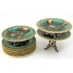 A Wedgwood majolica dessert service, tall comport, two lower comports and six plates mottled in g...