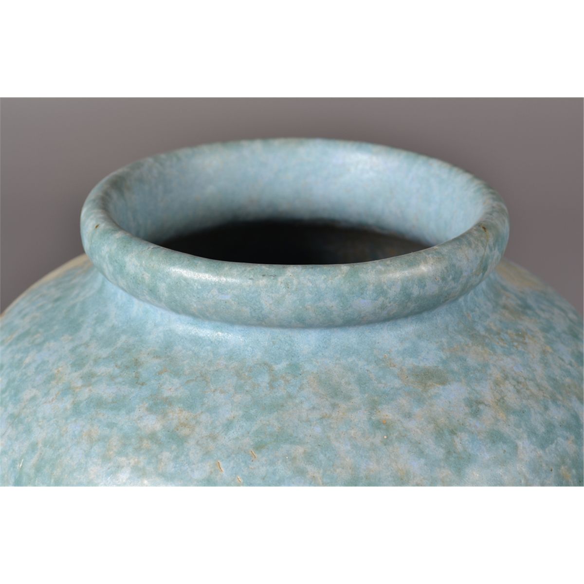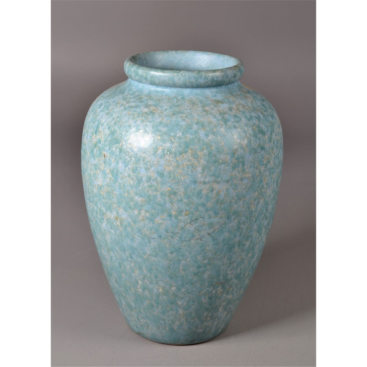 A large vase, the side with raised wedding band decoration, in robin egg and turquoise motted glaze. With Western Stoneware Company mark to underside. 16" H x 11.5" W. Circa early 20th century. Private collection Gregory, MI.