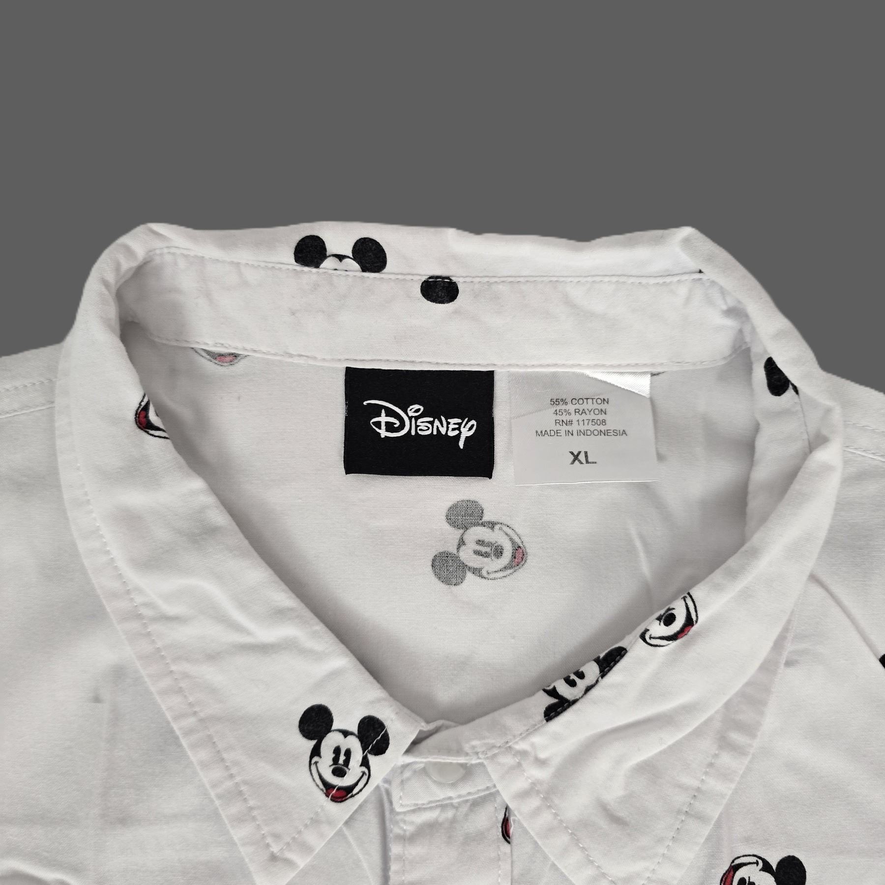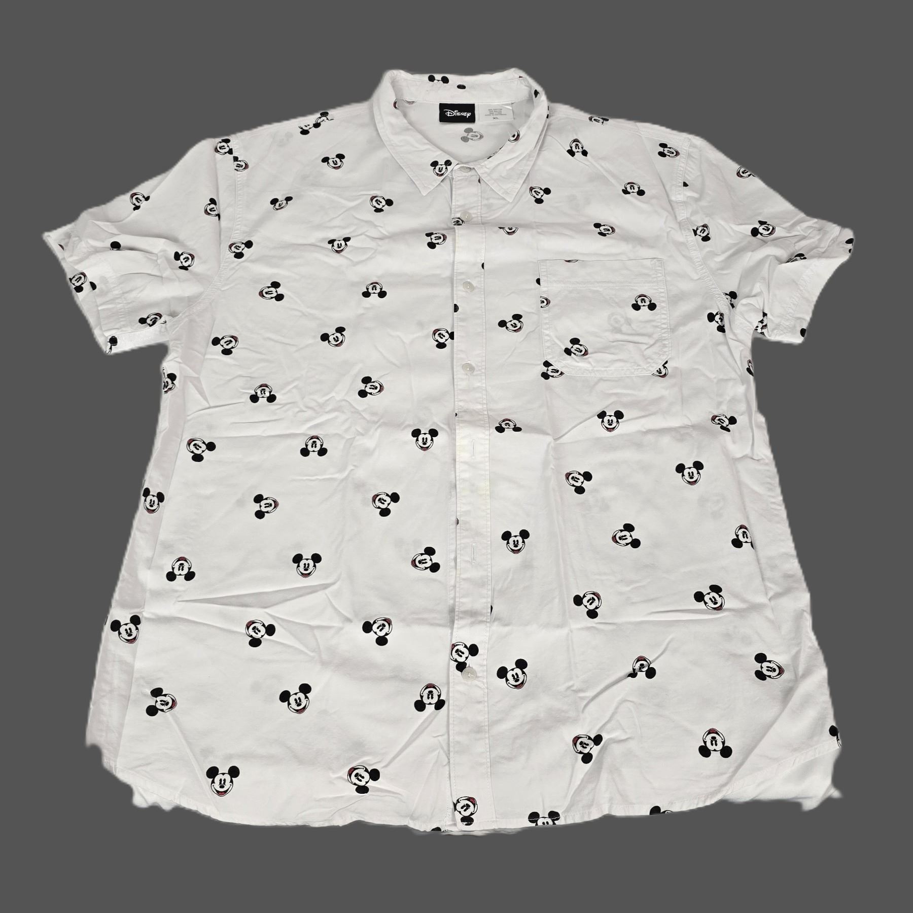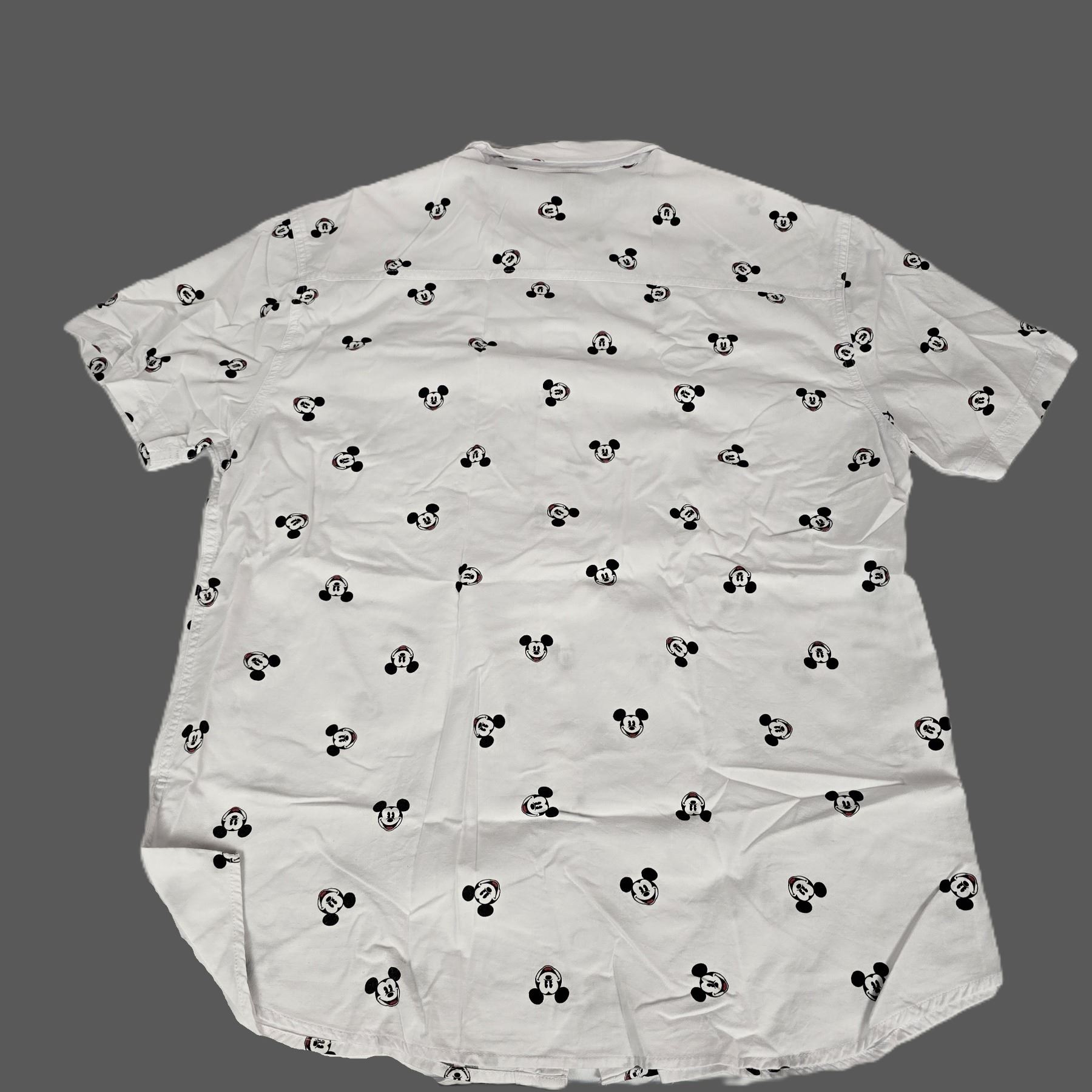 This is a white button up shirt with Mickey faces patterned across the entire shirt. It is in good condition and is size X-Large. Folded it measures 8" x 8" x 2" and weighs 6 oz.