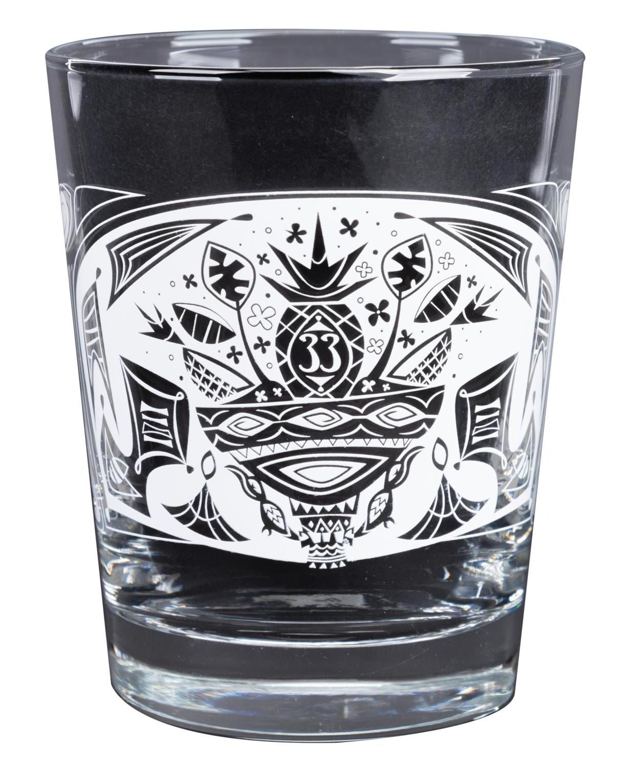 (Disneyland, 2019) A Club 33 exclusive white Mai Tai glass released during the 2019 Tiki Takeover event. Note that this glass is actually clear and was photographed with black inside to help with the visibility of the white design. Measuring 4.5” tall and 3.5” in diameter, the glass is in very good condition with light surface scratches.