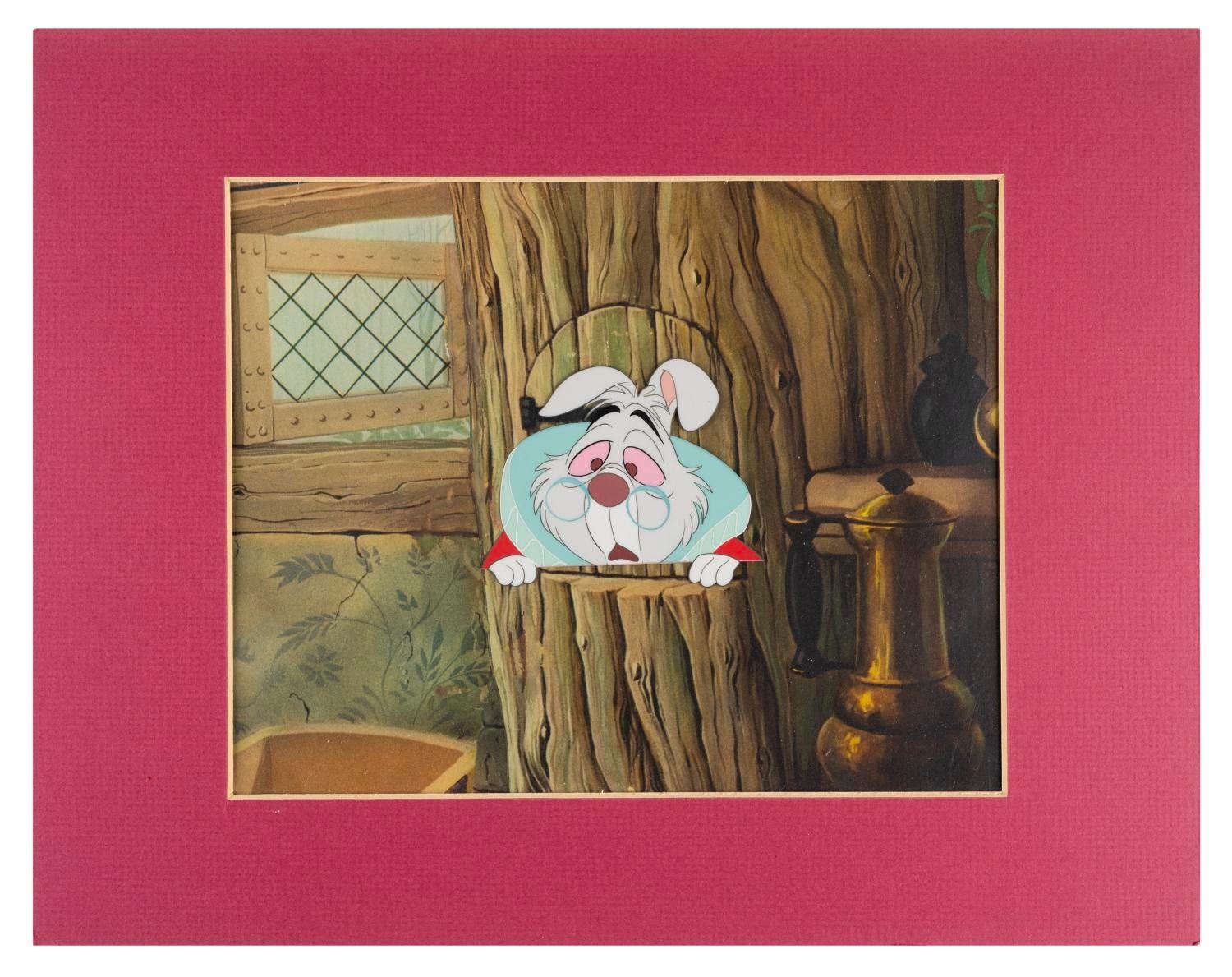 (Disney, 1951) A hand-painted production cel of the White Rabbit from “Alice in Wonderland,” presented with a “Sleeping Beauty” background reproduction. The production cel was originally sold at The Art Corner at Disneyland and retains the gold sticker of authenticity on the reverse of the matte. With a character image size of 2.75” x 3.25” on a 10” x 12” trimmed cel in a 11” x 14” matte, the art displays in good condition with scratches, wear on the matte, and a “L A Sheldon” sticker on the reverse.