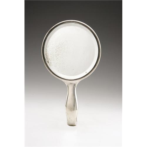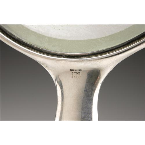 <B>An American Silver Hand Mirror</B></I><BR><B>Whiting Manufacturing Co., Providence, RI, Early Twentieth Century</B></I><BR><BR>Script monogram to the reverse <I>ESA,</B></I> hallmark on the tip of the handle and marked <I>STERLING 5702</B></I> to the top of the handle<BR>9.8in. long x 5.6in. wide1 Items <BR><BR><B>Condition Report:</B> Normal signs of wear as appropriate with age; the silver backing on the glass shows signs of degredation.