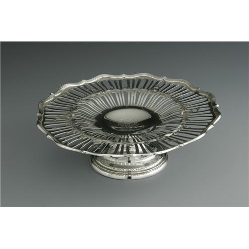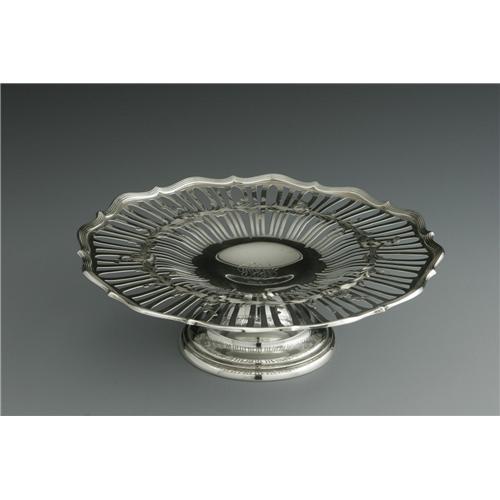 <B>An American Silver Compote</B></I><BR>Whiting Manufacturing, Providence, RI, Late Nineteenth Century<BR><BR>The reticulated compote with an engraved floral band, script monogram to the center <I>MFH,</B></I> marked to the underside, total weight 18.2 Troy ounces<BR>3.5in. high x 12in. diameter
