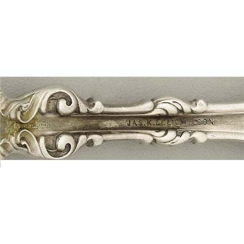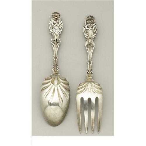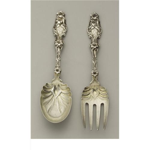 <B>An American Silver Salad Fork and Spoon</B></I><BR><BR>Whiting Manufacturing Company, New York, New York<BR>Early Twentieth Century<BR>Silver<BR>Marks: (Whiting), <I>STERLING, PAT 1902, RG 1902</B></I><BR>9 in. long, 7.20 troy ounces<BR><BR>In the Lily pattern, monogrammed <I>JCG</B></I>.<BR>
