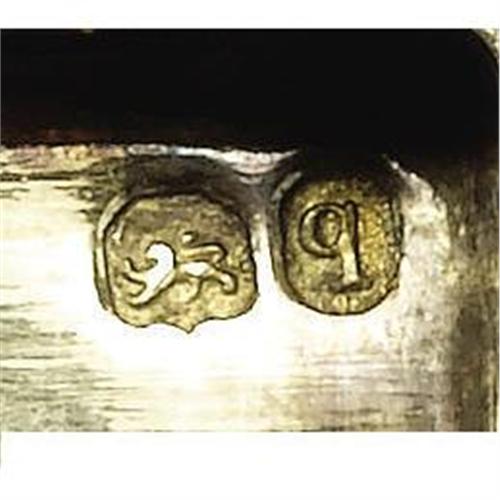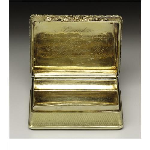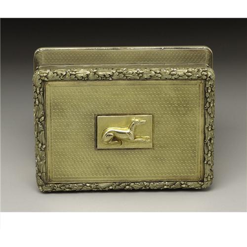 <B>A William IV Gold Table Top Snuff Box</B></I><BR><BR>John Linnit, London, England<BR>1831<BR>22 carat gold<BR>Marks: (lion passant), (leopard's head), (monarch profile), <I>JL, q</B></I><BR>3.25 in. long, 6.29 troy ounces<BR><BR>Of rectangular form with waisted sides; all over engine turned ground, green gold cast leaf border surrounding top, rose gold cast thistle and leaf latch. The top surmounted by a relief plaque of a greyhound. Interior of lid inscribed: <I>Presented to, Lt. Coll. James Sherriff, By the Officers of the, Bombay European Reg., as a token of their esteem and regard, January 28th, 1831</B></I>.