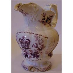 A William IV & Queen Adelaide Coronation Jug, with puce transfer  printed decoration (large chip) 17 cm  See illustration £20-40
