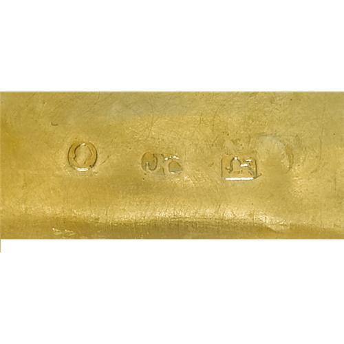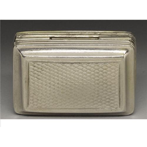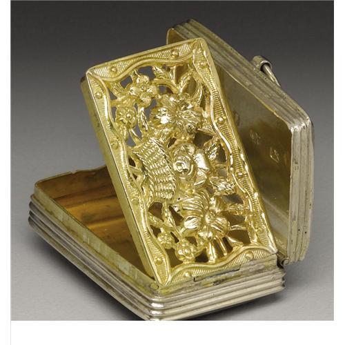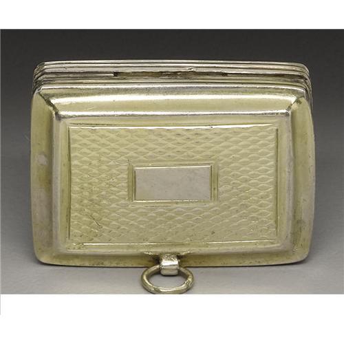 <B>A William IV Silver Gilt Vinaigrette</B></I><BR><BR>Unknown maker, Birmingham, England<BR>1830-31<BR>Silver gilt<BR>Marks: (lion passant), (anchor), (monarch profile), <I>JC, G</B></I><BR>1.12 in. long, .36 troy ounces<BR><BR>Of rectangular form with engine turned decoration to top and bottom, with rectangular reserve to top, reeded sides; pierced floral bouquet within basket grill.1 <BR><BR><B>Condition Report:</B> Normal signs of wear as appropriate with age. Significant loss to gilding on exterior. Interior regilded.