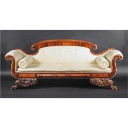 A William IV mahogany scroll end settee, the arched scrolling top rail above a padded back, scrolling padded arms and cushion seat with moulded apron, standing on acanthus carved lion paw feet, 215cm wide £600-800