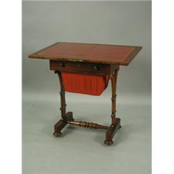 A William IV mahogany work table with a fold over top, frieze drawer and work basket on carved...