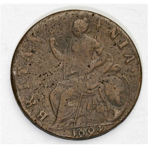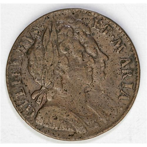 <B>A William and Mary pair as follows:</B></I> Sixpence 1693, S-3438, VF with a small dig on the obverse; and a Halfpenny 1694, S-3452, Fine with the small pits often seen on these pieces. <B>A sold as is, no return lot.</B></I>